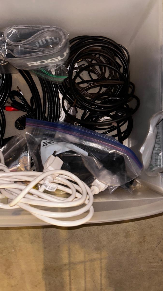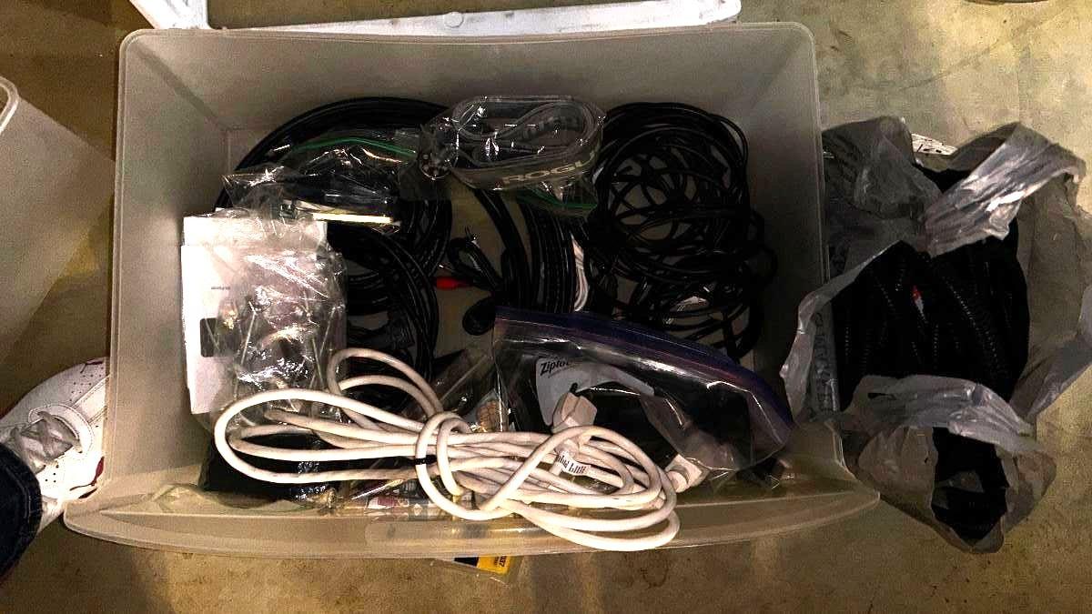 BOX OF MISC CORDS, HDMI, EXTENSION, CABLE AUXILIARY AND A LARGE BAG OR CORD COVER