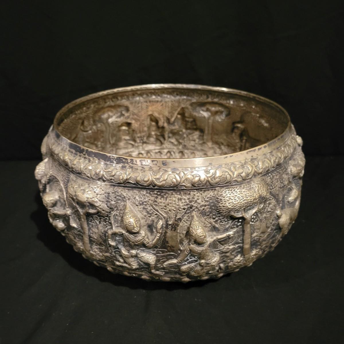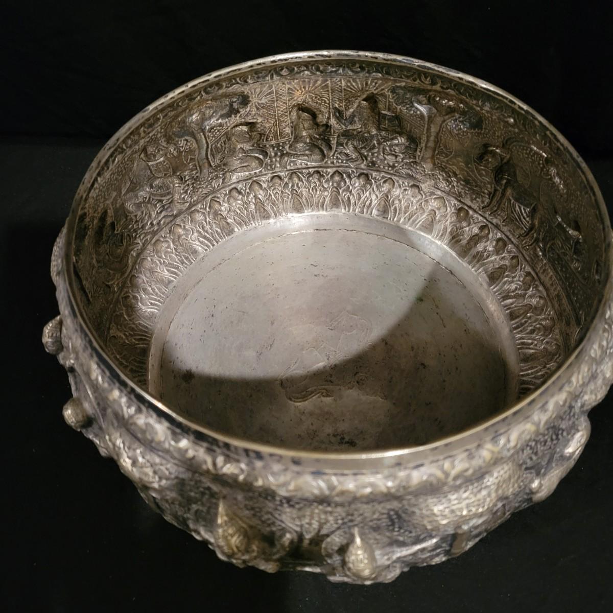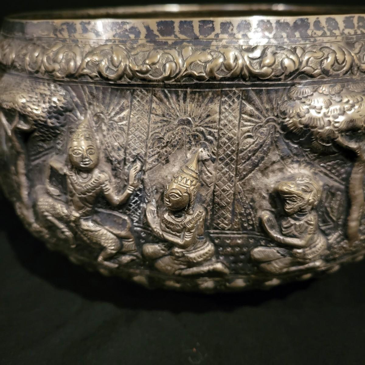 A large silver metal bowl that is embossed and chased. It is in a Burmese style. It measures approximately 10"D x 6"H. Shipping available