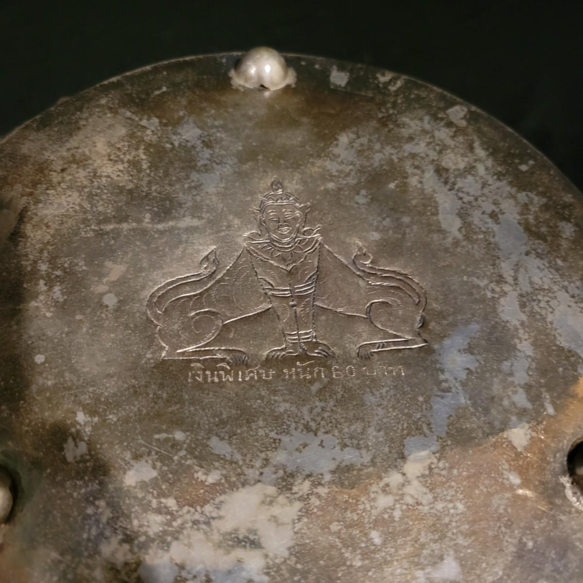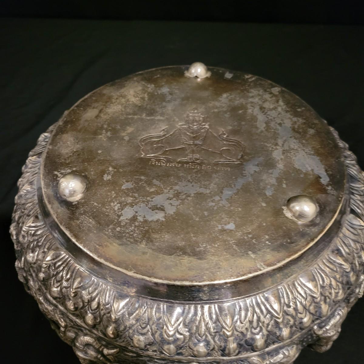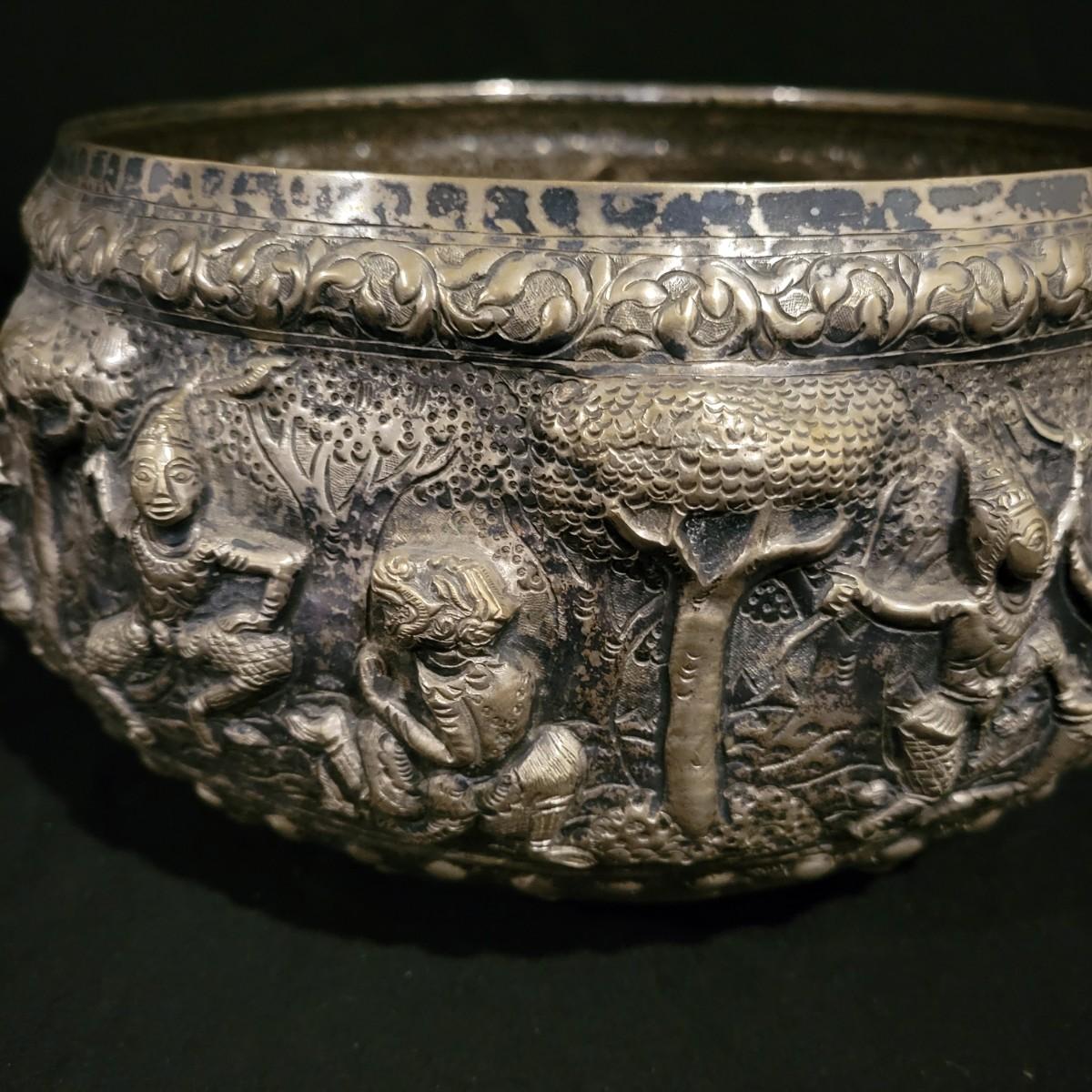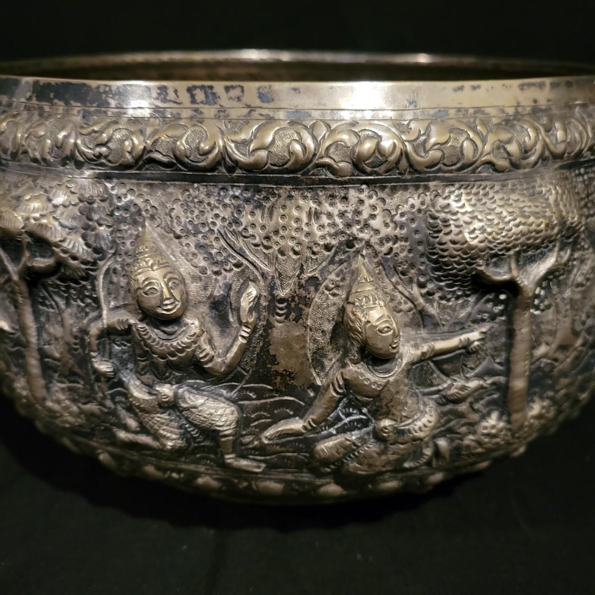 A large silver metal bowl that is embossed and chased. It is in a Burmese style. It measures approximately 10"D x 6"H. Shipping available