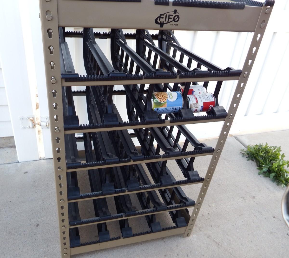 42 inches tall, 24x24 inches on sides. Holders can be adjusted to fit different size cans. Great for food storage. Cans not included.