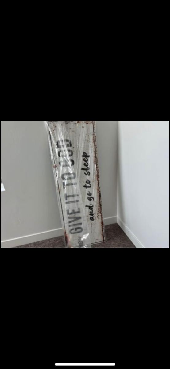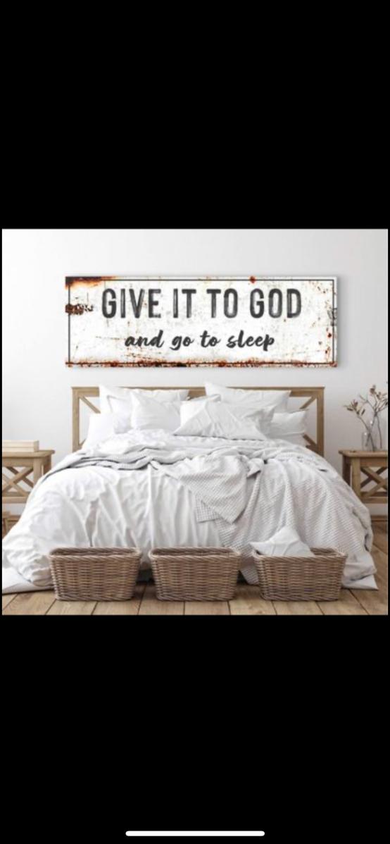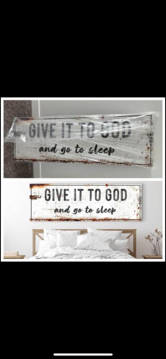 Give It To God and go to sleep. Brand new canvas wall hanging, wall decor, bedroom decor. Never been taken out of plastic. Bought for new house and now changed my mind. Perfect condition.