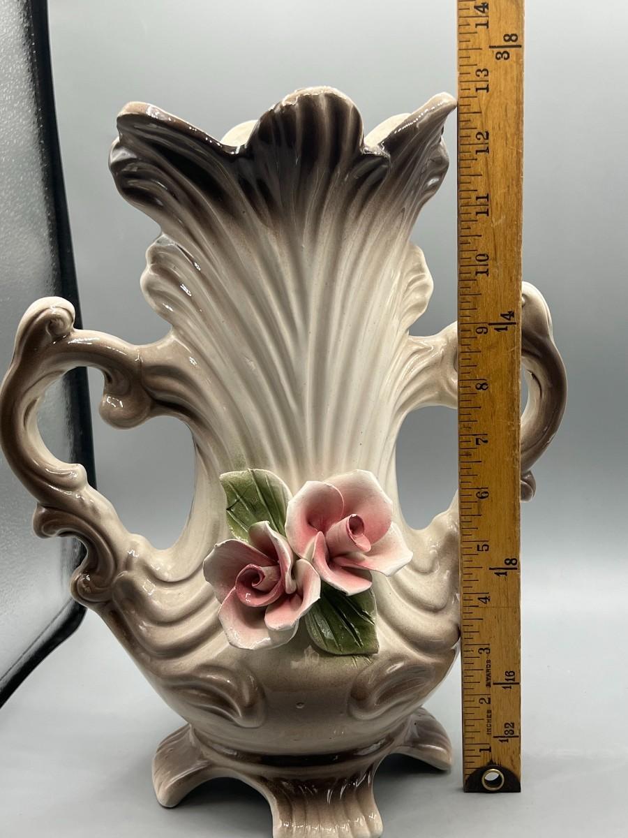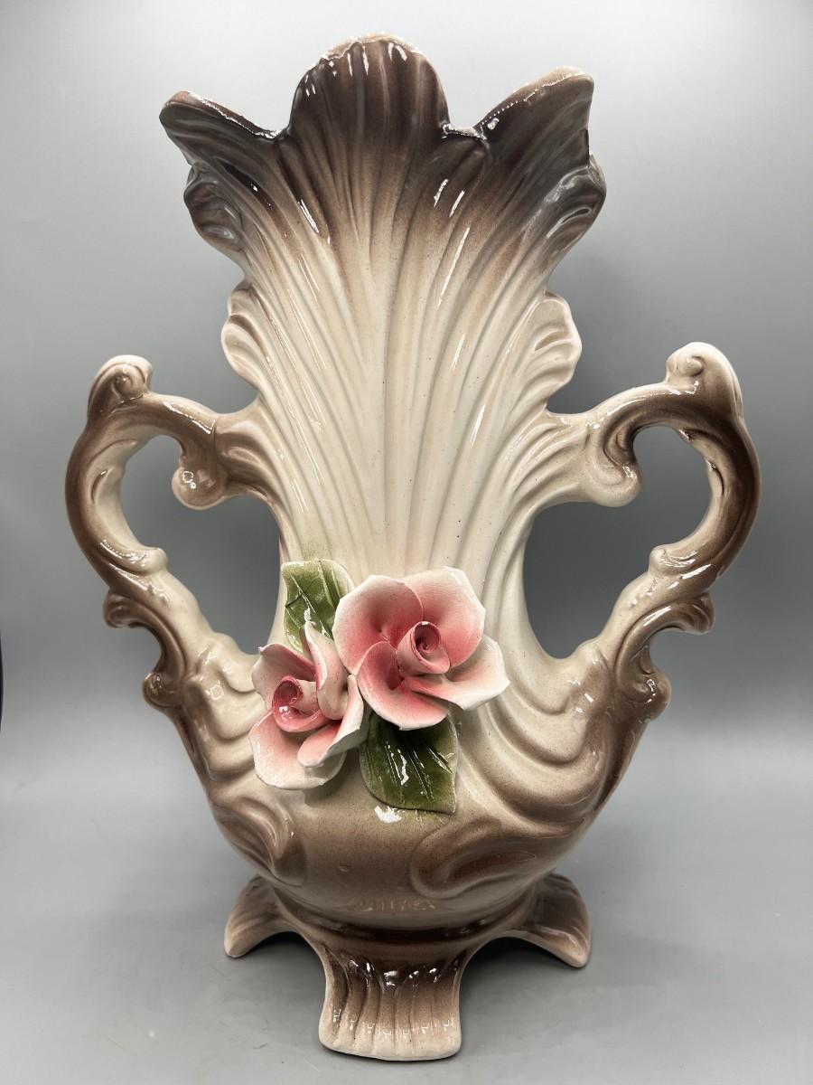 Large Capodimonte Double Handle Vase Urn with Pink Roses. In good condition. very tiny chipping. Over 12" size.