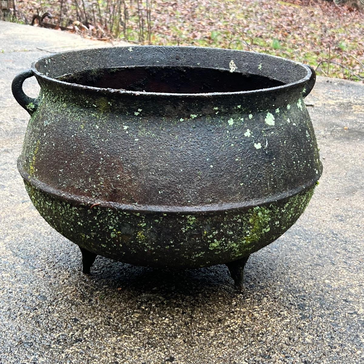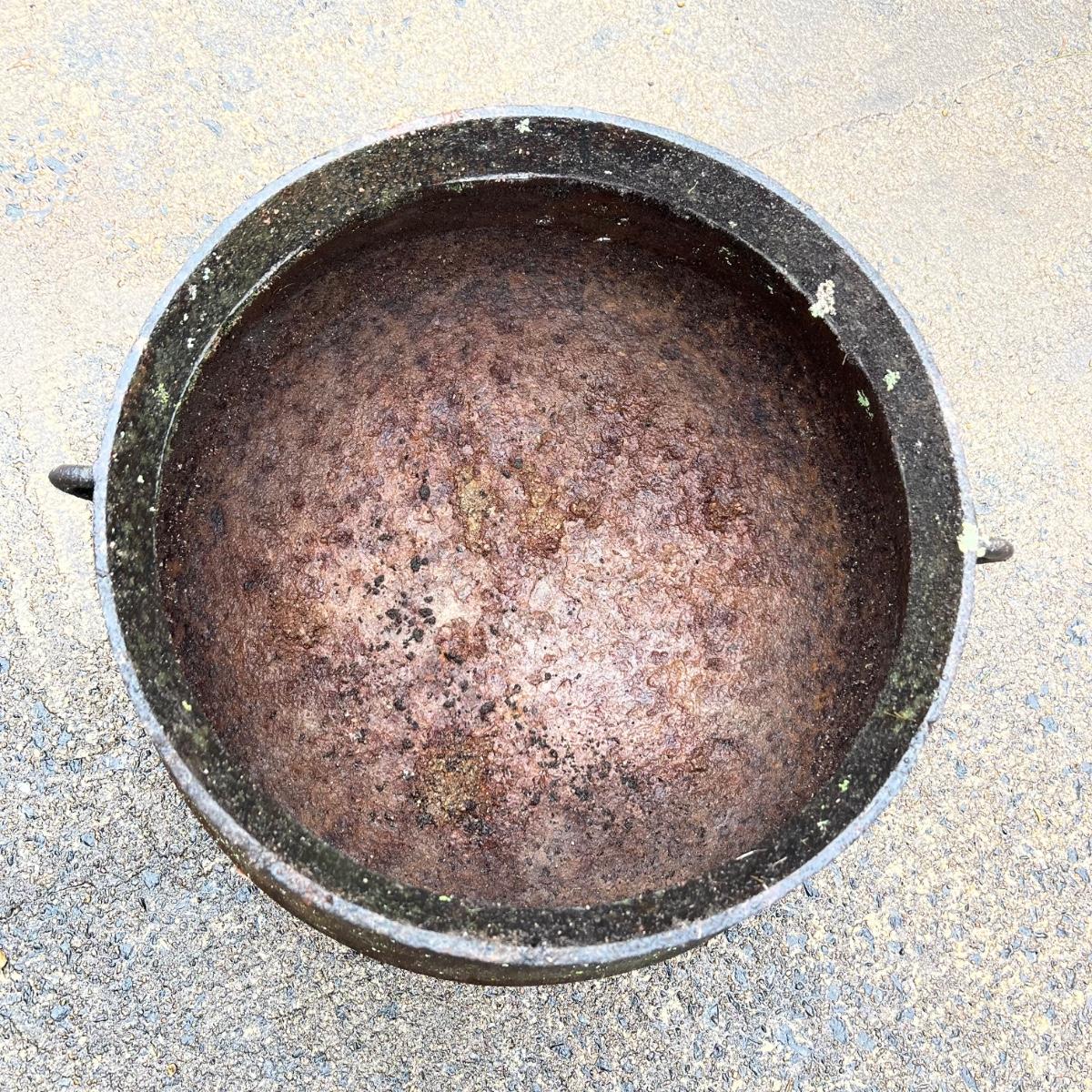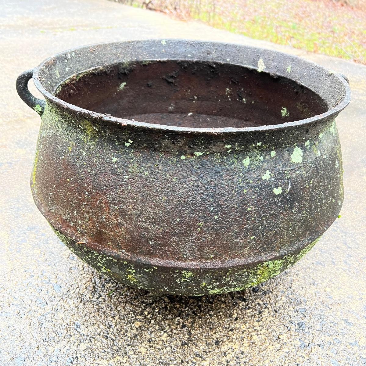 Lot features a cast iron cauldron pot that has a nice patina on it and measures approximately 21”D x 15”H. Local pick up only. Winning bidder must bring assistance to help move and load this item due to its weight and/or size.