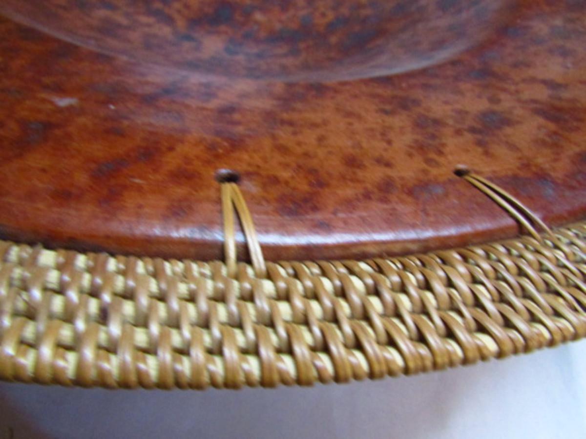 Large Centerpiece Bowl Pottery with Wicker Border (G). Wicker is woven through pierced edge of pottery center. Measures approx 22 inches in diameter. Please see all pictures- some of the woven border is bent upward and not sitting correctly.