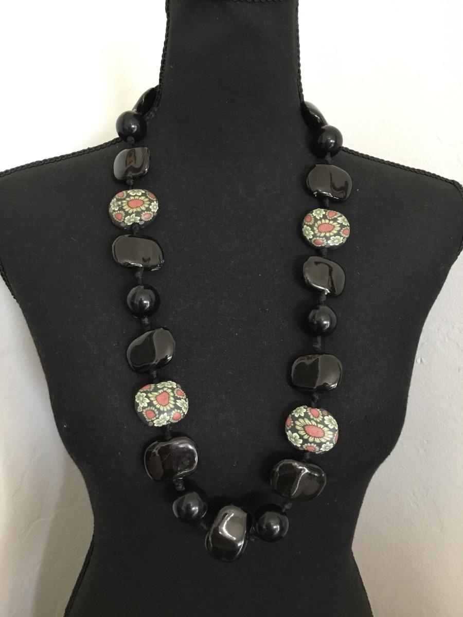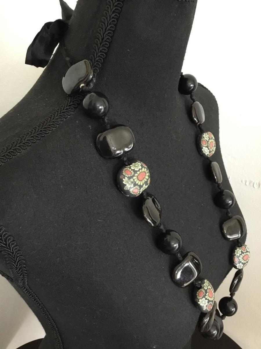 Large, ceramic bead statement, necklace Black satin bow tie