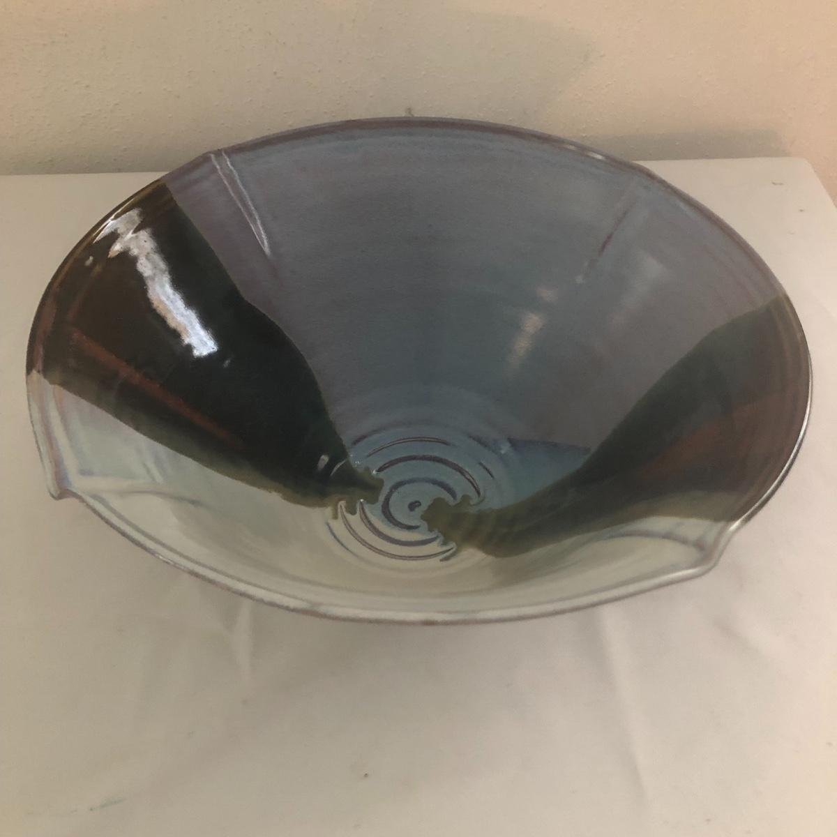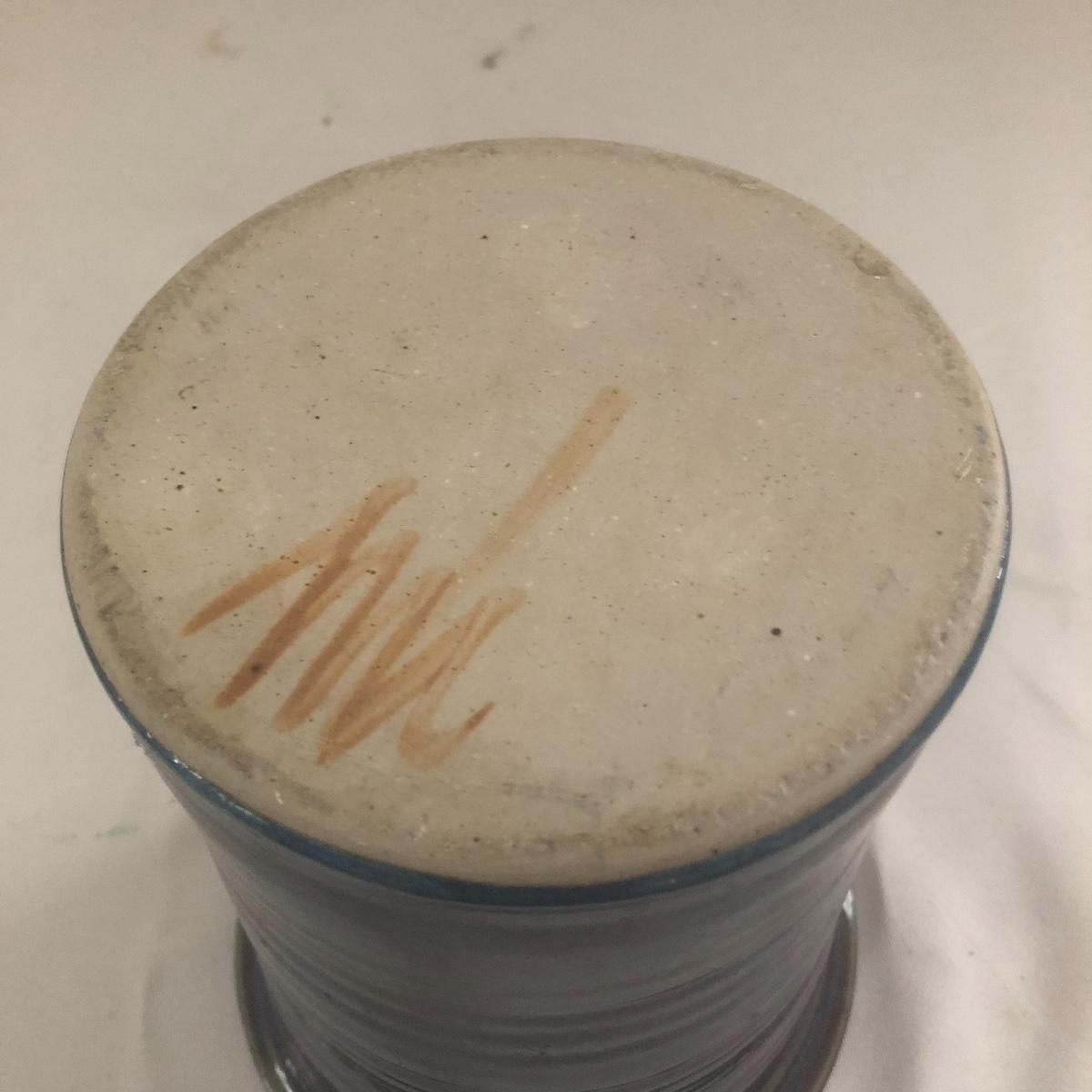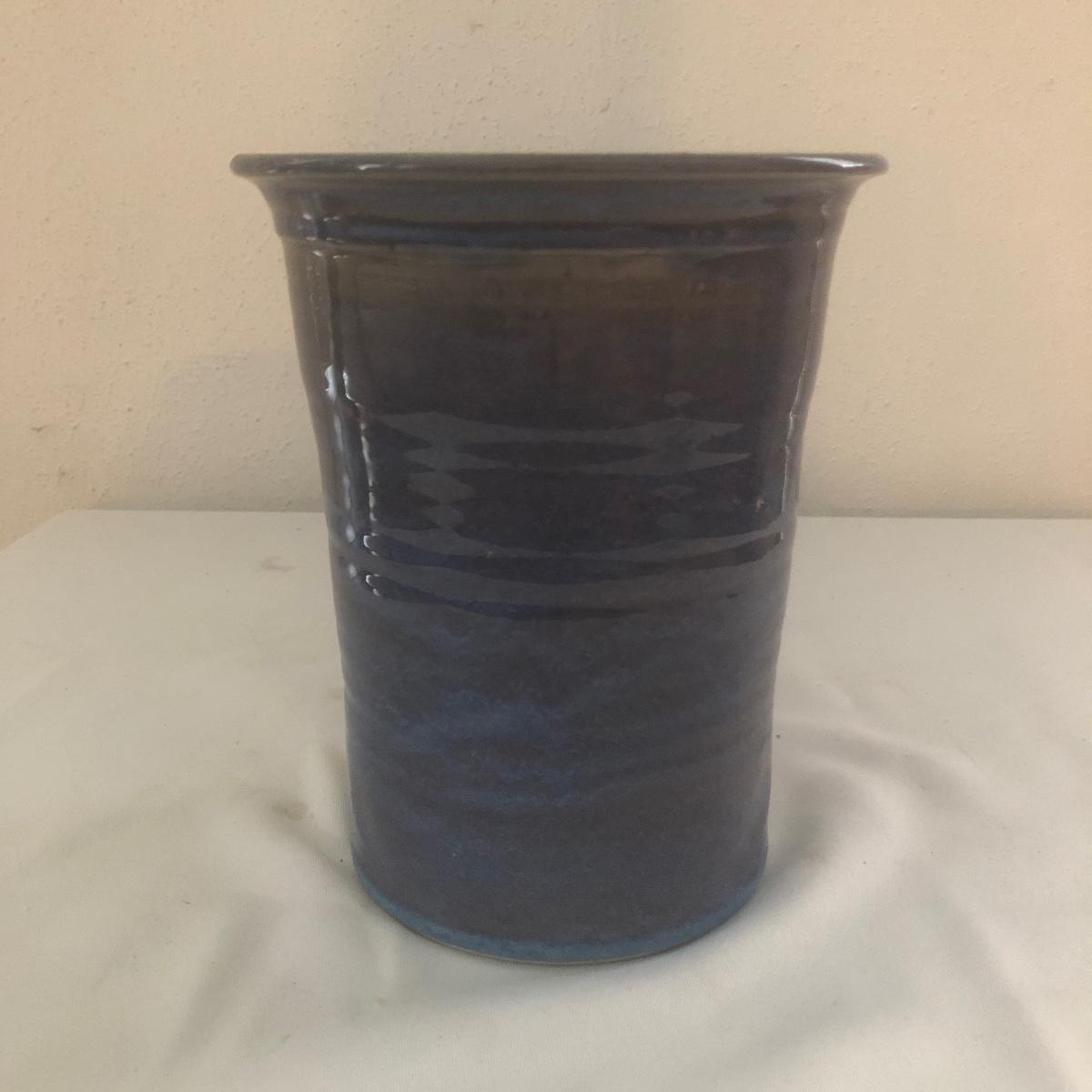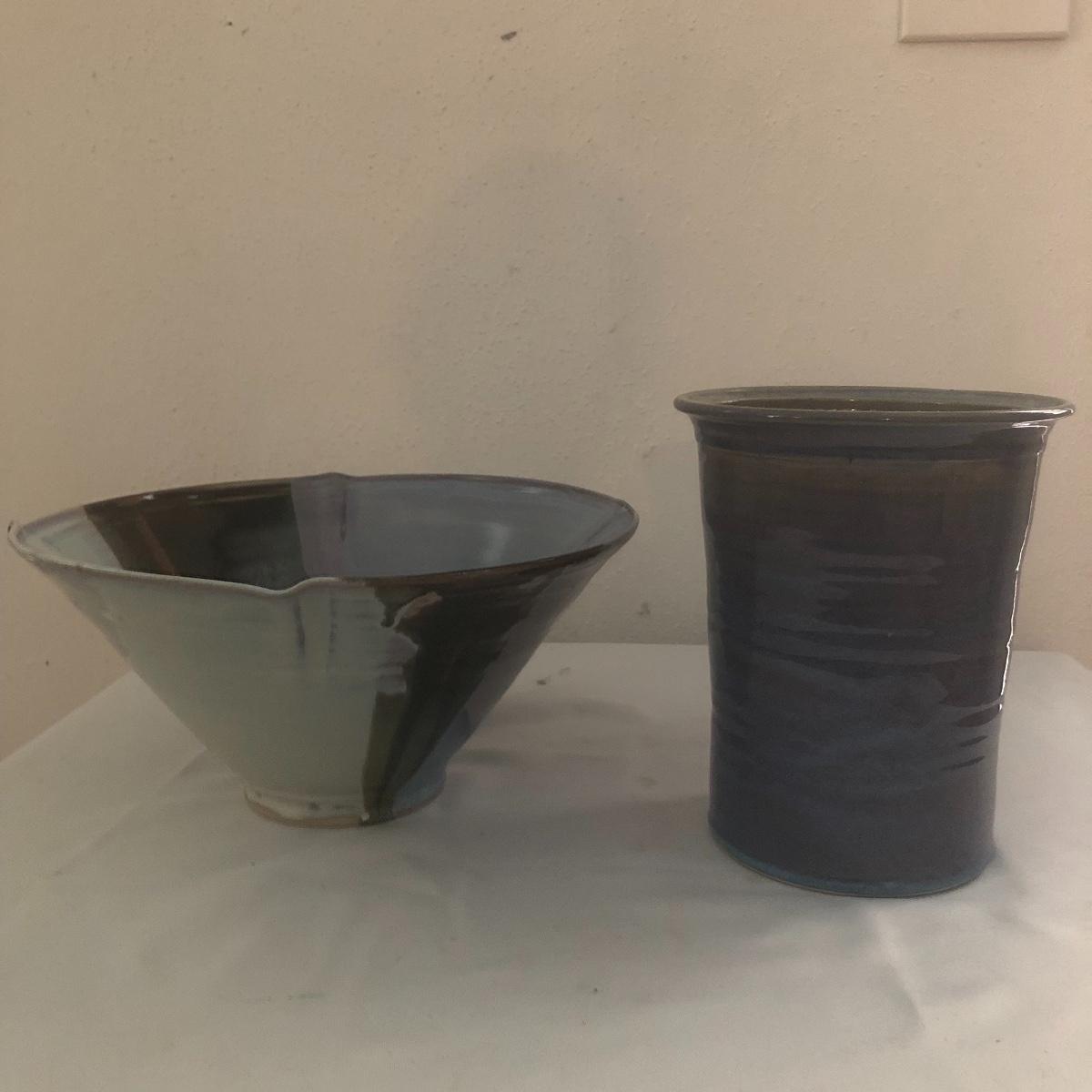This beautiful duo includes a large stunningly glazed bowl that measures 13.5” d x 7” tall and a tall signed ceramic container that would make a great utensil holder measuring 7.5” x 9.5”.