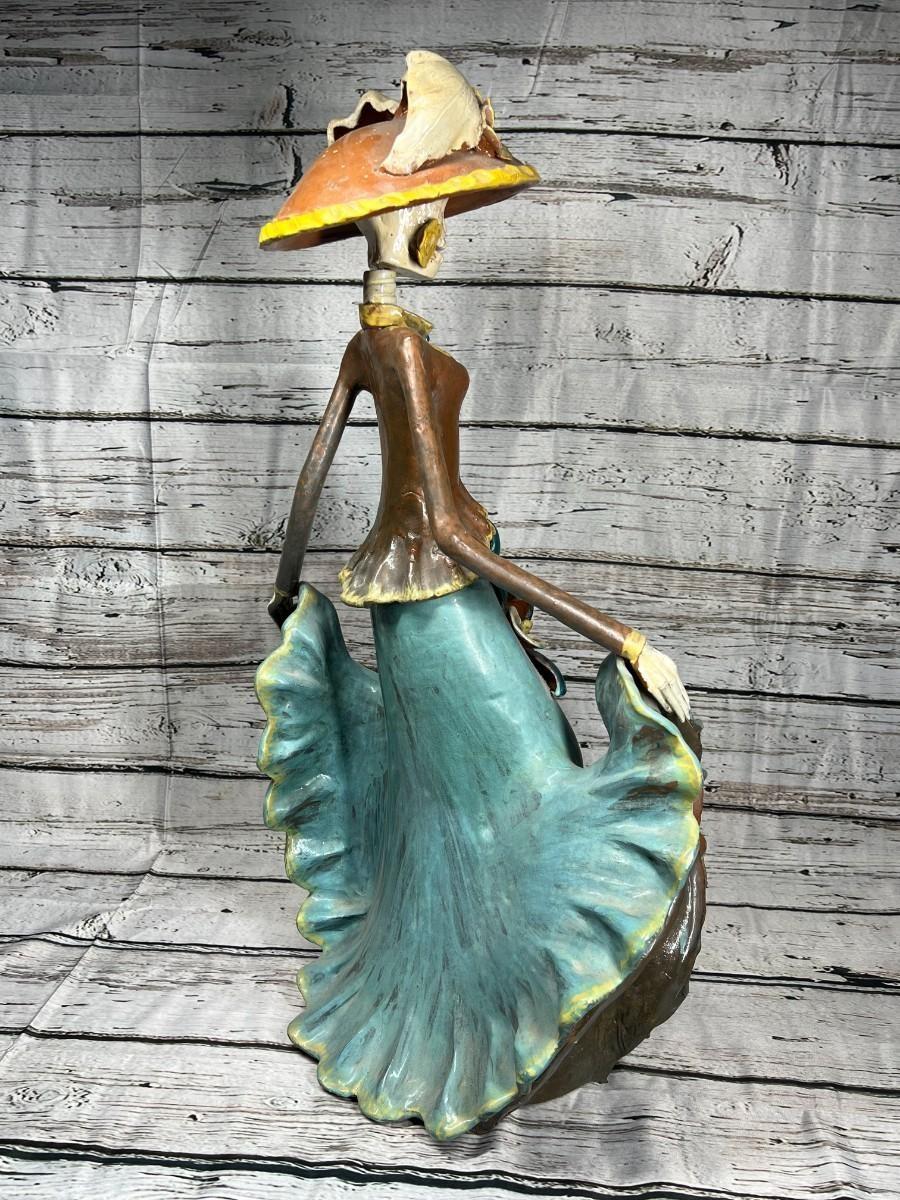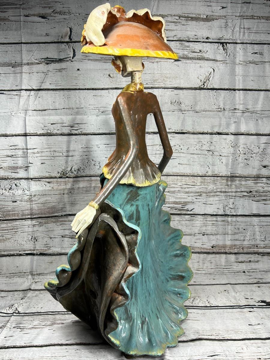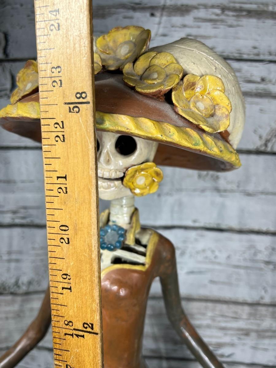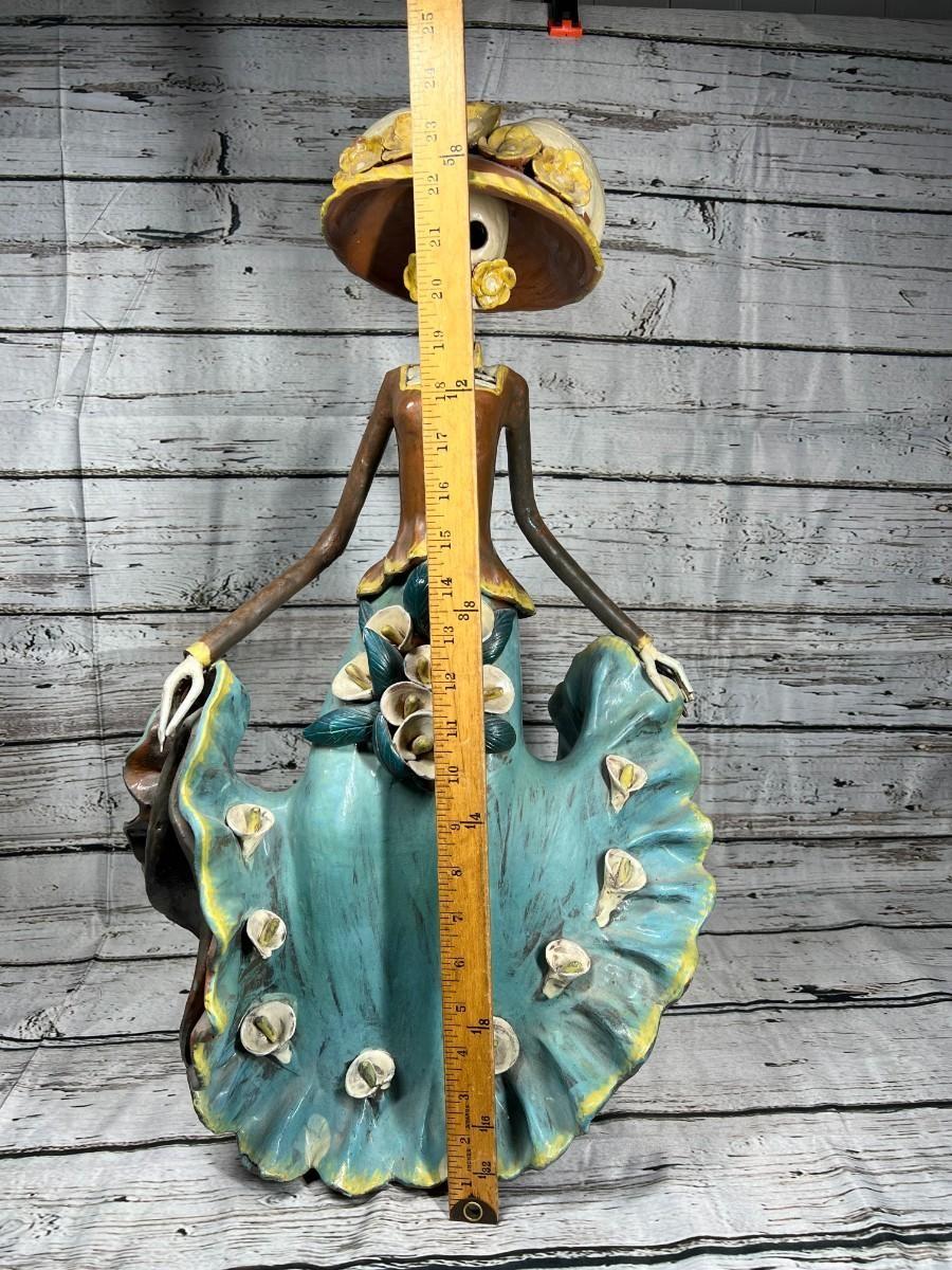 Large ceramic Dia de Los Muertos/ Day of the Dead skeleton figurine statue. Lady skeleton in floral hat and skirt. Stands about 24" tall. Displays nicely despite having some small damage to hand and on skirt. Head is removable, part of how it was made. See photos.