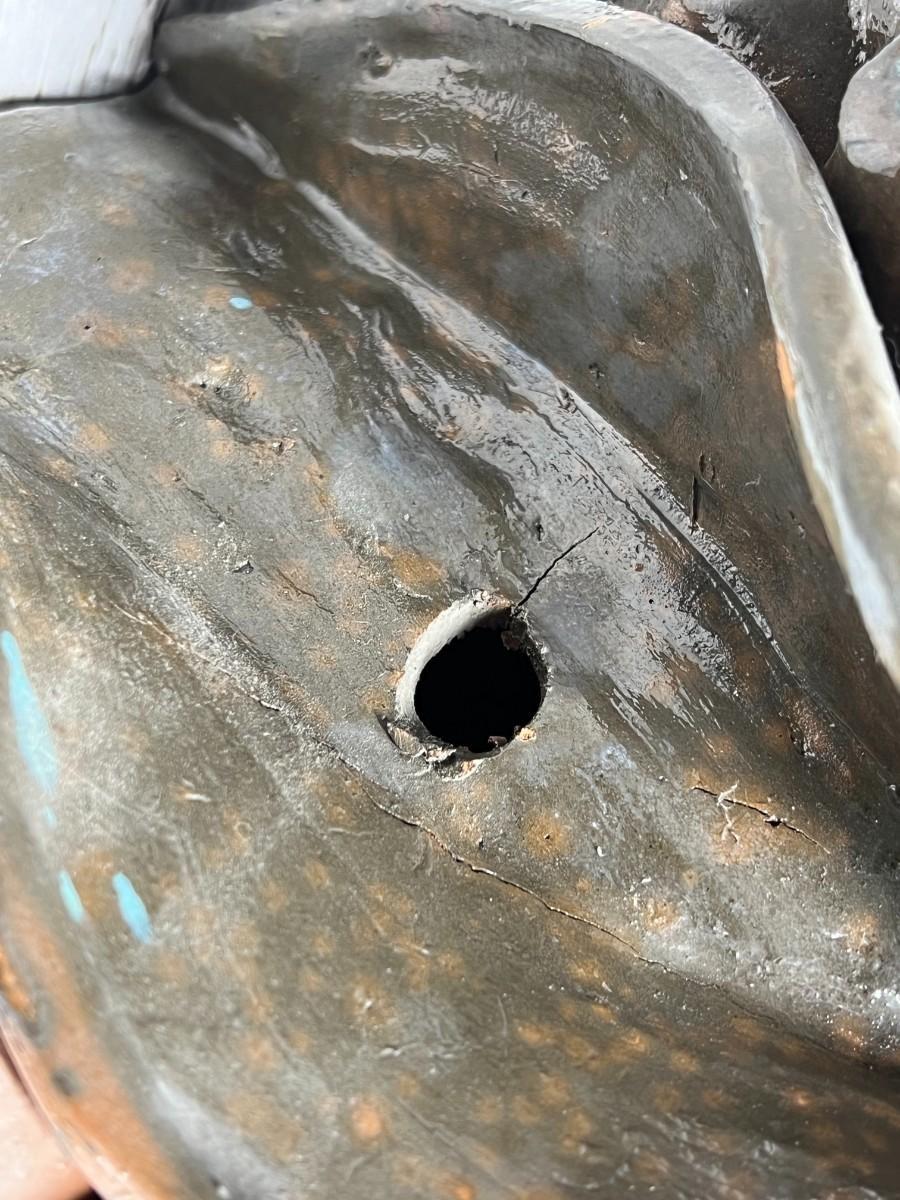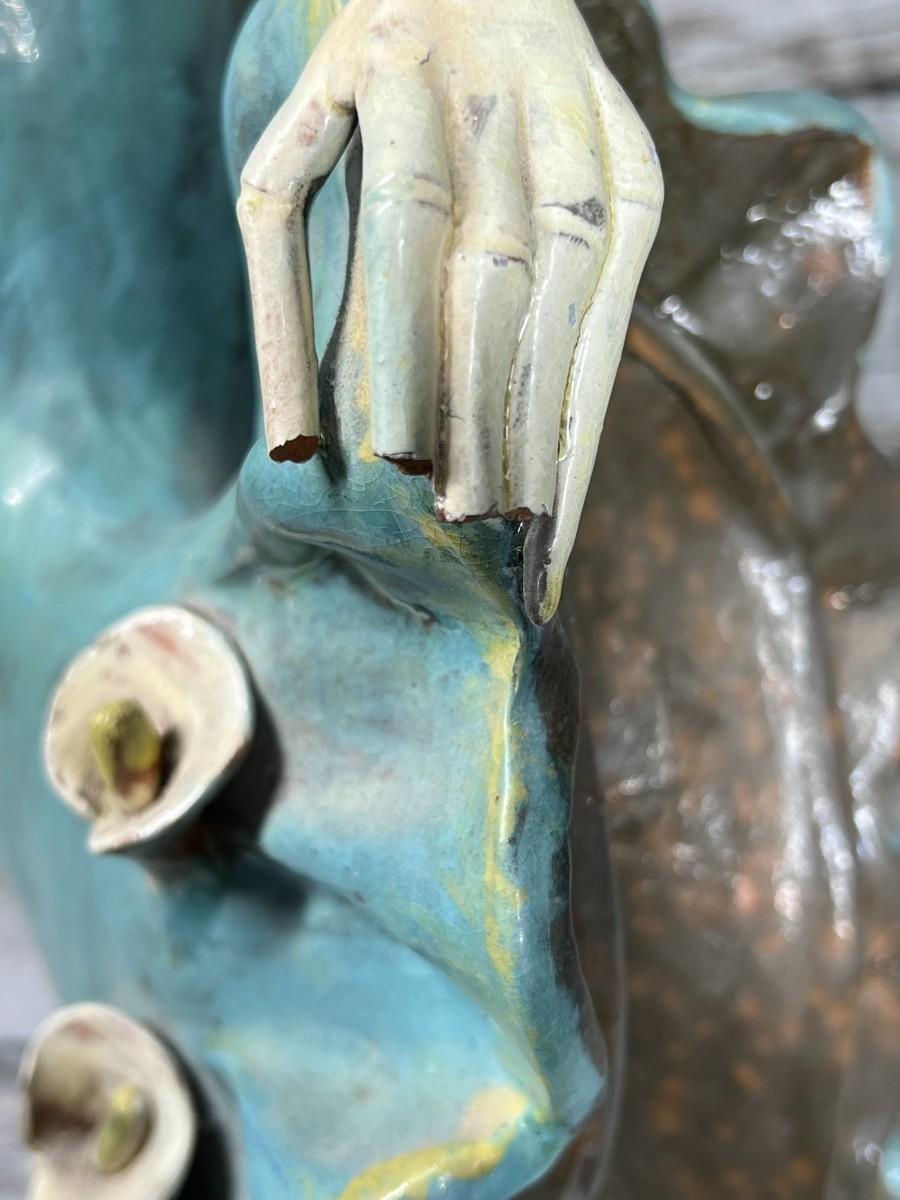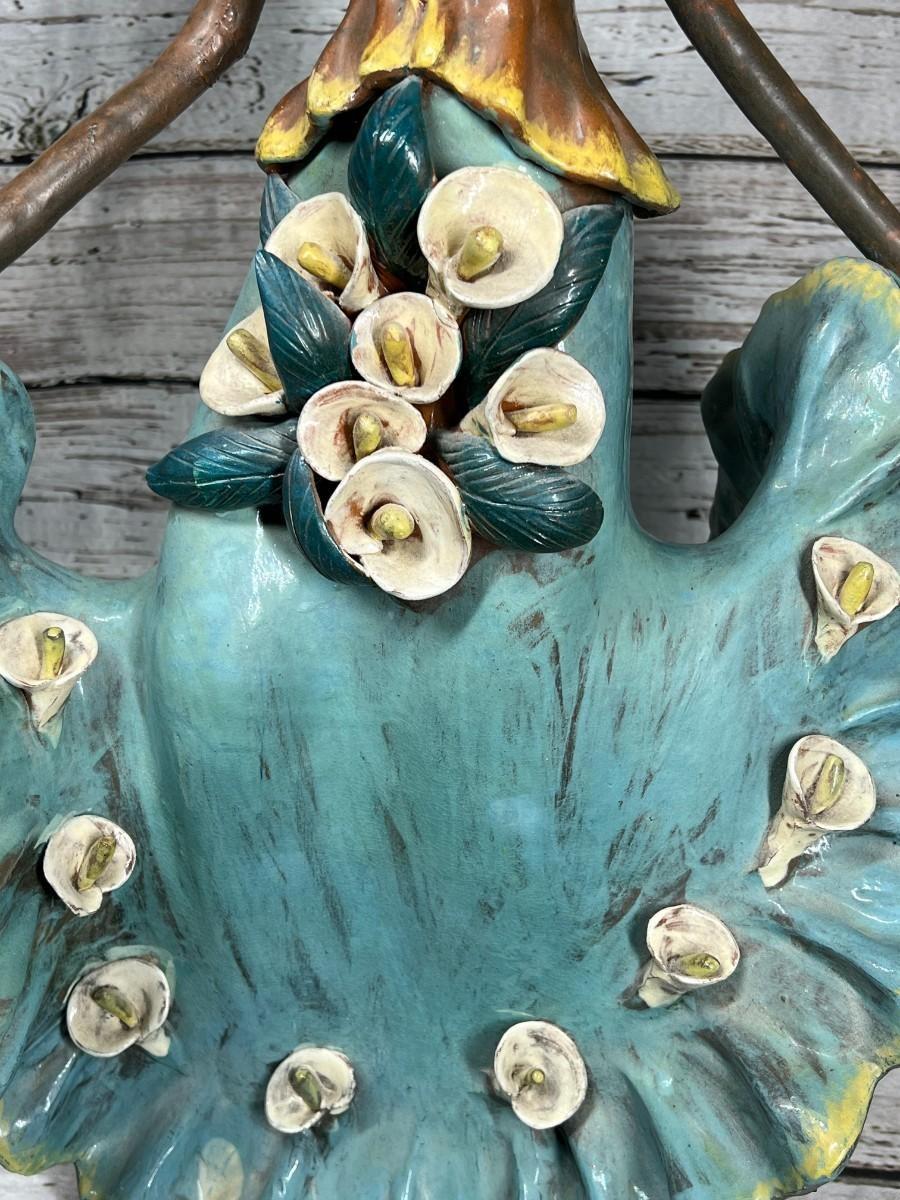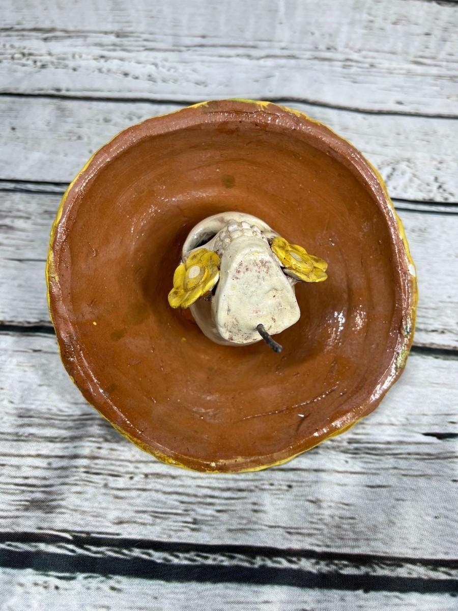Large ceramic Dia de Los Muertos/ Day of the Dead skeleton figurine statue. Lady skeleton in floral hat and skirt. Stands about 24" tall. Displays nicely despite having some small damage to hand and on skirt. Head is removable, part of how it was made. See photos.