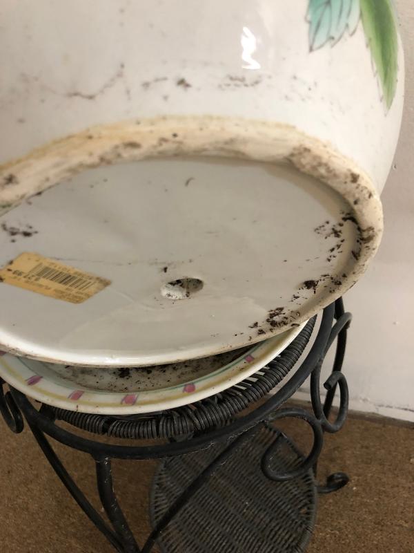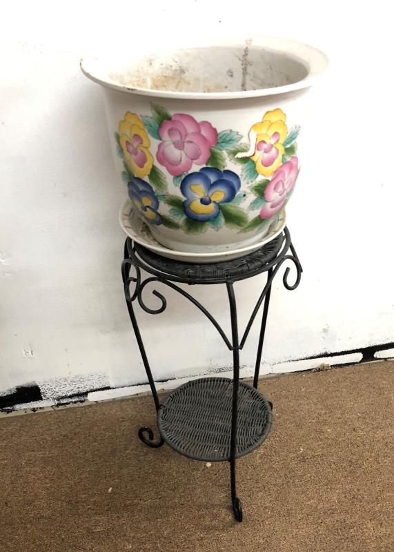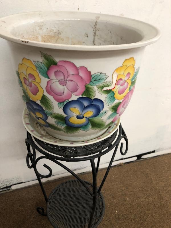 Here is a large floral flower pot or jardiniere and stand or small patio table...