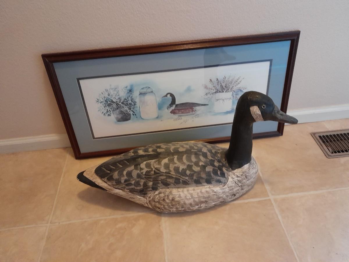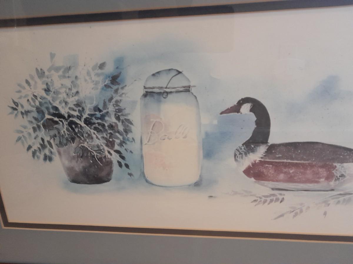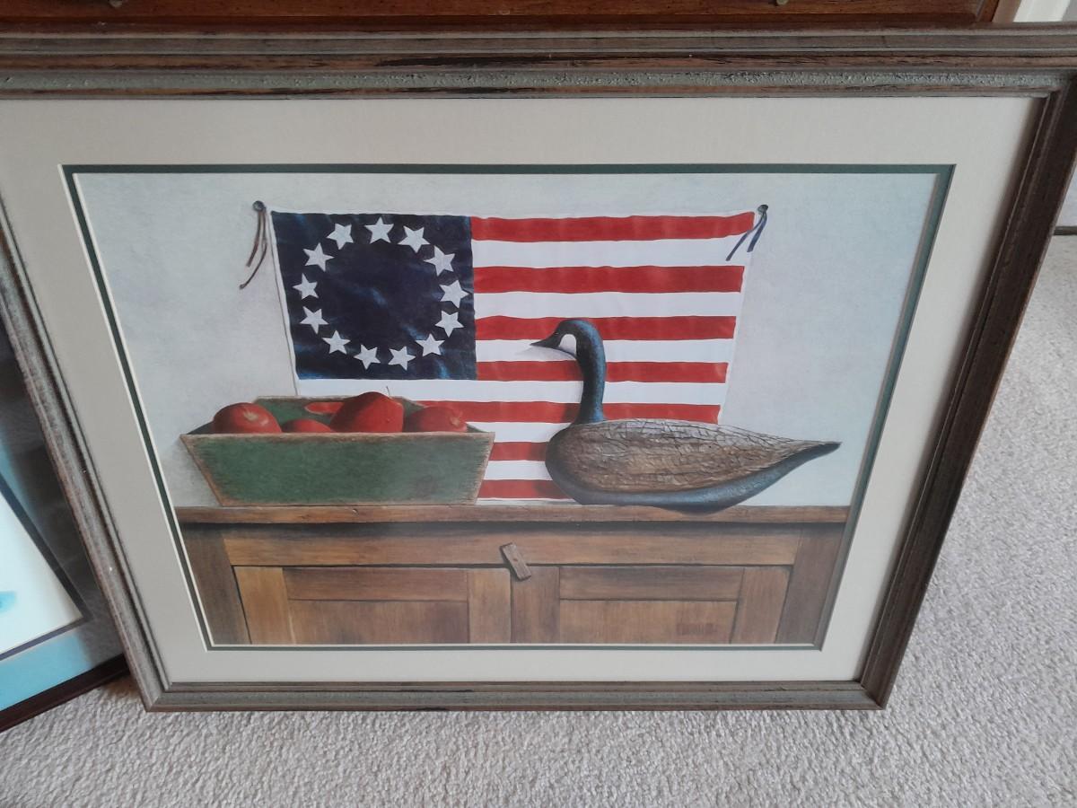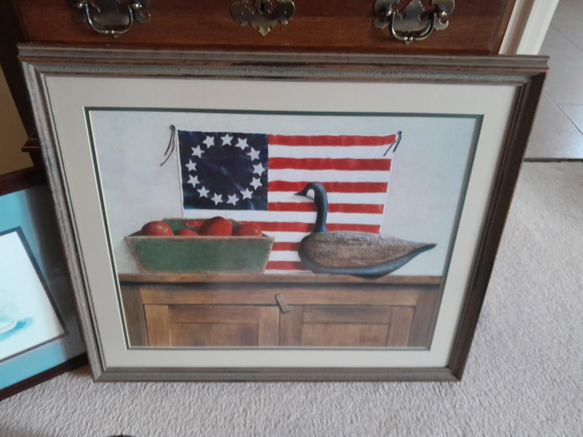 GOOSE AND AMERICAN FLAG PICTURE 26" X 22" PICTURE WITH GOOSE AND JAR IS 31" X 15" GOOSE IS CERAMIC AND IS 23" X 14"