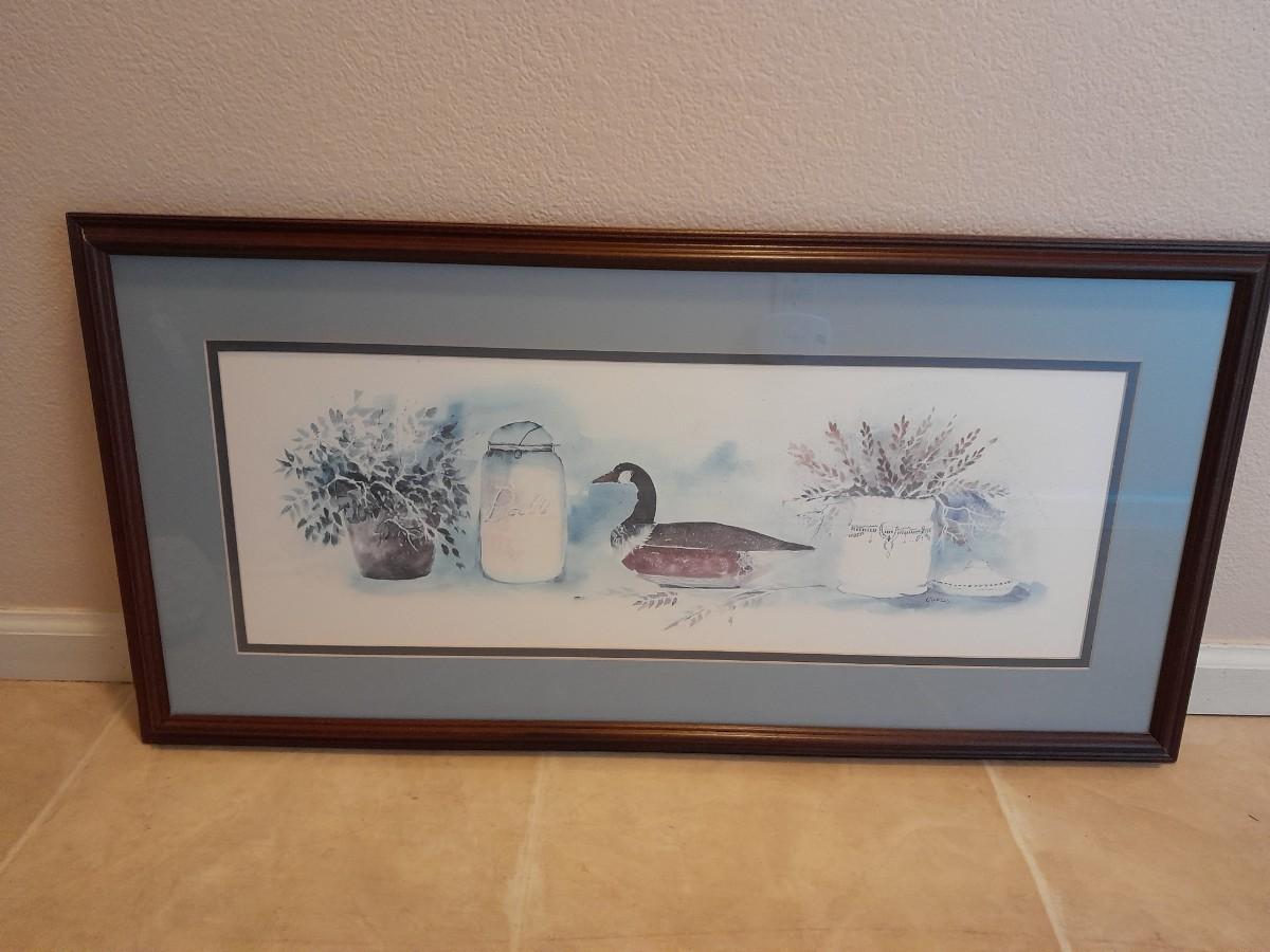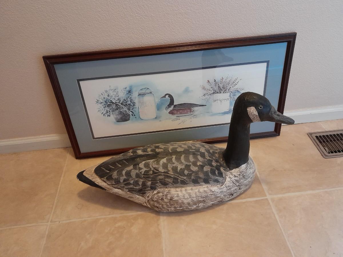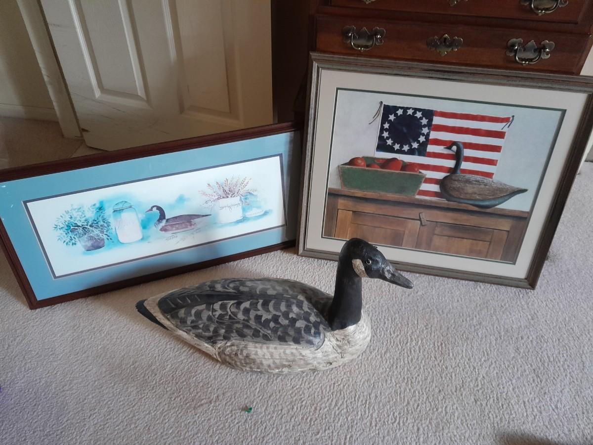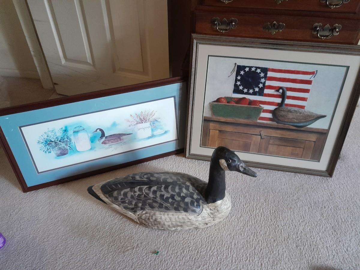 GOOSE AND AMERICAN FLAG PICTURE 26" X 22" PICTURE WITH GOOSE AND JAR IS 31" X 15" GOOSE IS CERAMIC AND IS 23" X 14"