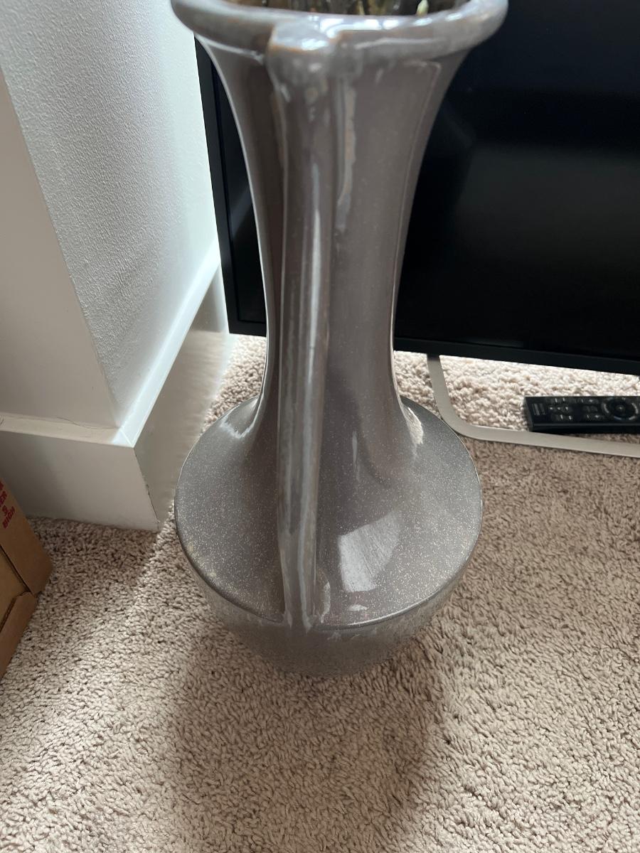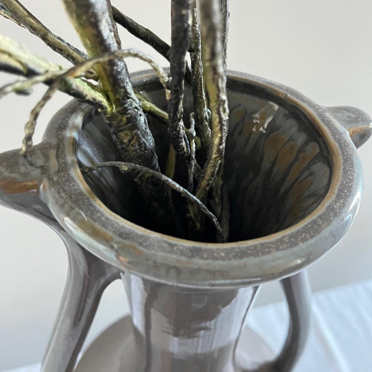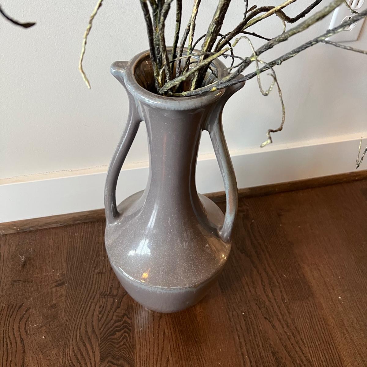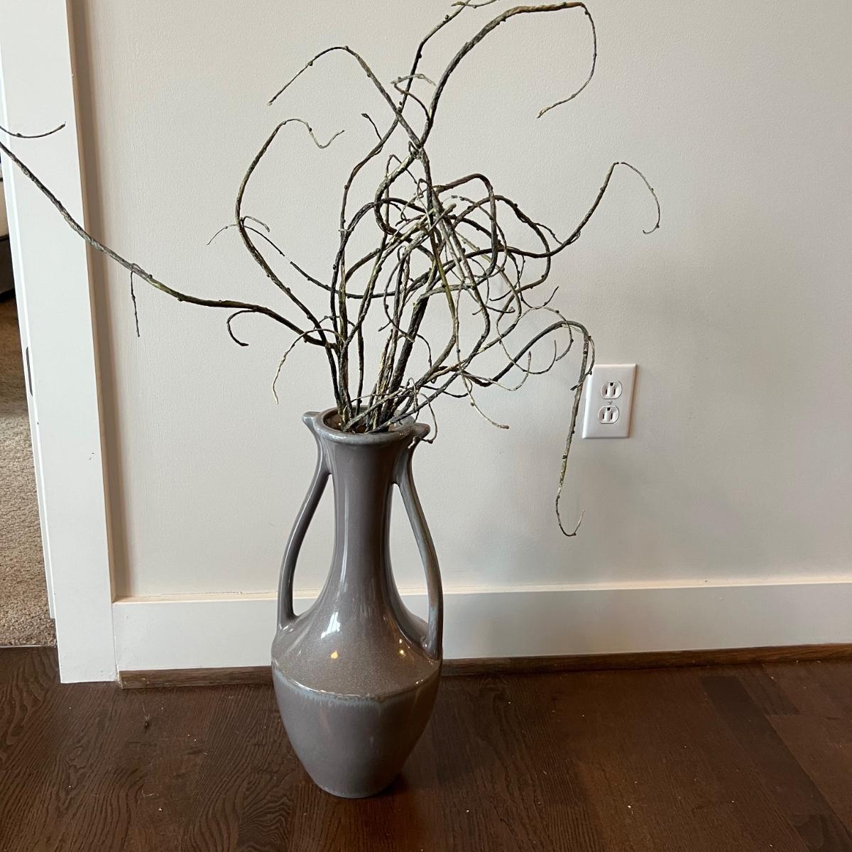 Lot includes a large ceramic rich grey colored vase with decorative faux willow branches. Vase is in very good condition and measures 9.5”D x 19.5” tall not including branches.