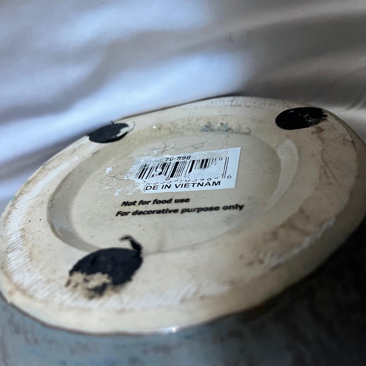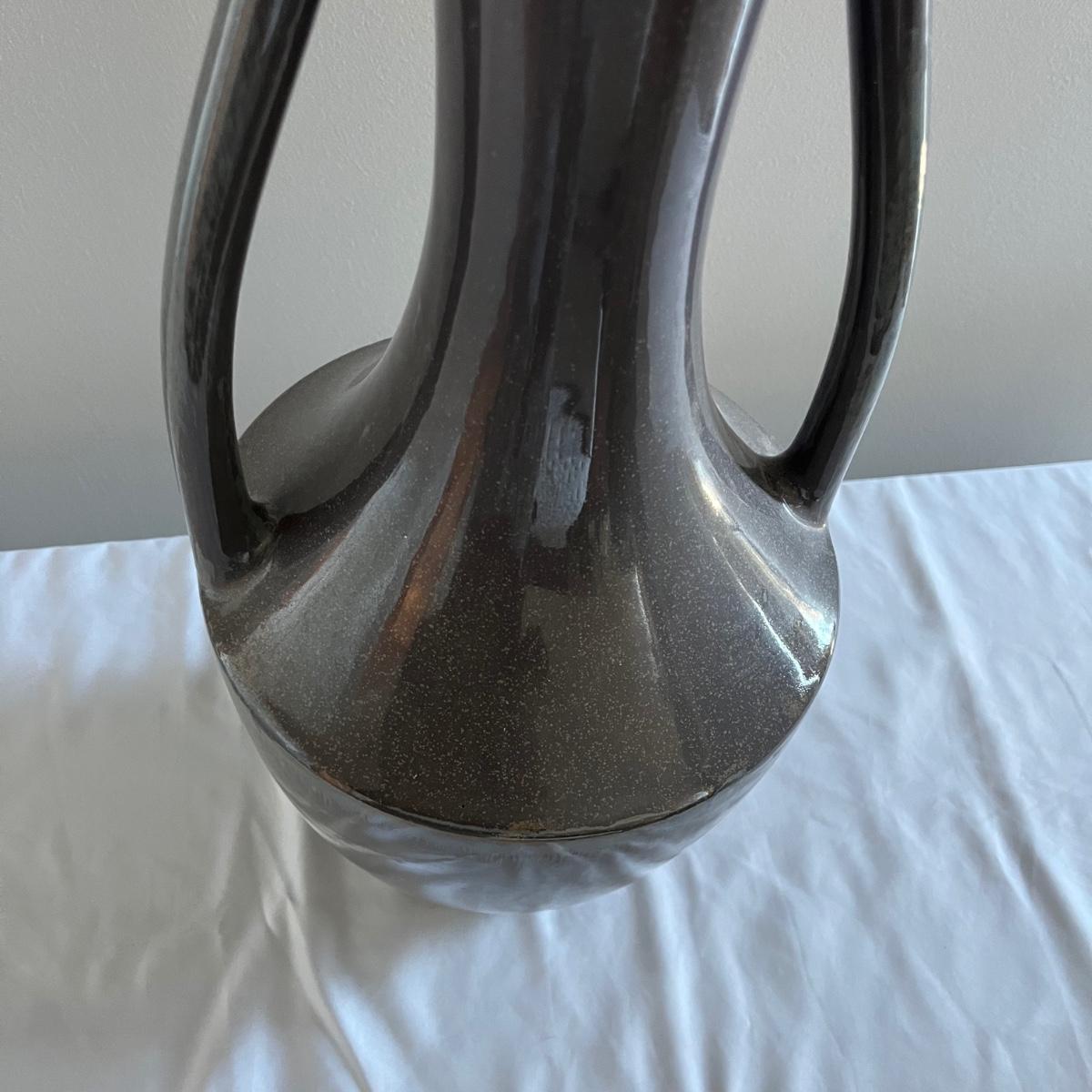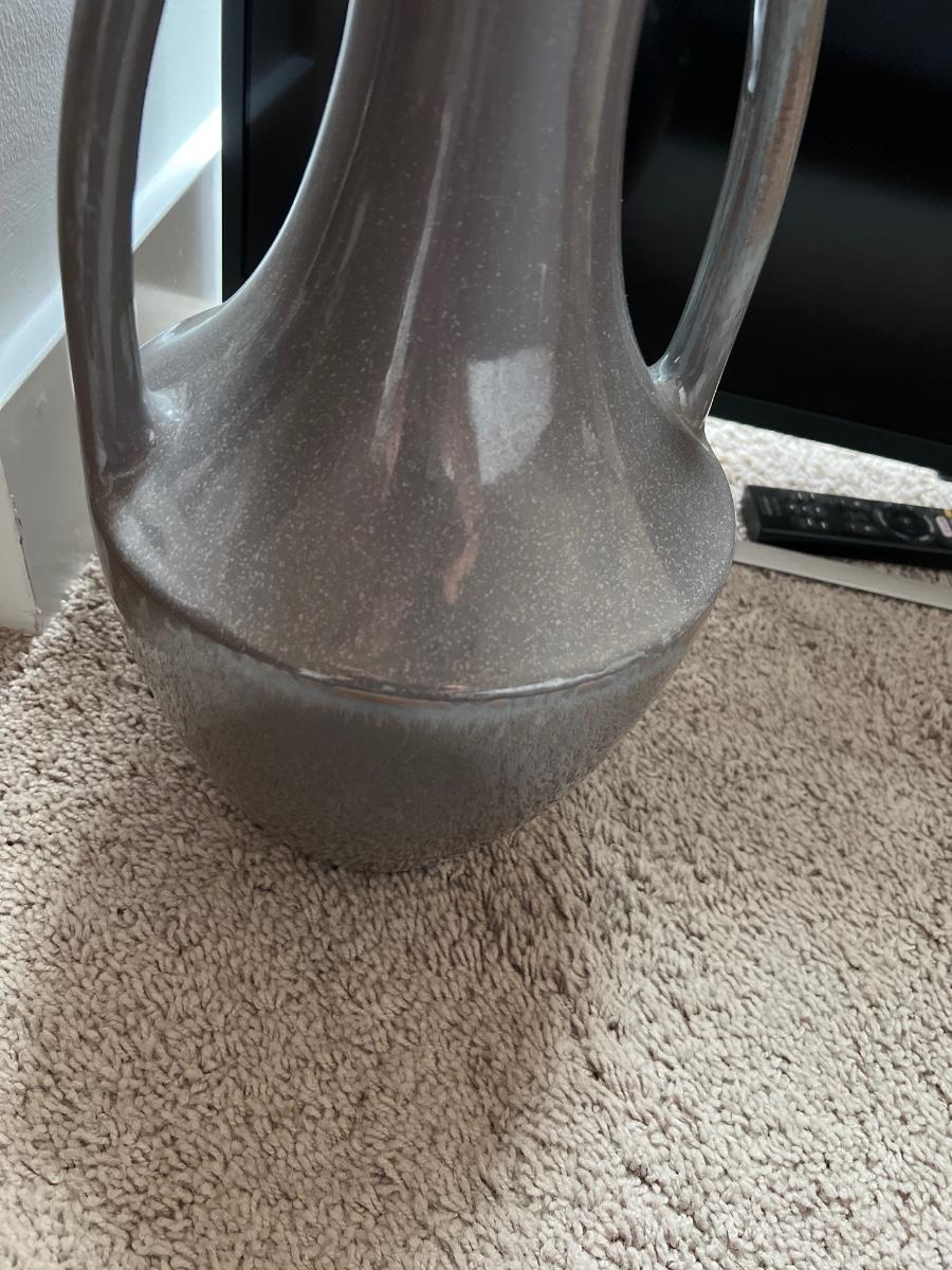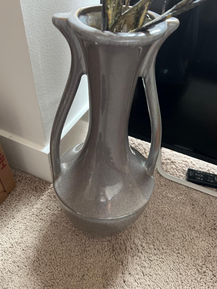 Lot includes a large ceramic rich grey colored vase with decorative faux willow branches. Vase is in very good condition and measures 9.5”D x 19.5” tall not including branches.