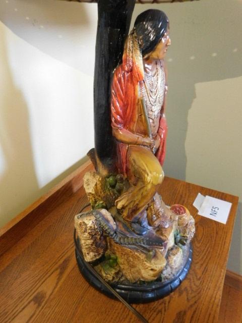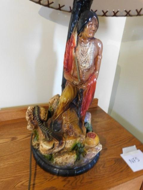 Large Chalkware Native American Brave Table Lamp with Shade 31" this item is in very good condition with nice matching shade with fringe cross stitching.