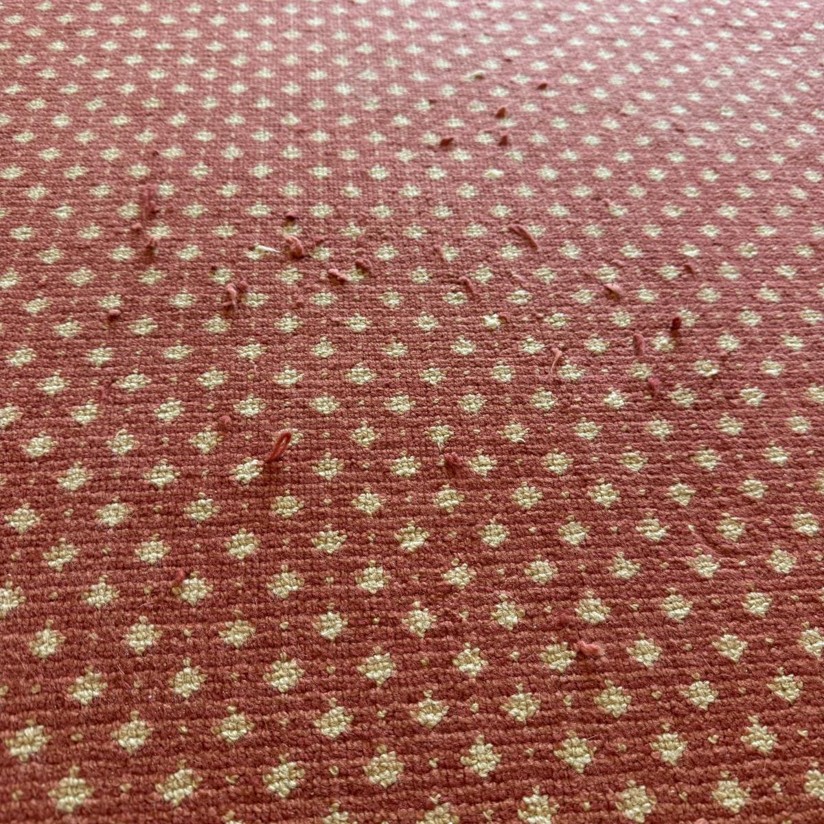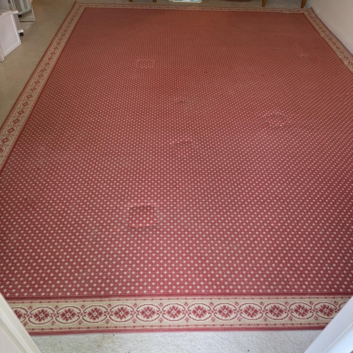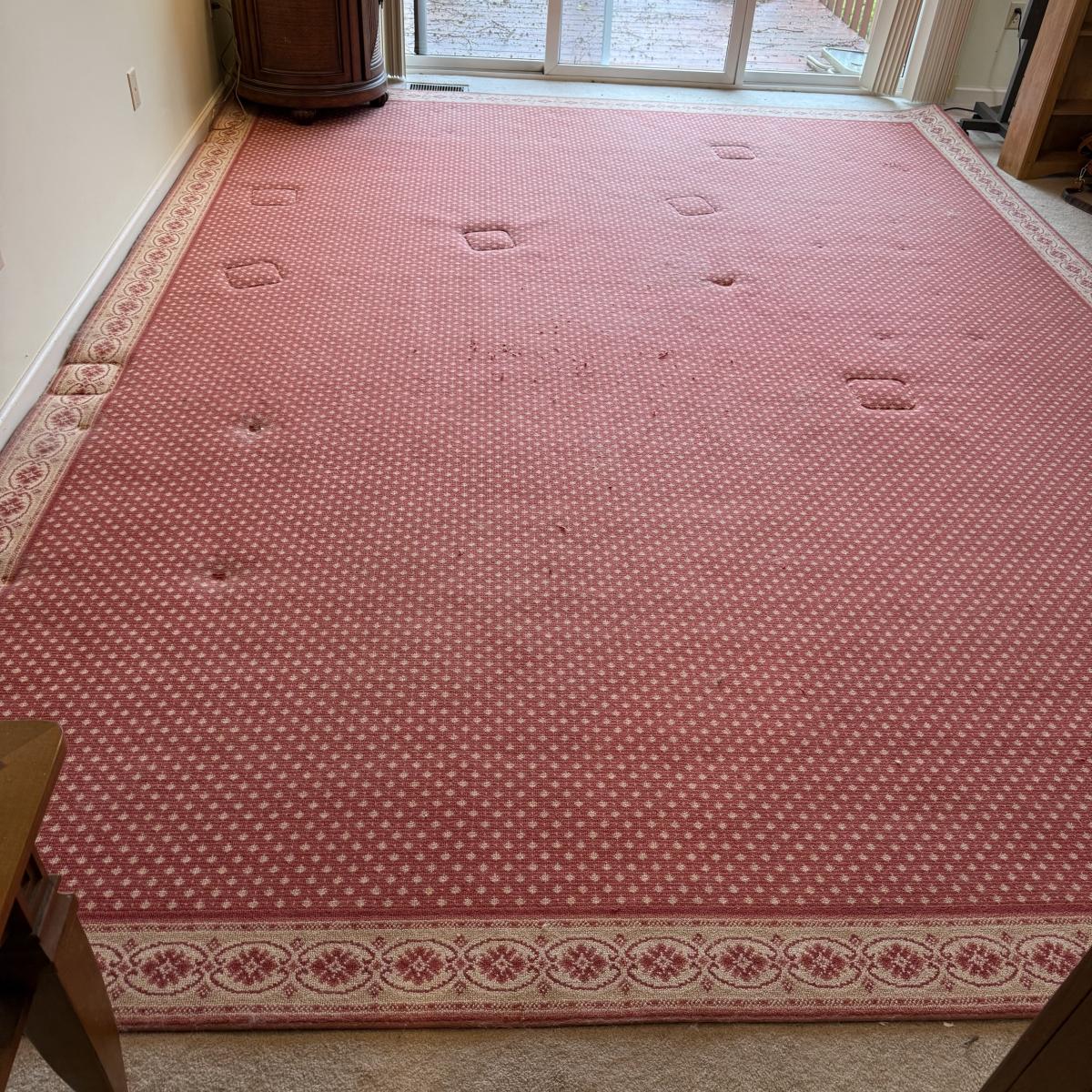 This lot contains a large area rug that has a light red and beige checker and a pretty floral boarder. This massive rug measures 14’ x 10’5”. There is some damage to the center of the rug where it has been pulled apart a bit and while there isn’t any visible stains there is some dog hair. The dents were from heavy furniture and should recover their shape with time. See pictures for details. Local pick up only. Winning bidder must bring assistance to help move and load this item due to its weight and/or size.