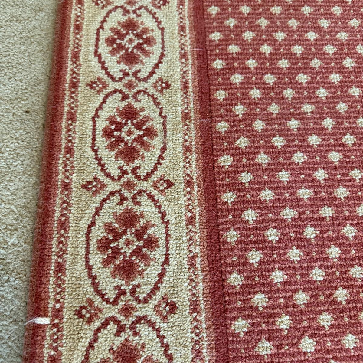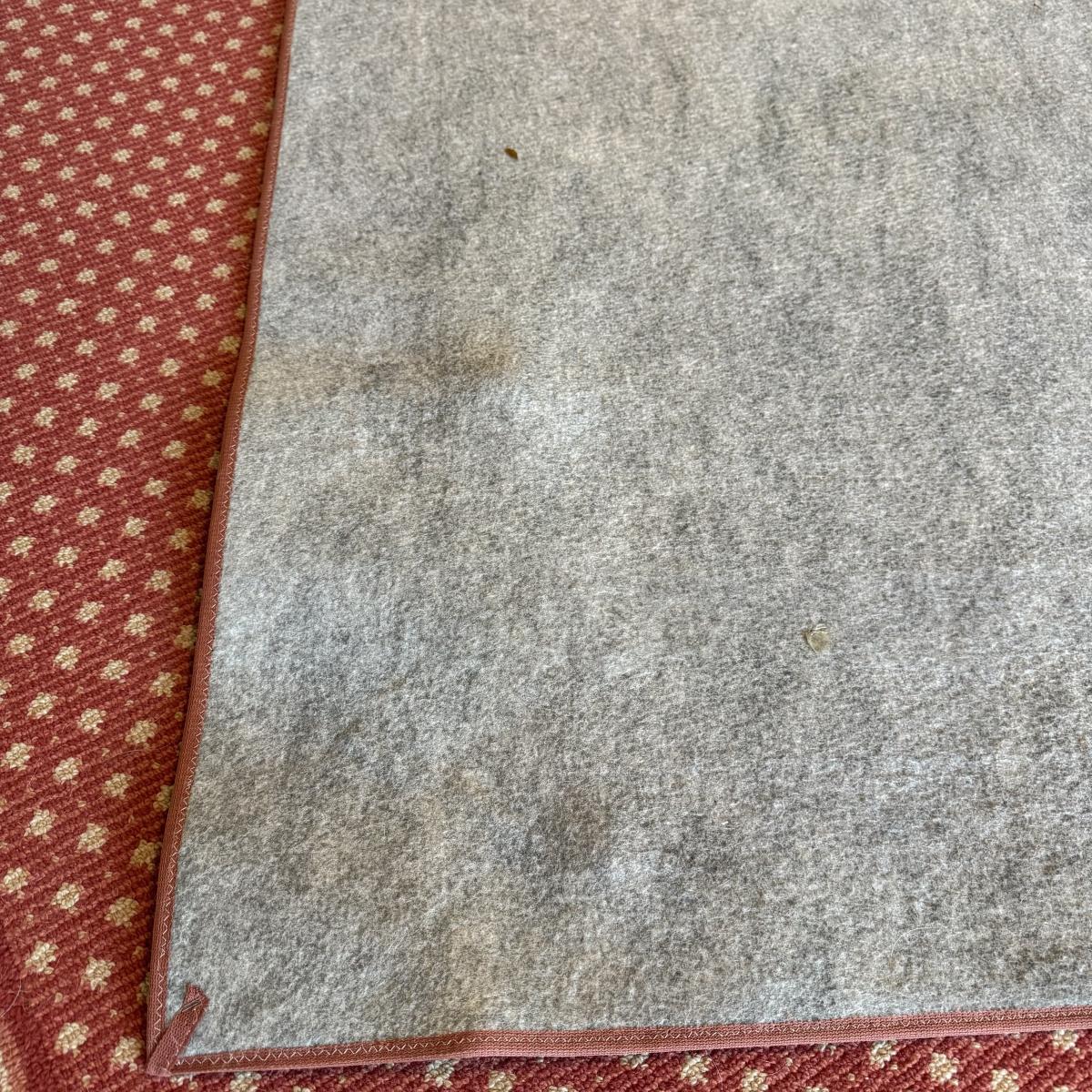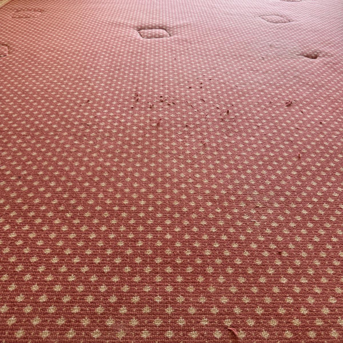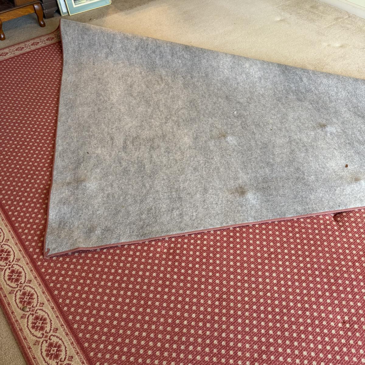 This lot contains a large area rug that has a light red and beige checker and a pretty floral boarder. This massive rug measures 14’ x 10’5”. There is some damage to the center of the rug where it has been pulled apart a bit and while there isn’t any visible stains there is some dog hair. The dents were from heavy furniture and should recover their shape with time. See pictures for details. Local pick up only. Winning bidder must bring assistance to help move and load this item due to its weight and/or size.