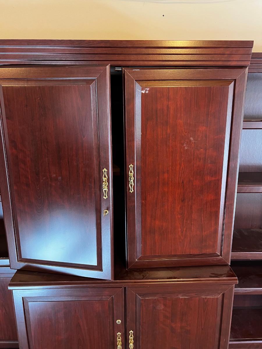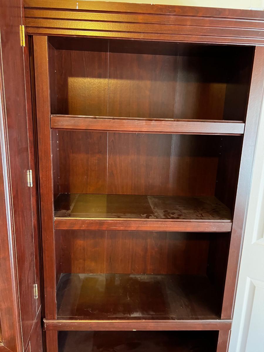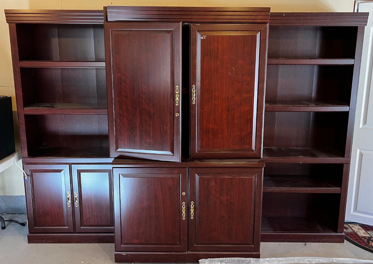 Used. And Usable! Functional for work at home office. Side Shelfs are Separate Book Shelves are 30 X 13 x 72" . Main Middle Measures: 42" X 32 " x 72" Good Condition. In the Basement, be prepared to bring up. There is a door to the outside. But YOU must carry across the lawn and up to the front of the house.