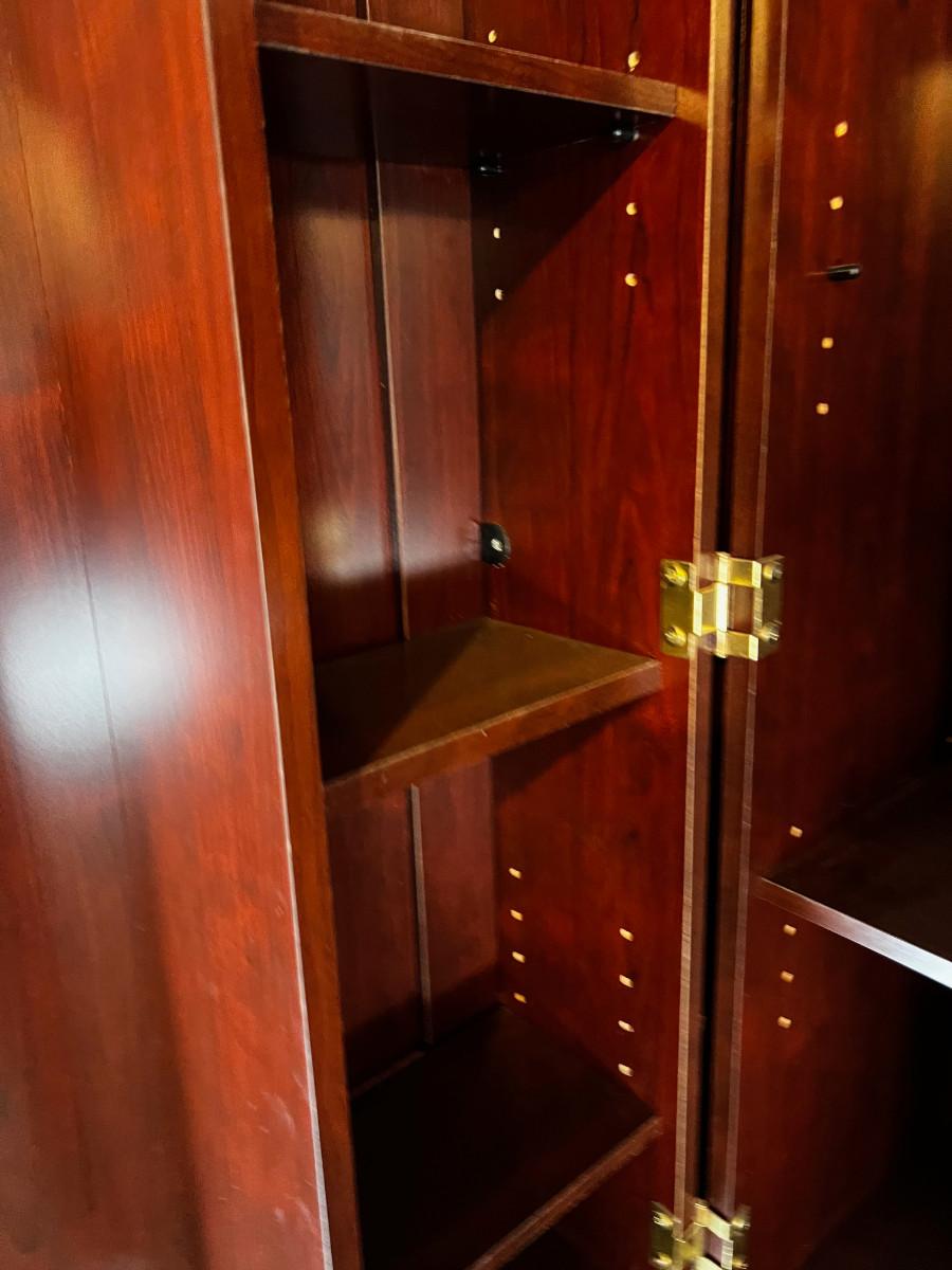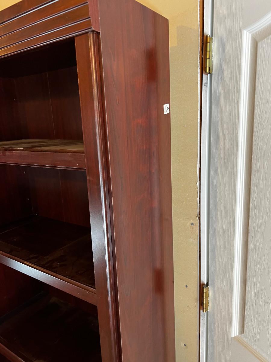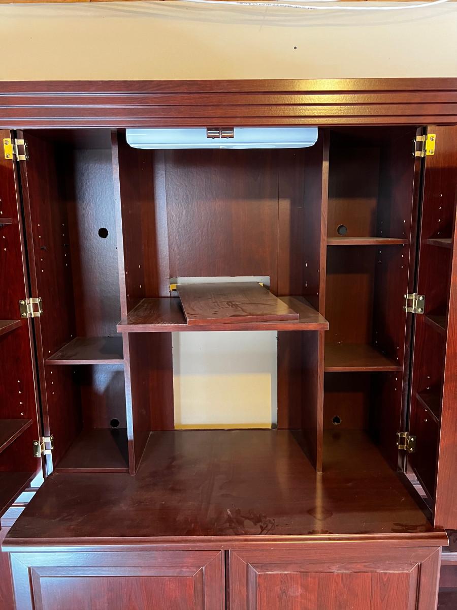 Used. And Usable! Functional for work at home office. Side Shelfs are Separate Book Shelves are 30 X 13 x 72" . Main Middle Measures: 42" X 32 " x 72" Good Condition. In the Basement, be prepared to bring up. There is a door to the outside. But YOU must carry across the lawn and up to the front of the house.