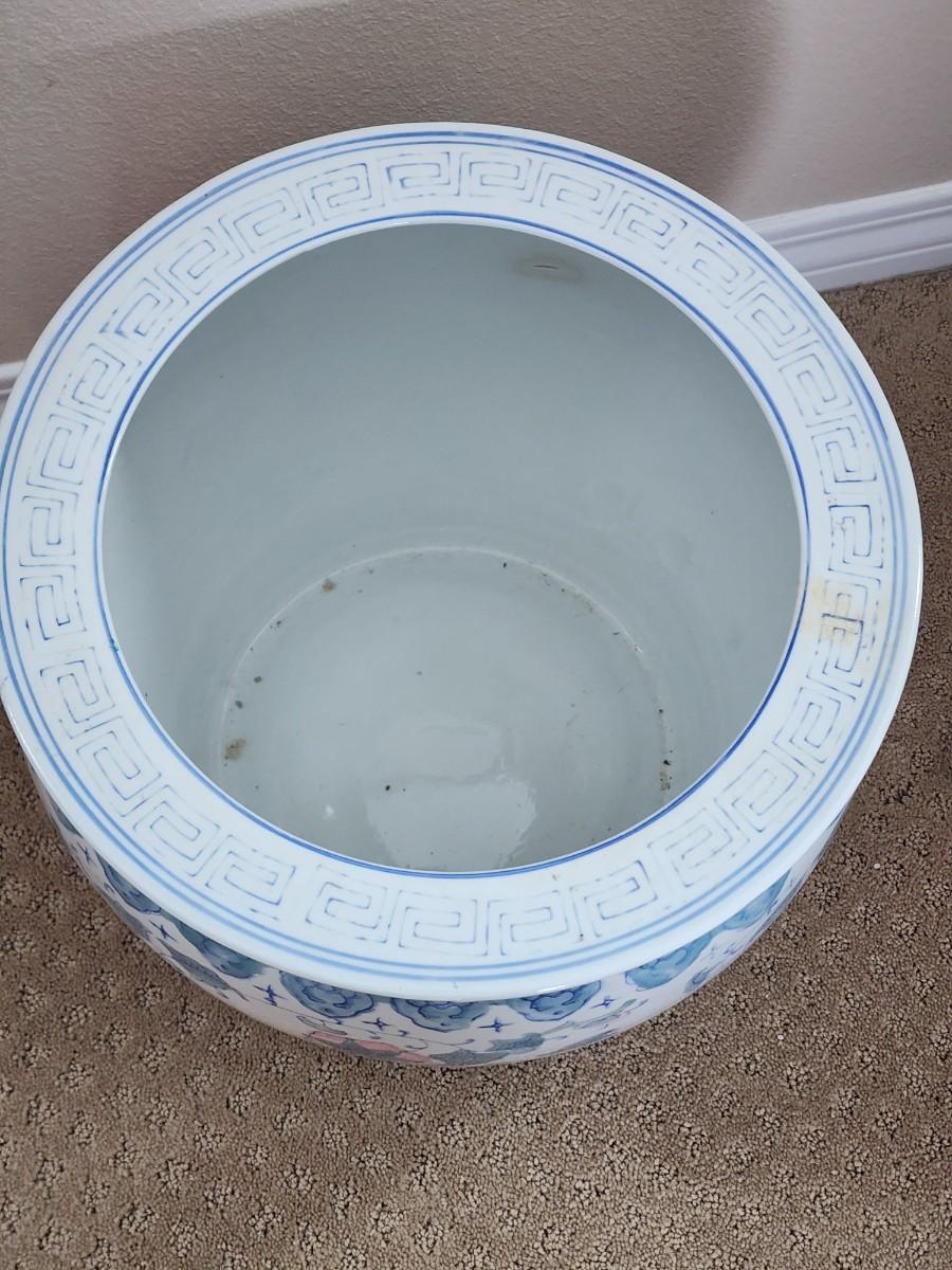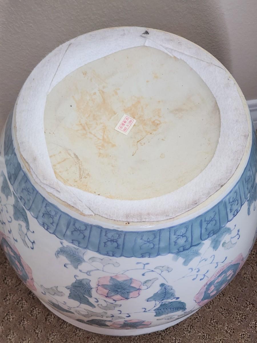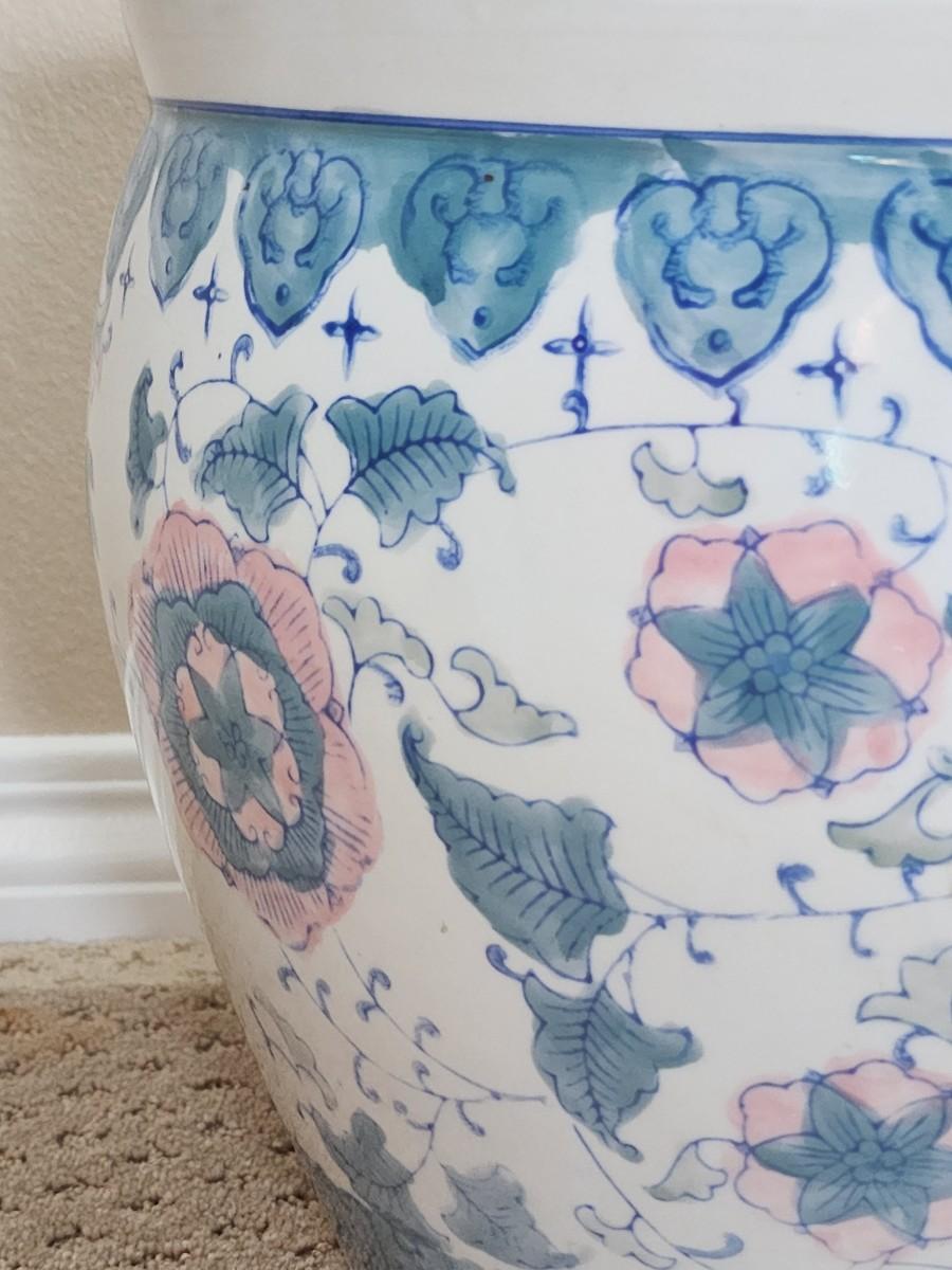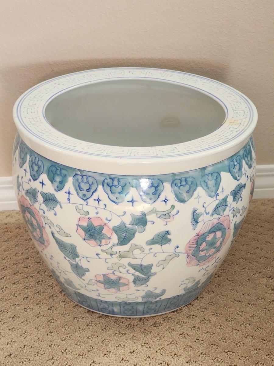 White withe blue, turquoise and pink. 12" tall x 14" diameter.
