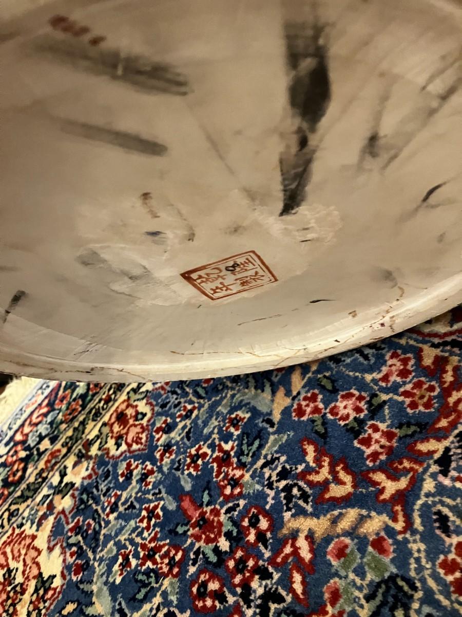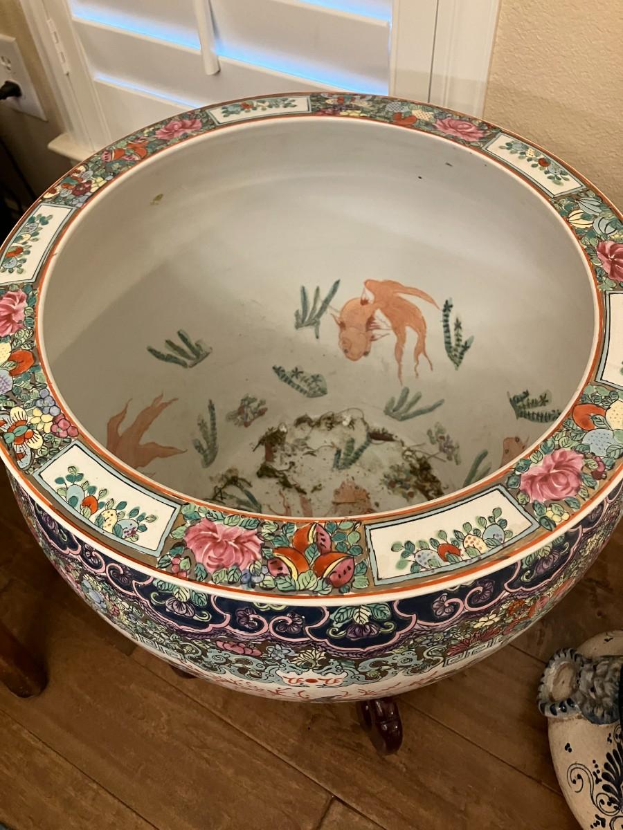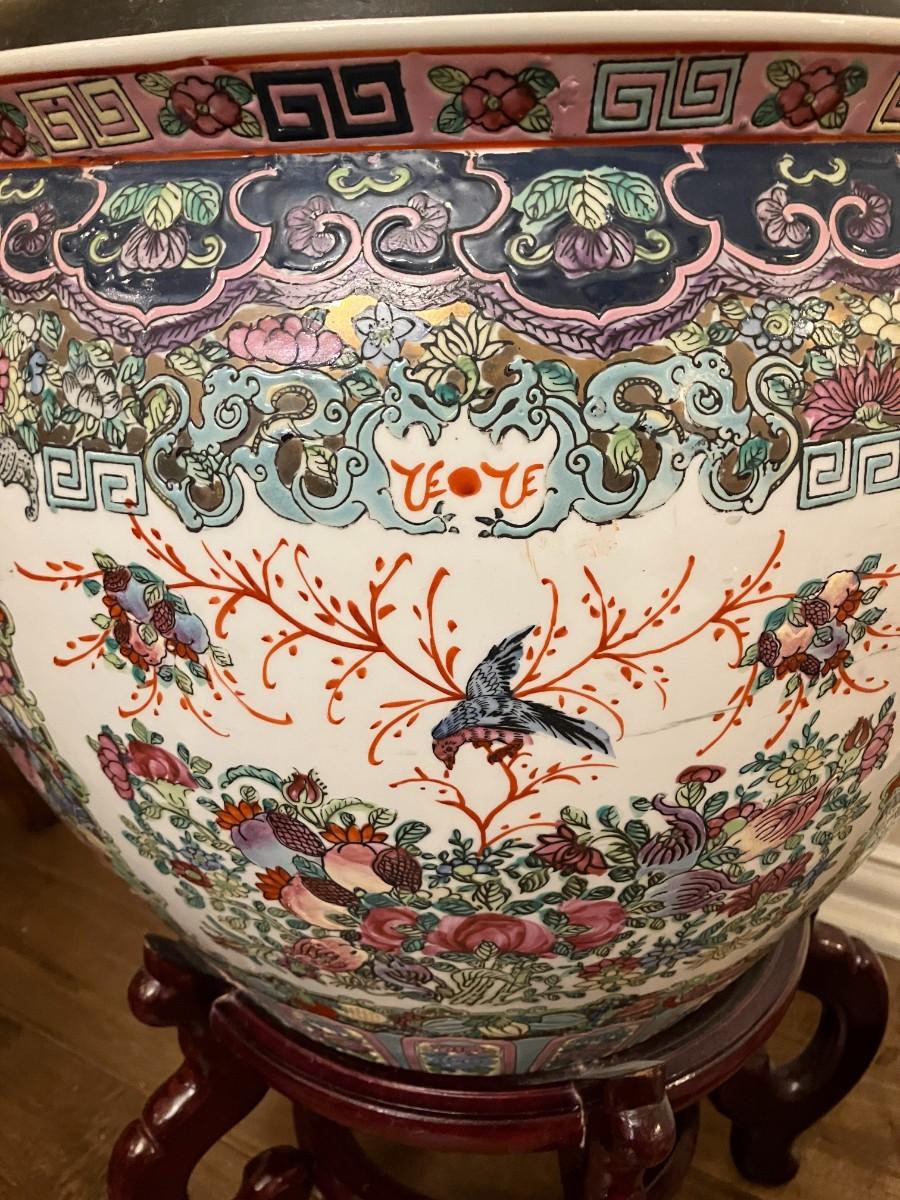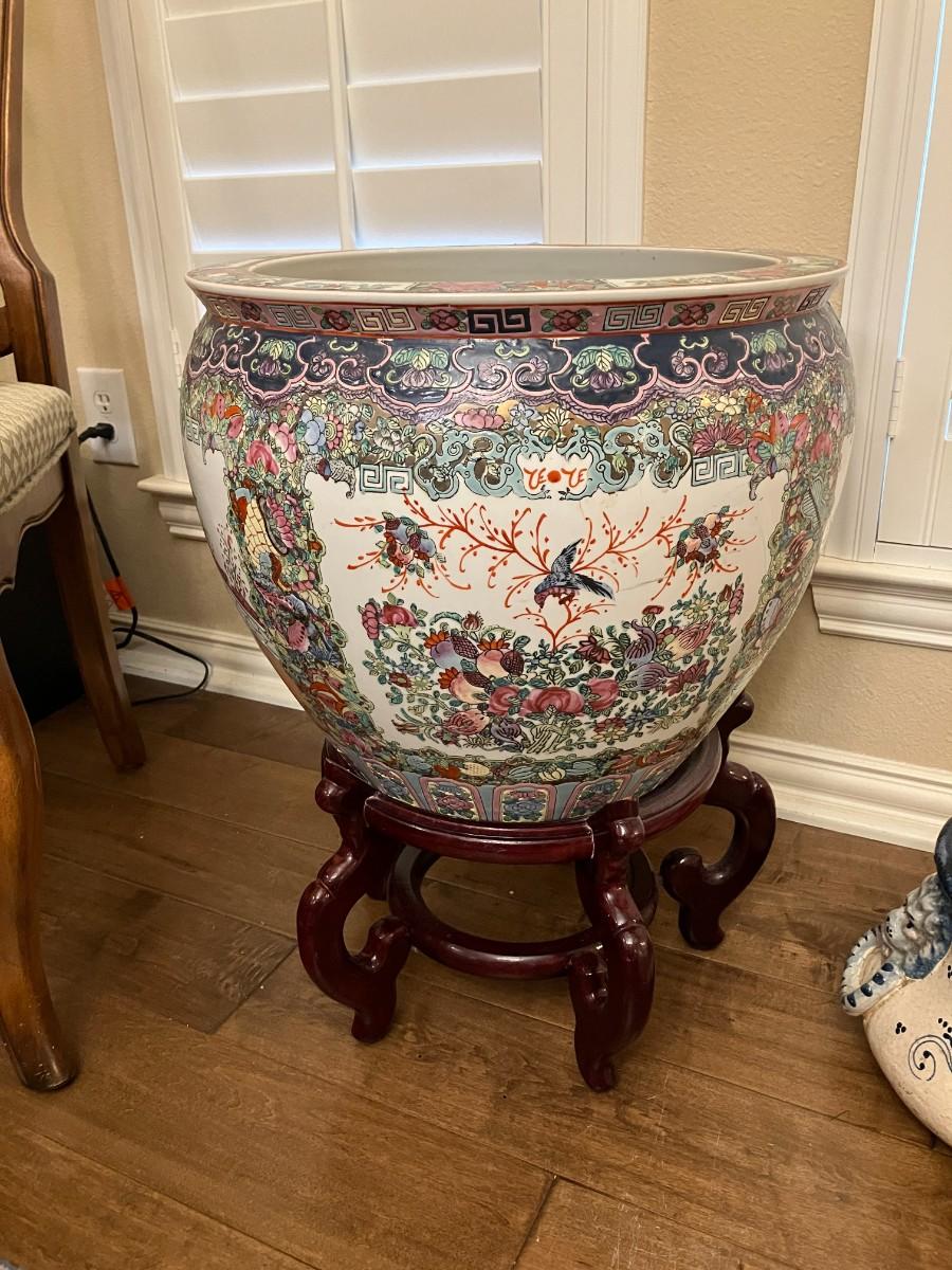 Large Chinese floor vase measuring 15" H x 17" diameter, comes with wooden base