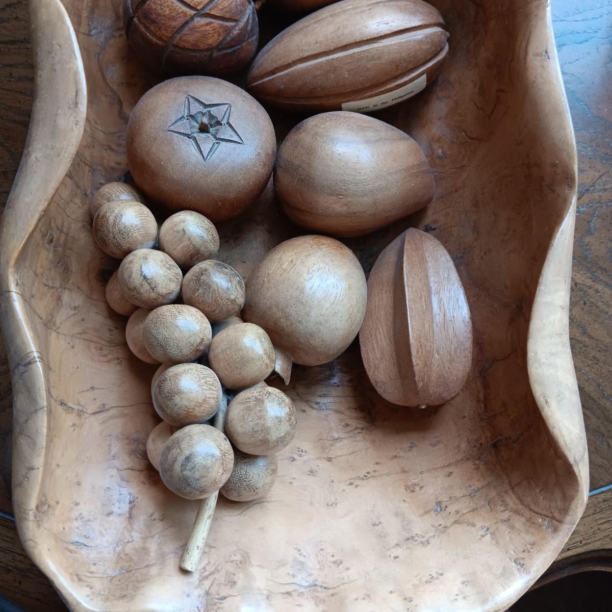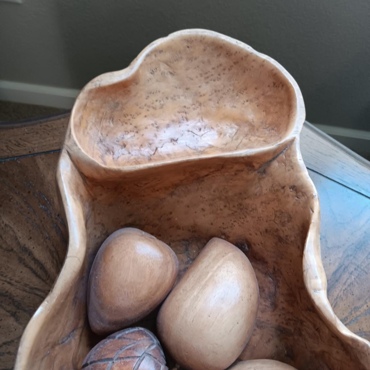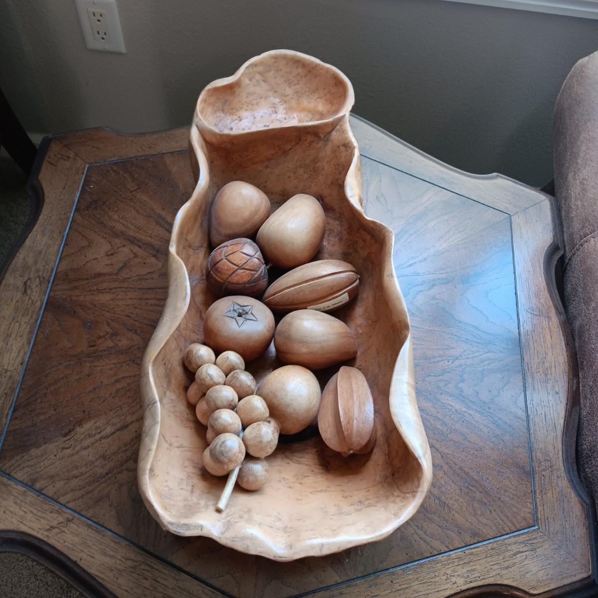 LARGE CHIP AND DIP MADE FROM A TREE ROOT? AND WOODEN FRUIT