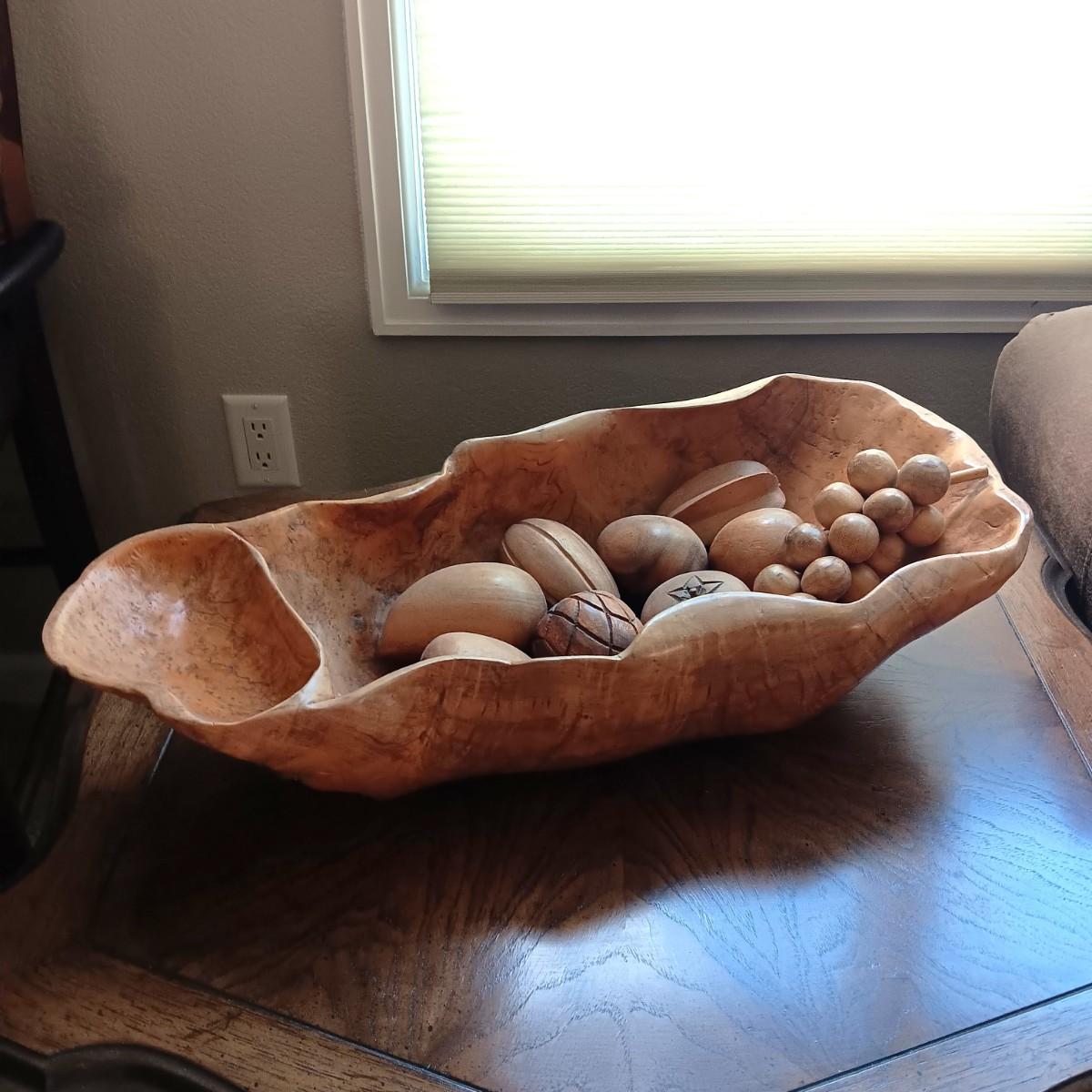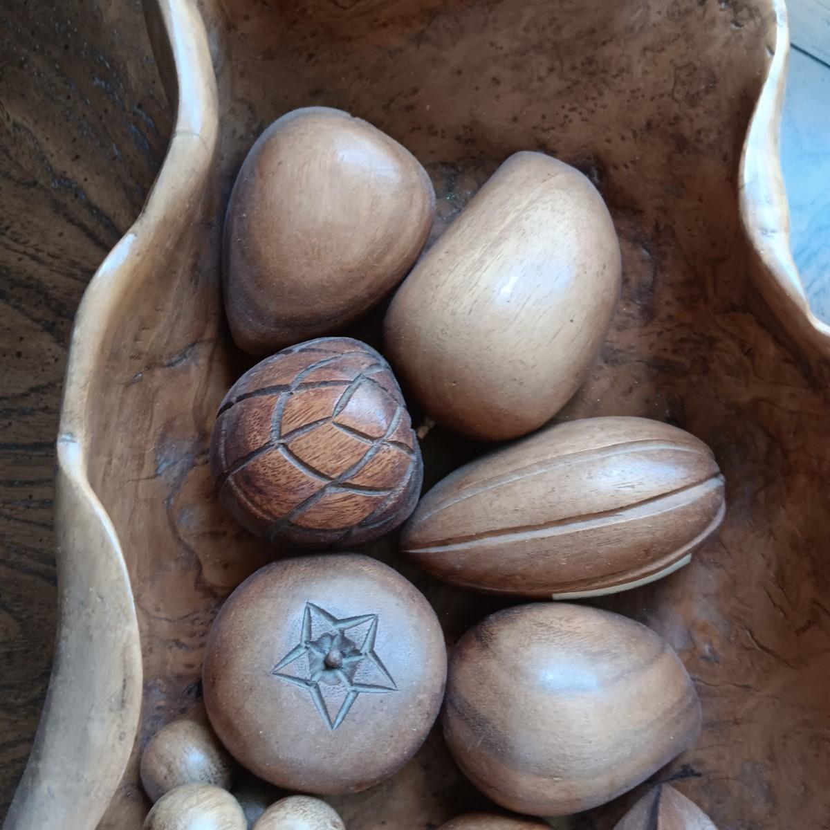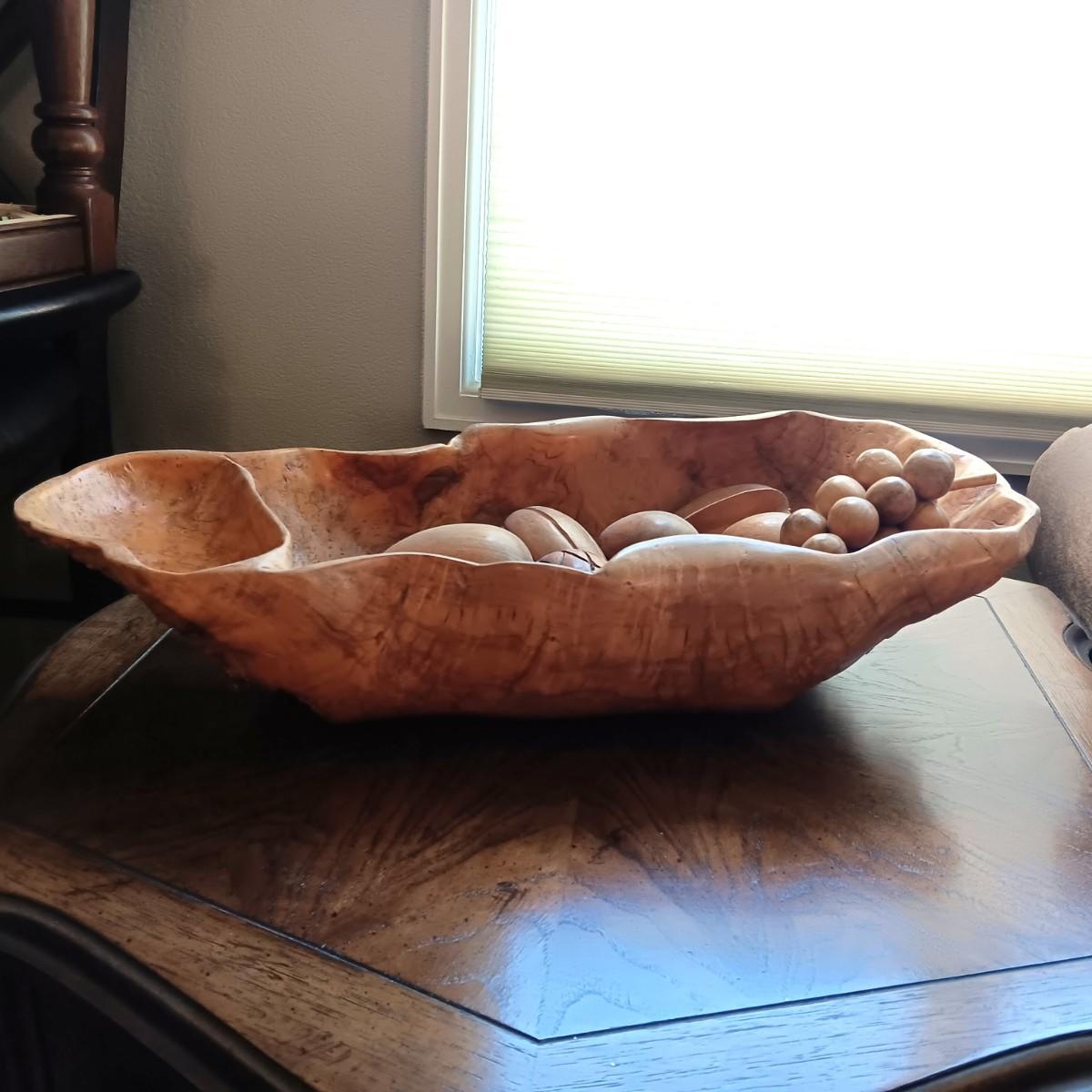 LARGE CHIP AND DIP MADE FROM A TREE ROOT? AND WOODEN FRUIT
