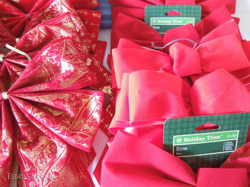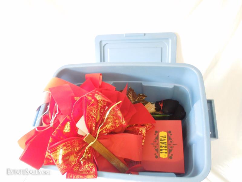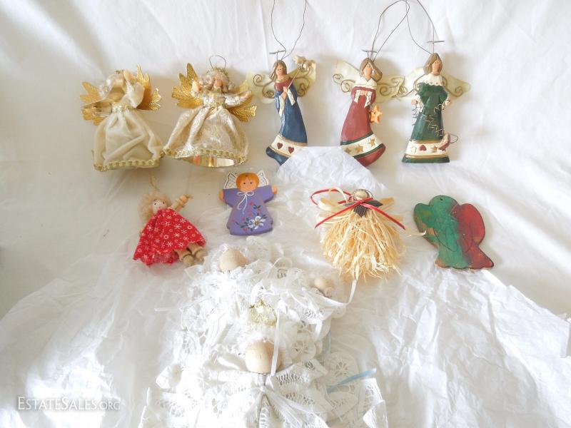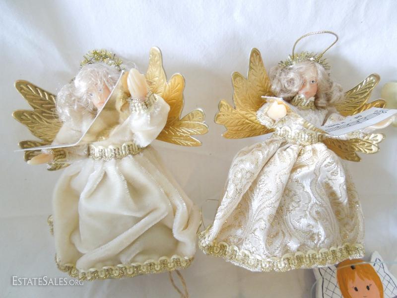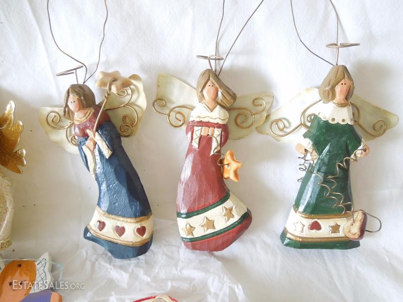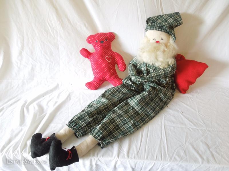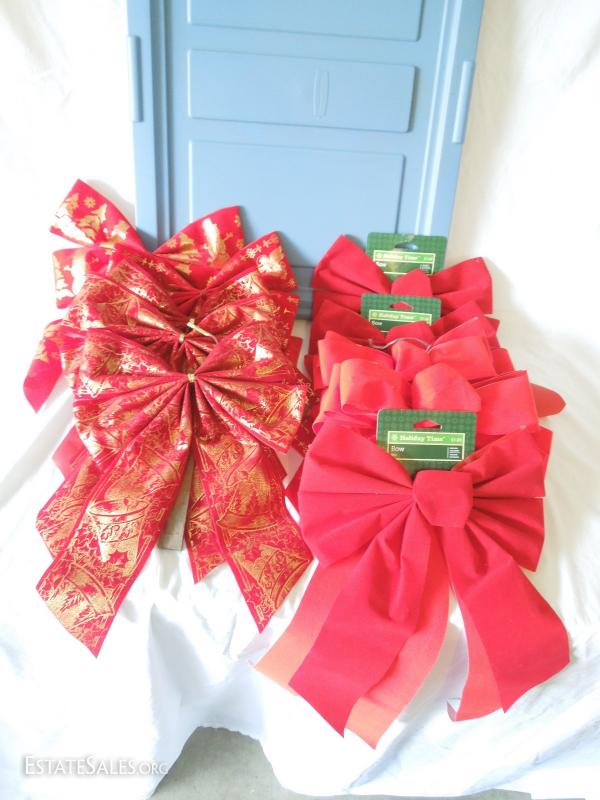 Fabric bows to deck the halls, fabric santa and bear, wire Card holder, box of angle ornaments,