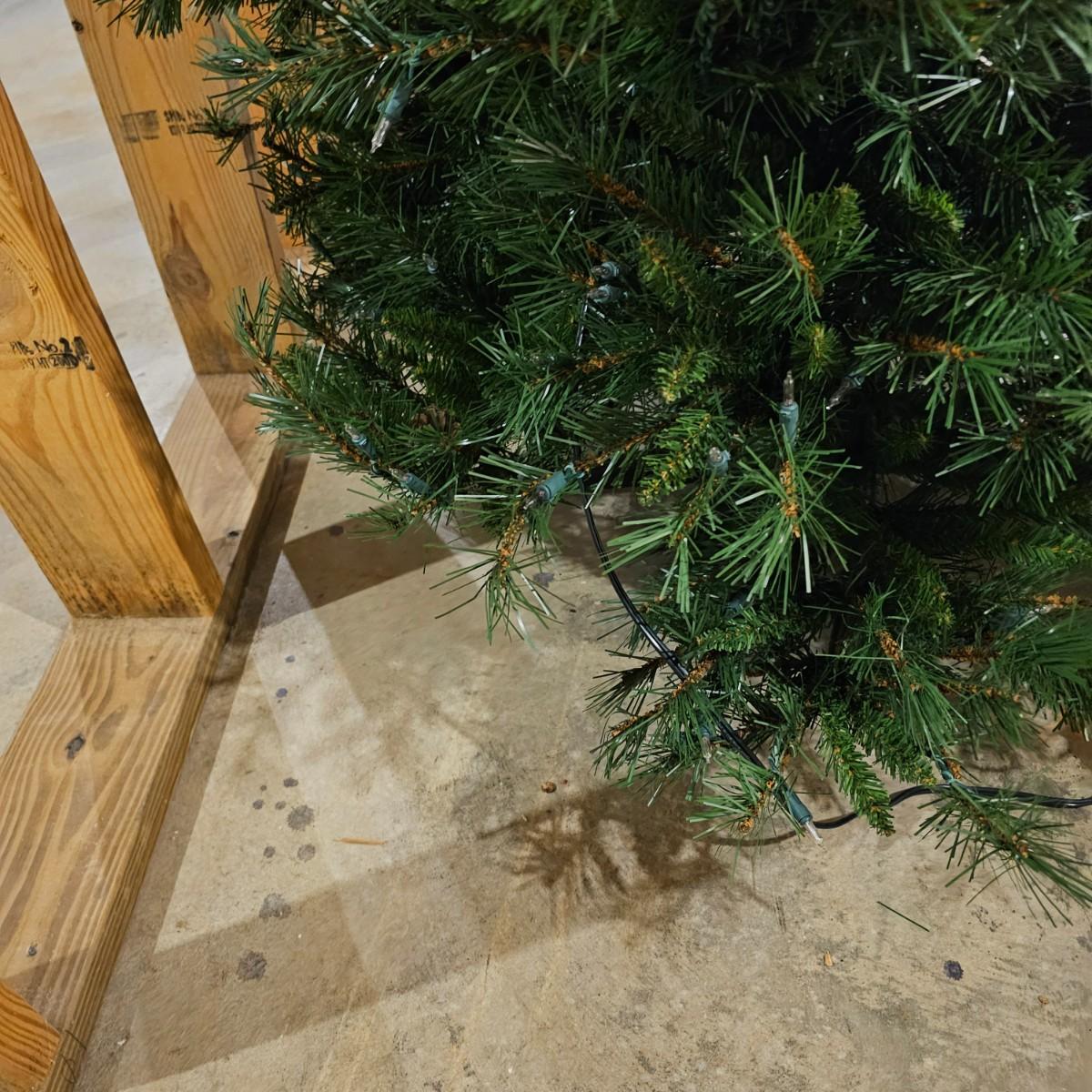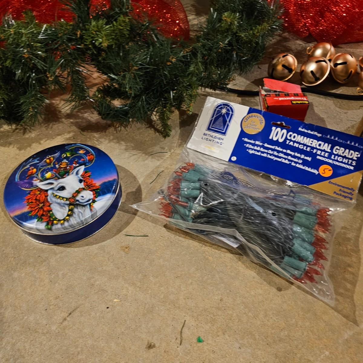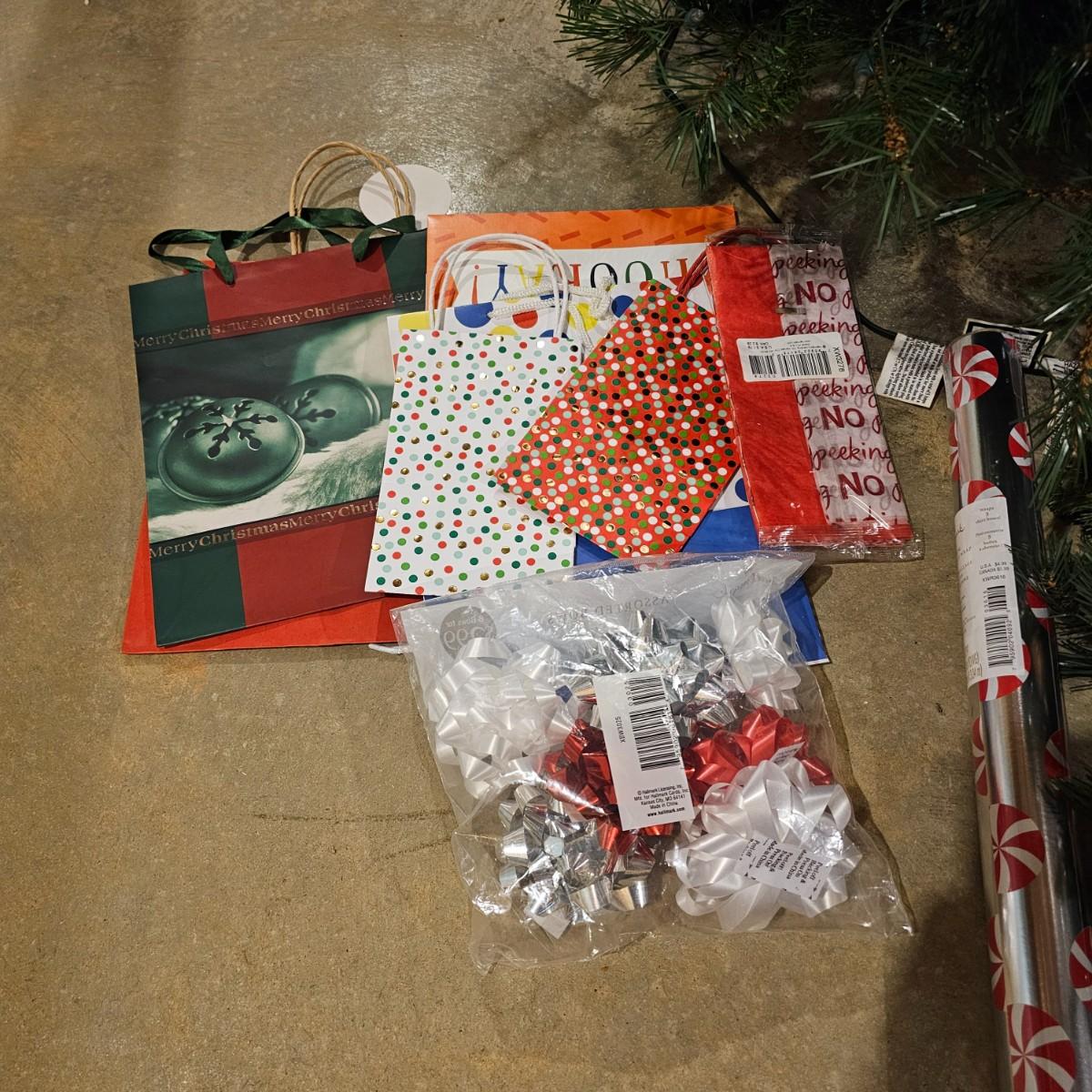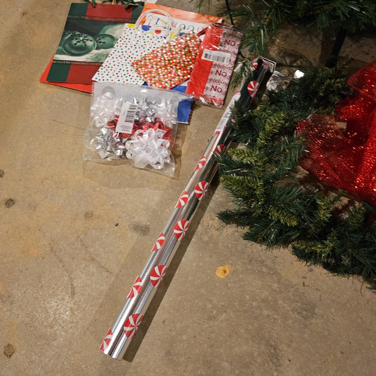 One large artificial tree, 44"D x 108"H (approximately 9' tall). Comes apart in sections for storage. Also includes miscellaneous wrapping items, bags, paper, ribbon, tape, etc. One length of artificial garland and red plastic burlap decor. Another set of 100 lights, powered on when plugged in. Please note that tree lights not all functional, may require some TLC. See photos for details. Local pickup only.