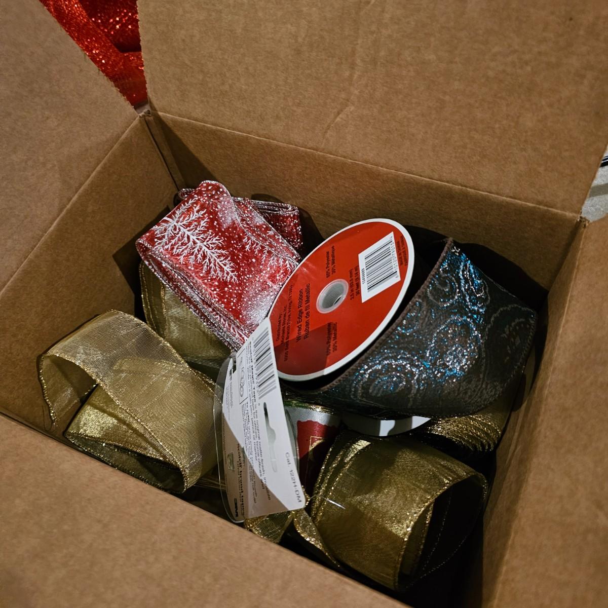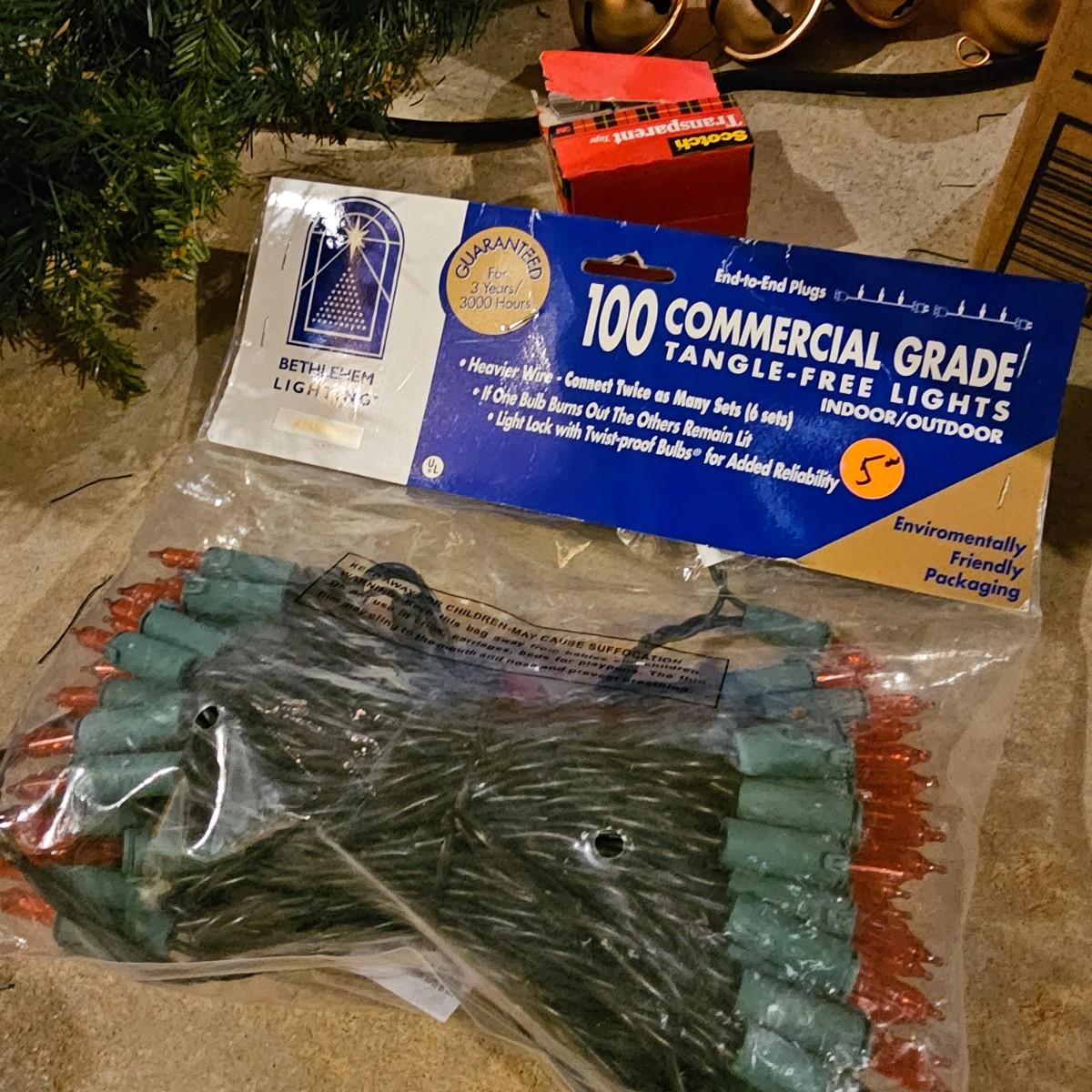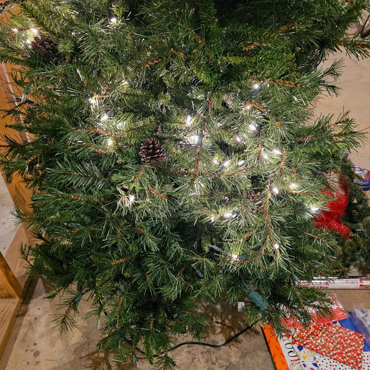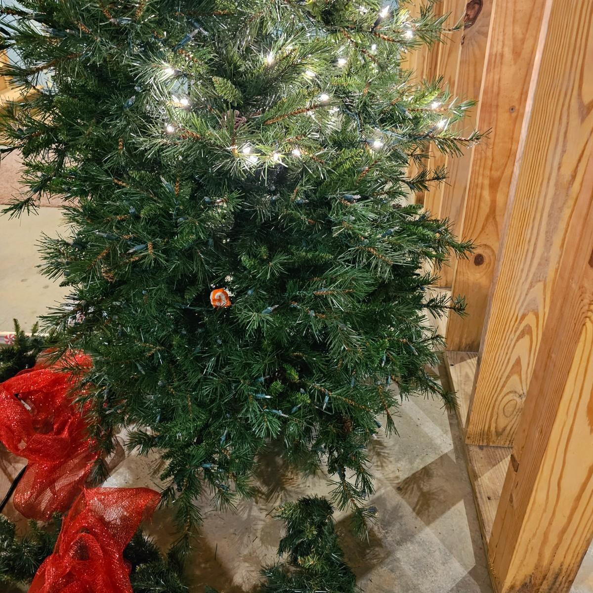 One large artificial tree, 44"D x 108"H (approximately 9' tall). Comes apart in sections for storage. Also includes miscellaneous wrapping items, bags, paper, ribbon, tape, etc. One length of artificial garland and red plastic burlap decor. Another set of 100 lights, powered on when plugged in. Please note that tree lights not all functional, may require some TLC. See photos for details. Local pickup only.