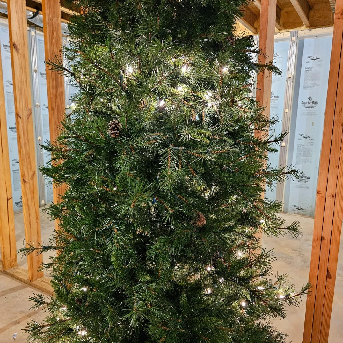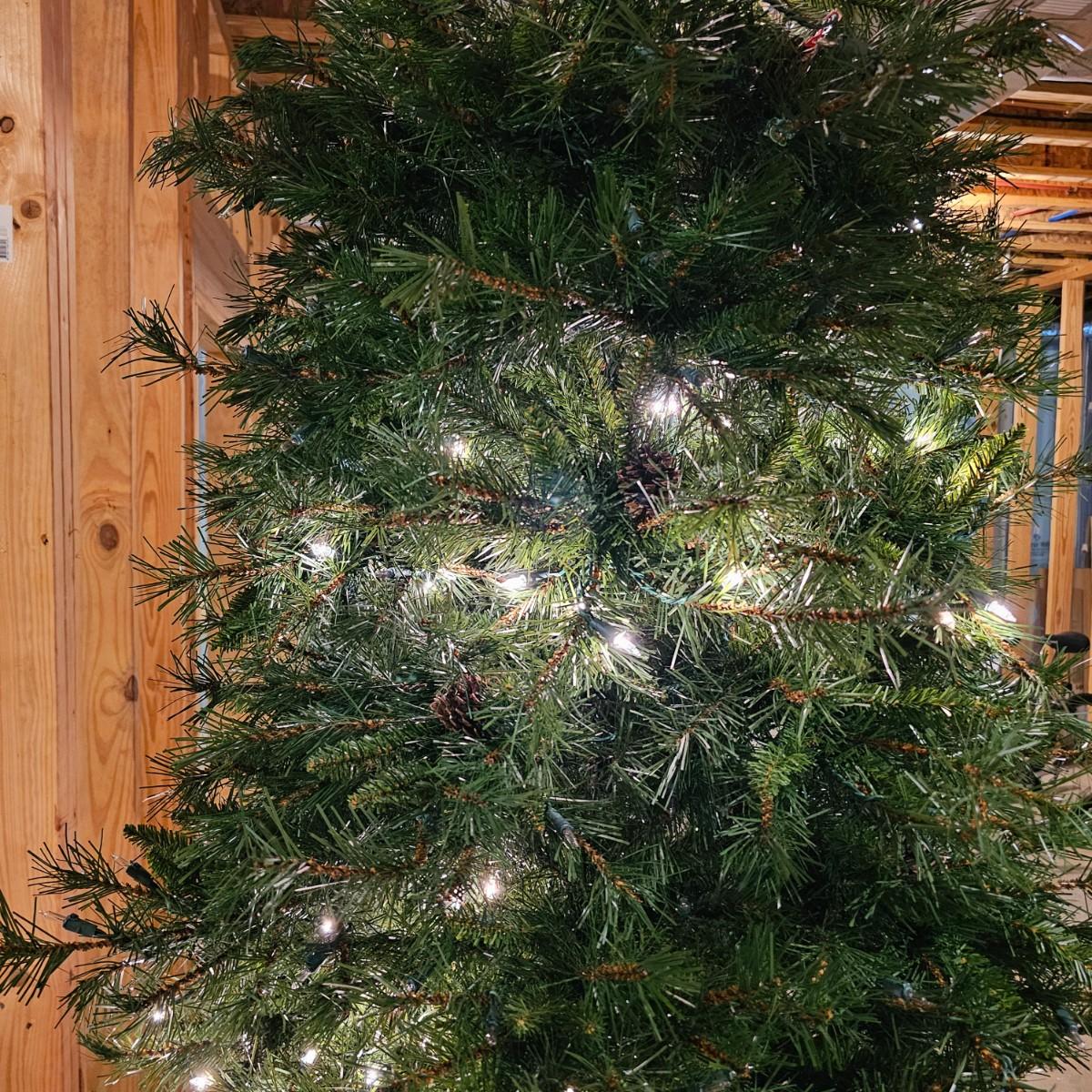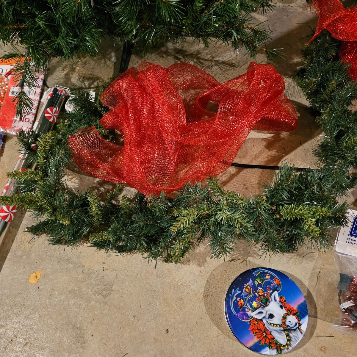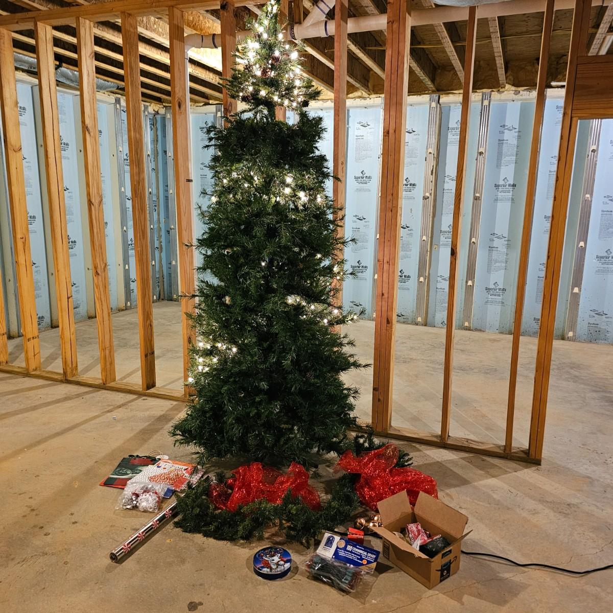 One large artificial tree, 44"D x 108"H (approximately 9' tall). Comes apart in sections for storage. Also includes miscellaneous wrapping items, bags, paper, ribbon, tape, etc. One length of artificial garland and red plastic burlap decor. Another set of 100 lights, powered on when plugged in. Please note that tree lights not all functional, may require some TLC. See photos for details. Local pickup only.
