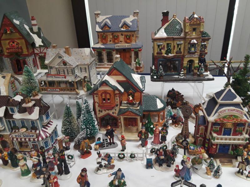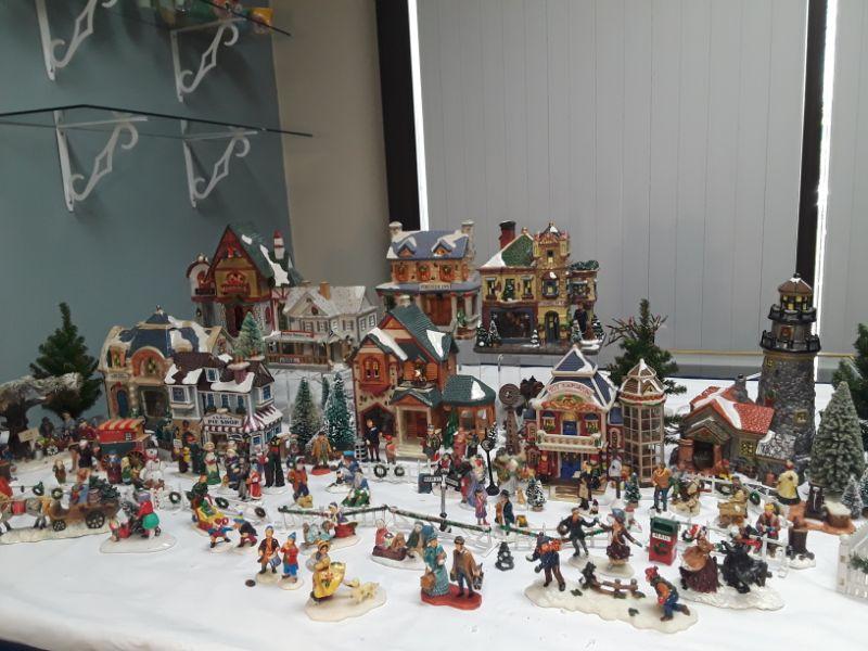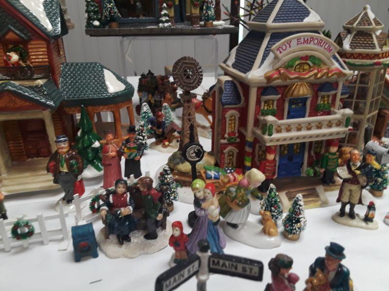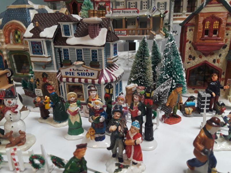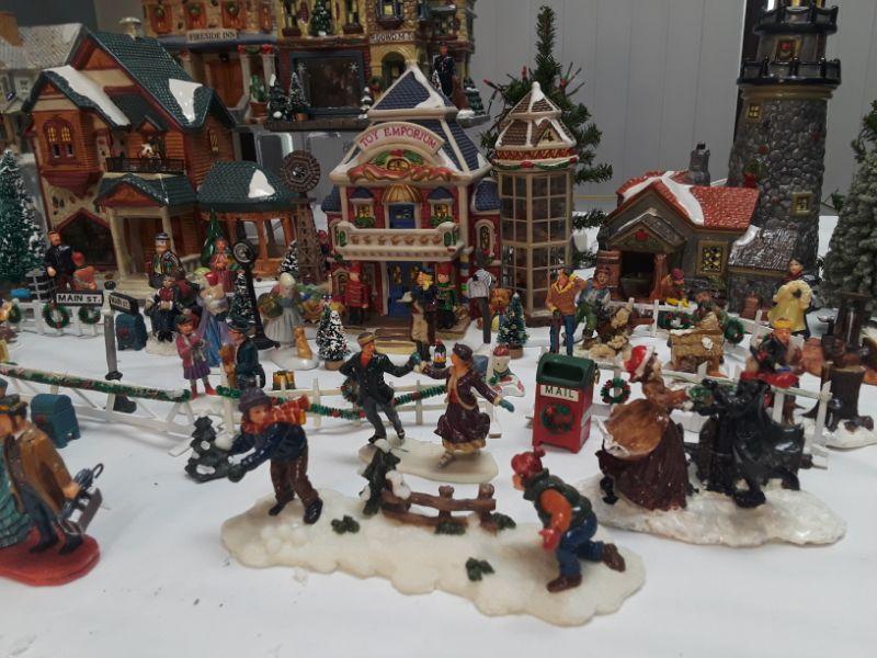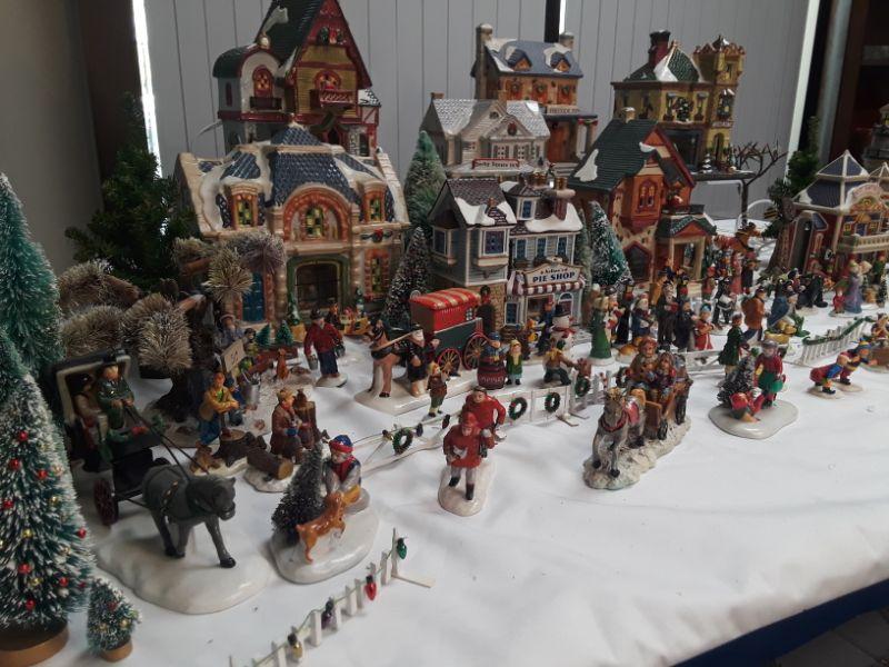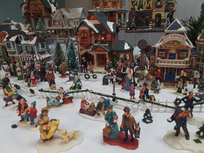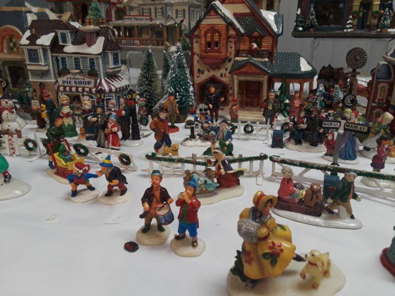 Christmas Village Lot. Mostly unbranded with a few Lemax and Dept 56 pieces. Comes with everything seen in the pictures. Houses can be lite up, all have light attachments. A couple have some missing windows, but no major damage. People are in good condition. Great addition to a current village or the start of a new one. No original packaging. Shipping would require multiple boxes.