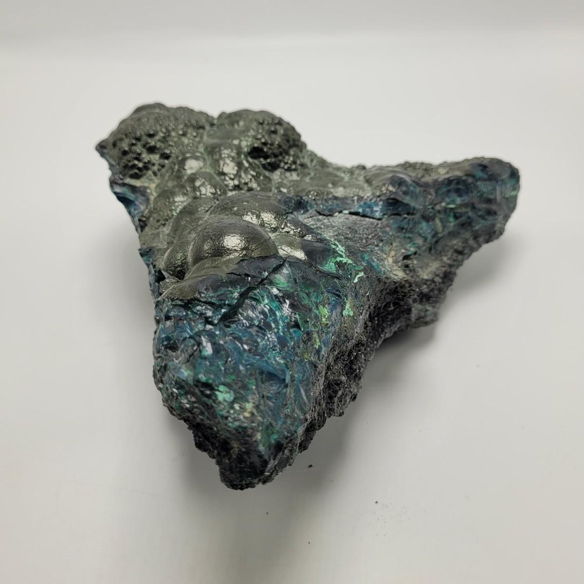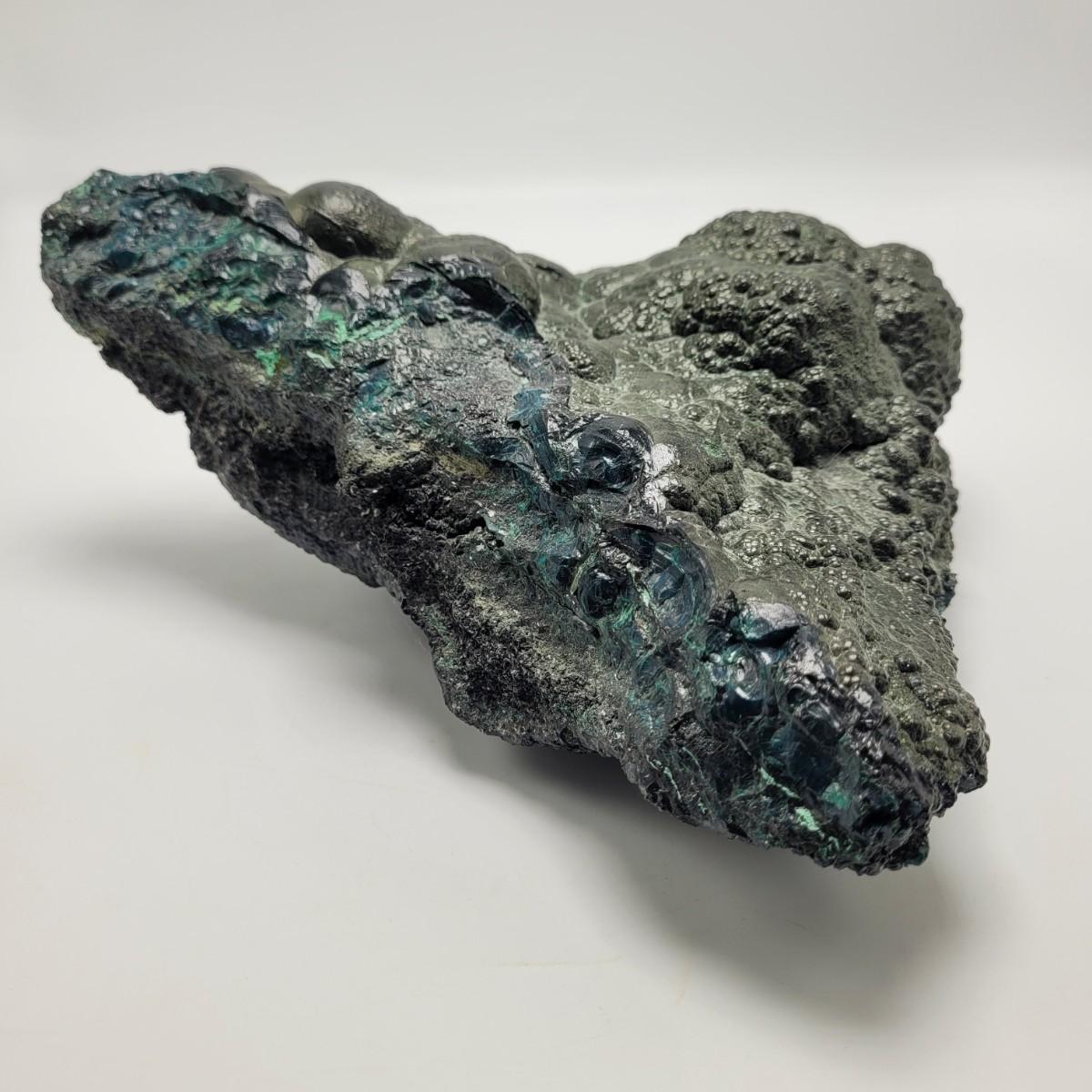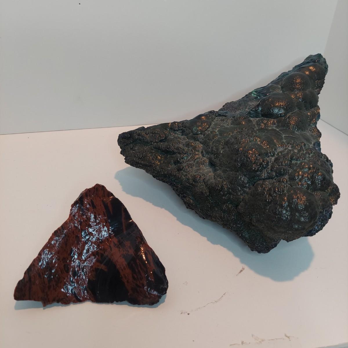 This lot includes one large piece of what appears to be raw malachite. This piece of malachite has a rough and stony side, and a smooth bubbly side. The chunk is large, measuring 10" x 8" x 4.5"H. This piece is not polished and is displayed in its raw and rough form. Also icludes what appears to be a piece of mahogany obsidian. All sales are final. No returns or refunds. Please bid accordingly.