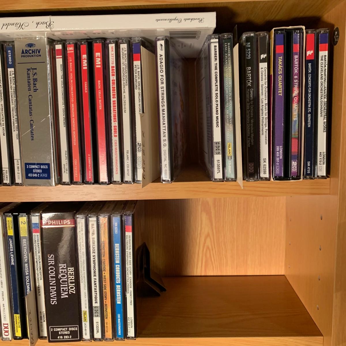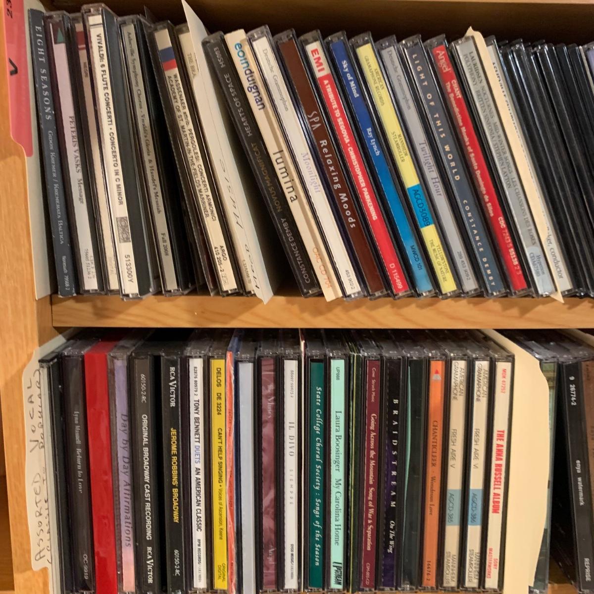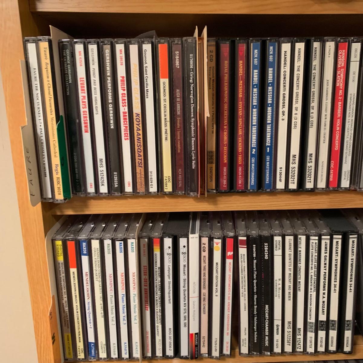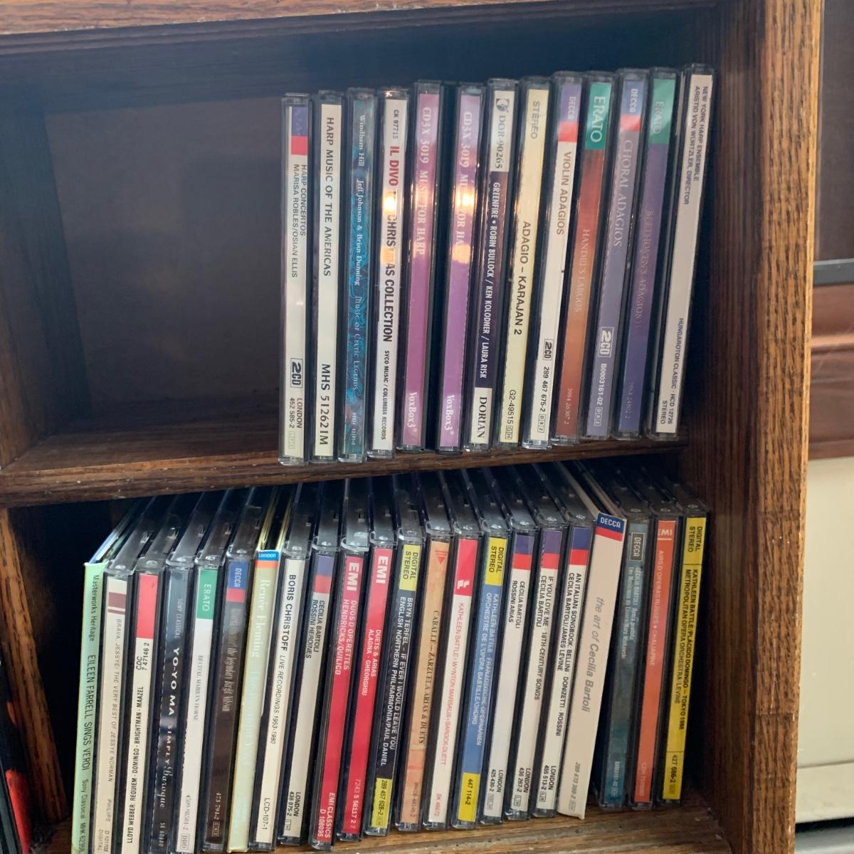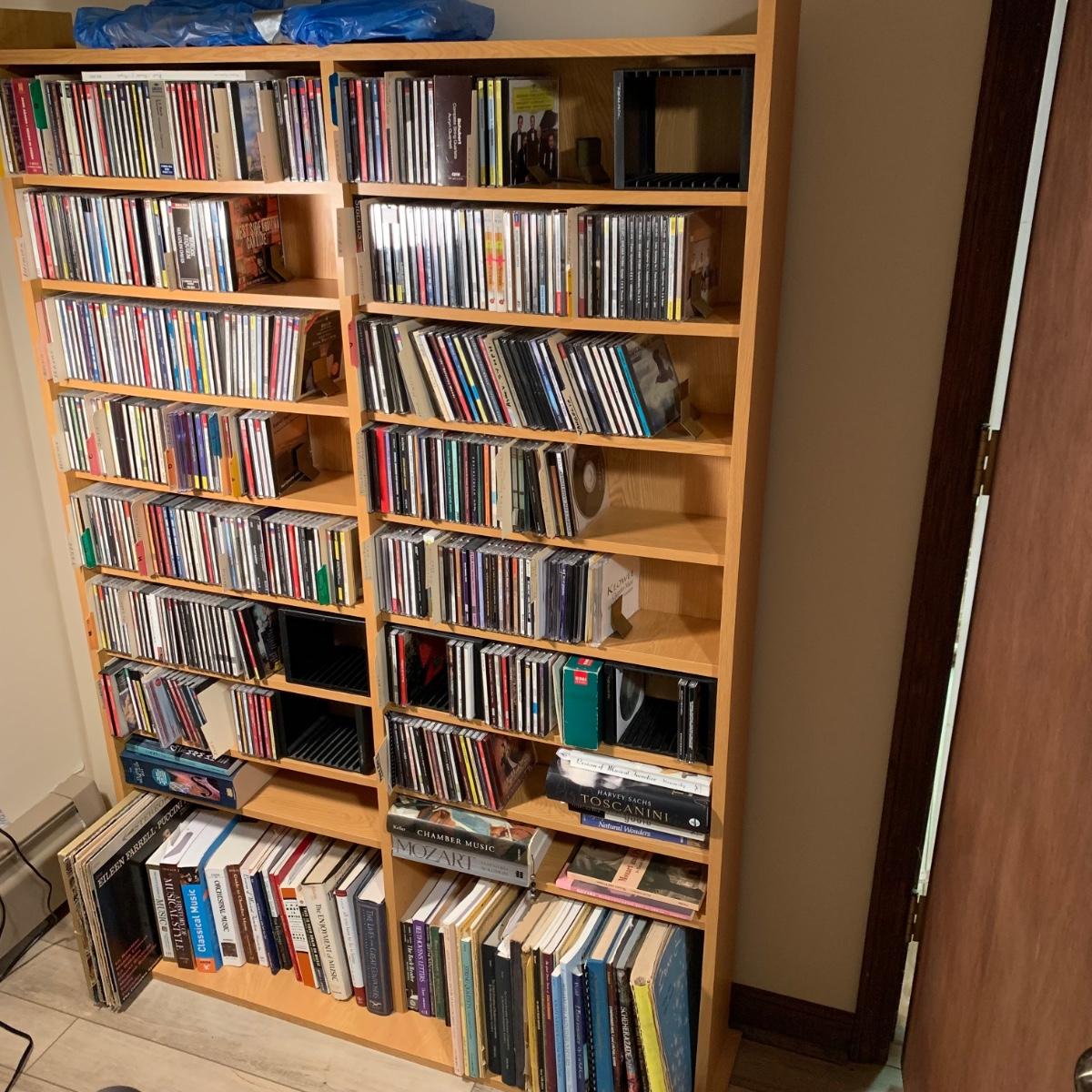 All things classical music! This lot includes over 750 CDs, 14 records, and more than 50 books. All items are music related, with most being classical. Due to the volume, we cannot guarantee that every jewel case contains a CD or the proper CD. CD rack made from manufactured wood is included as well. Case has 16 adjustable shelves and is 43.25” x 9.75” (at base) x 63.5”H. Two extra shelves are included as well. Please see photos for inventory and details.