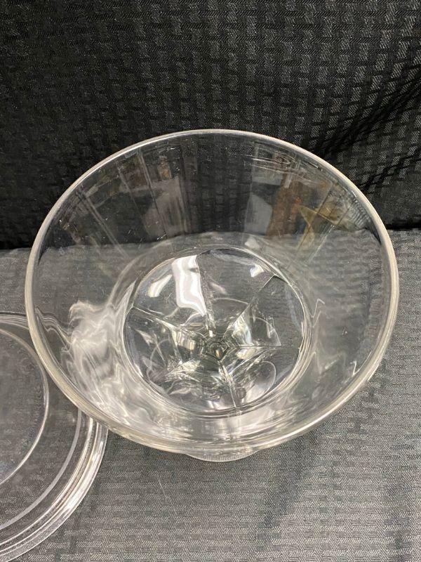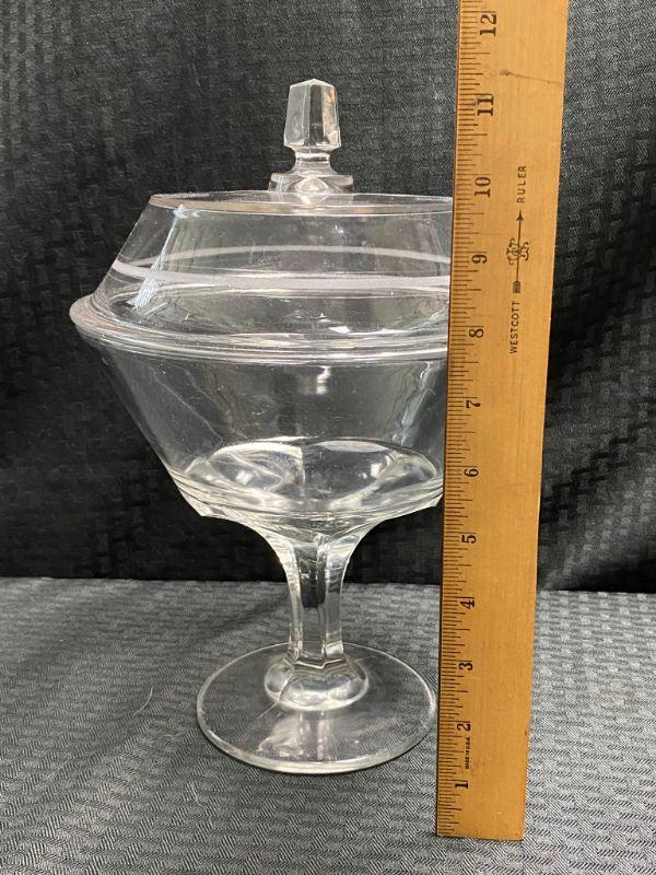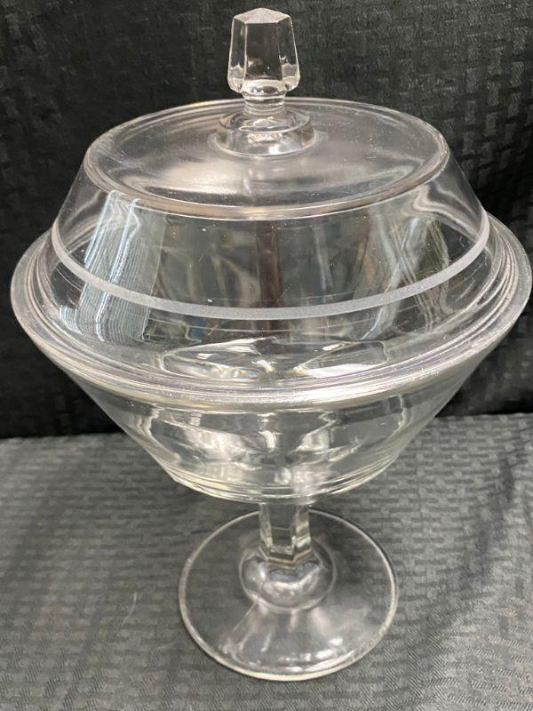 Large clear glass candy dish. Stands about 11" with the dish being about 8" across. No chips. Add to any decor with the simple style of this dish.