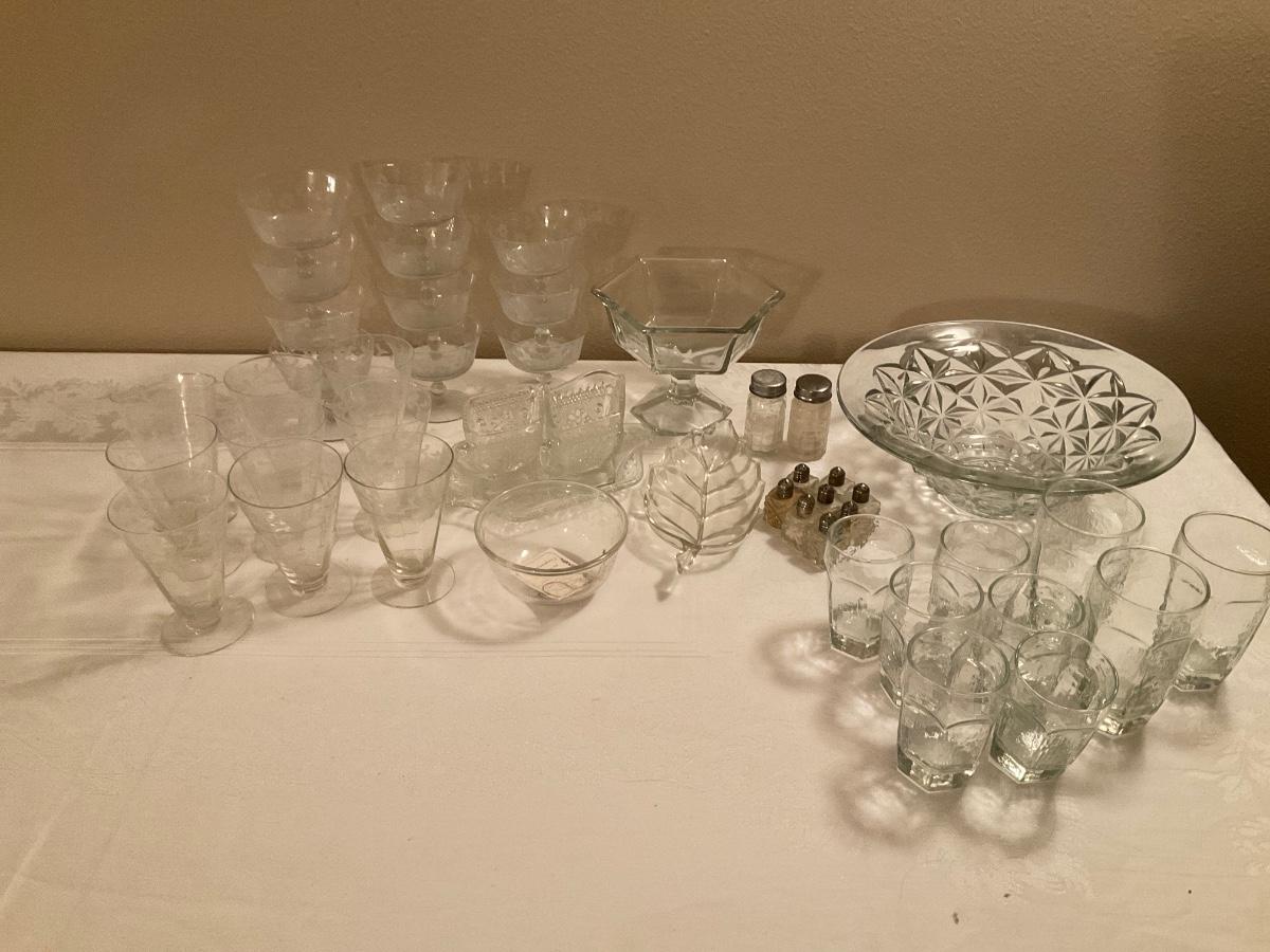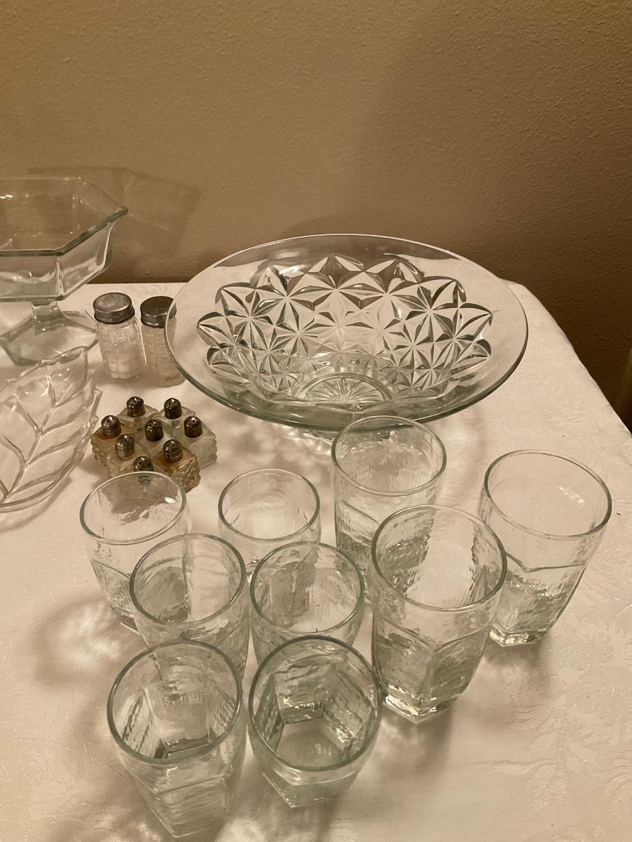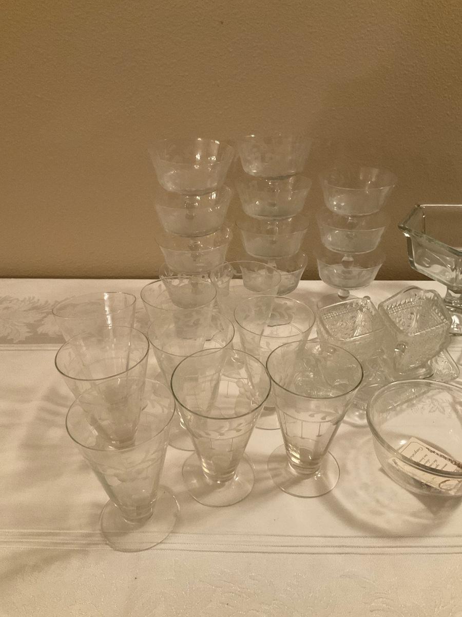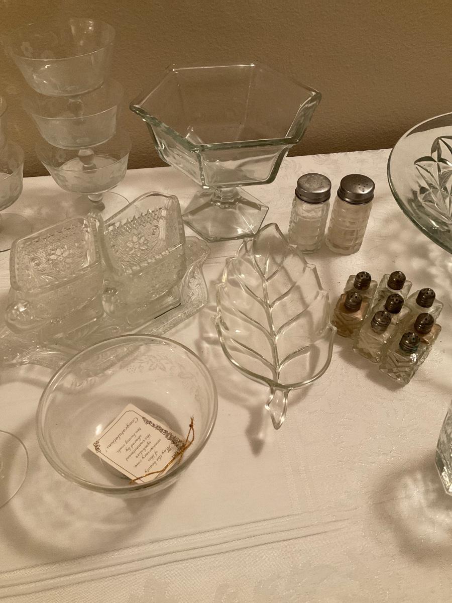 Includes depression glass dessert cups, parfait cups, cream and sugar, bowls, leaf platter, glasses