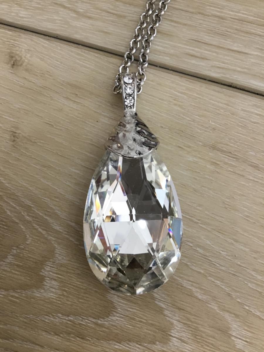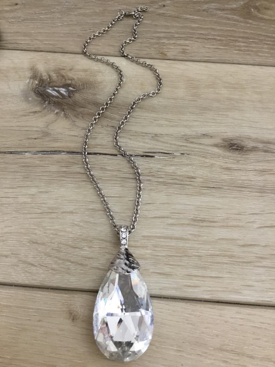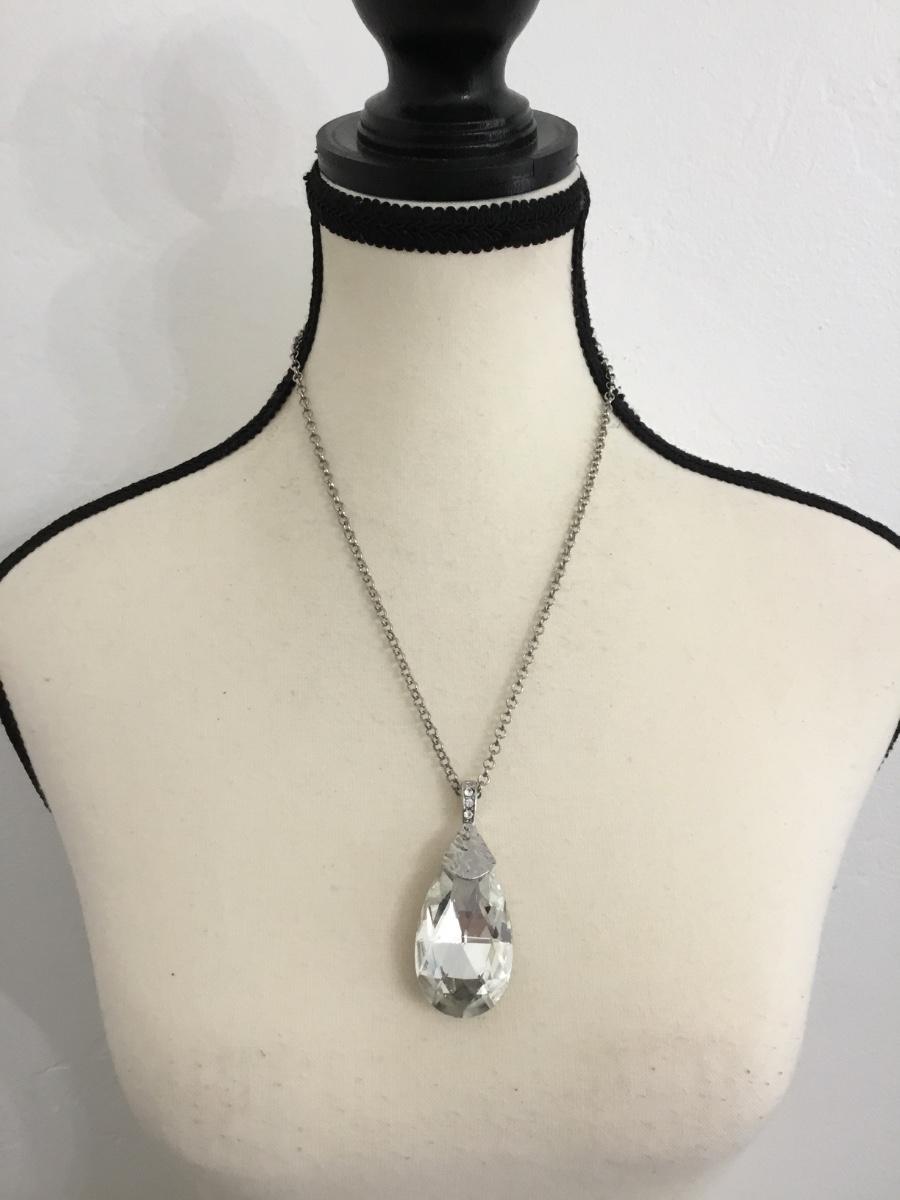 Large clear, rhinestone teardrop pendant with silver tone, chain statement necklace