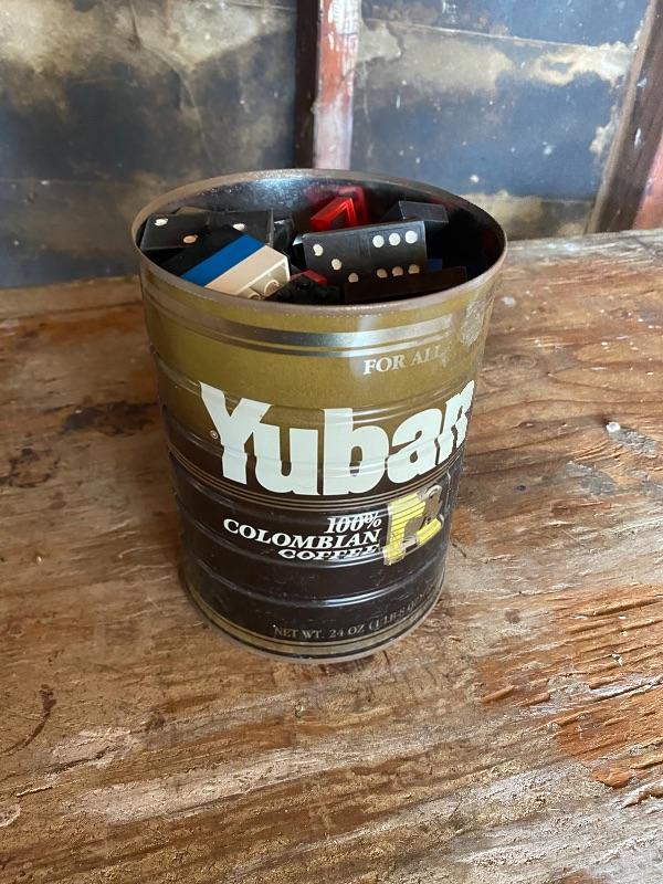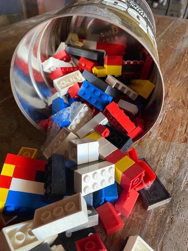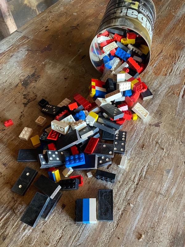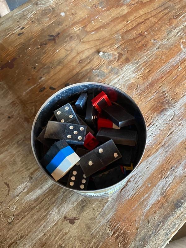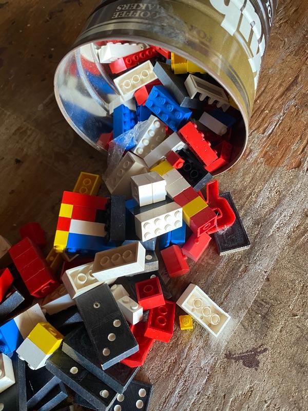 Large coffee can of Legos and dominos. Not sure if it is a full set of dominos or age of Legos.