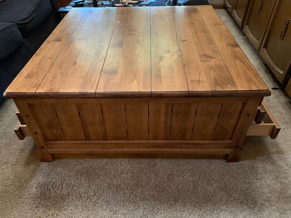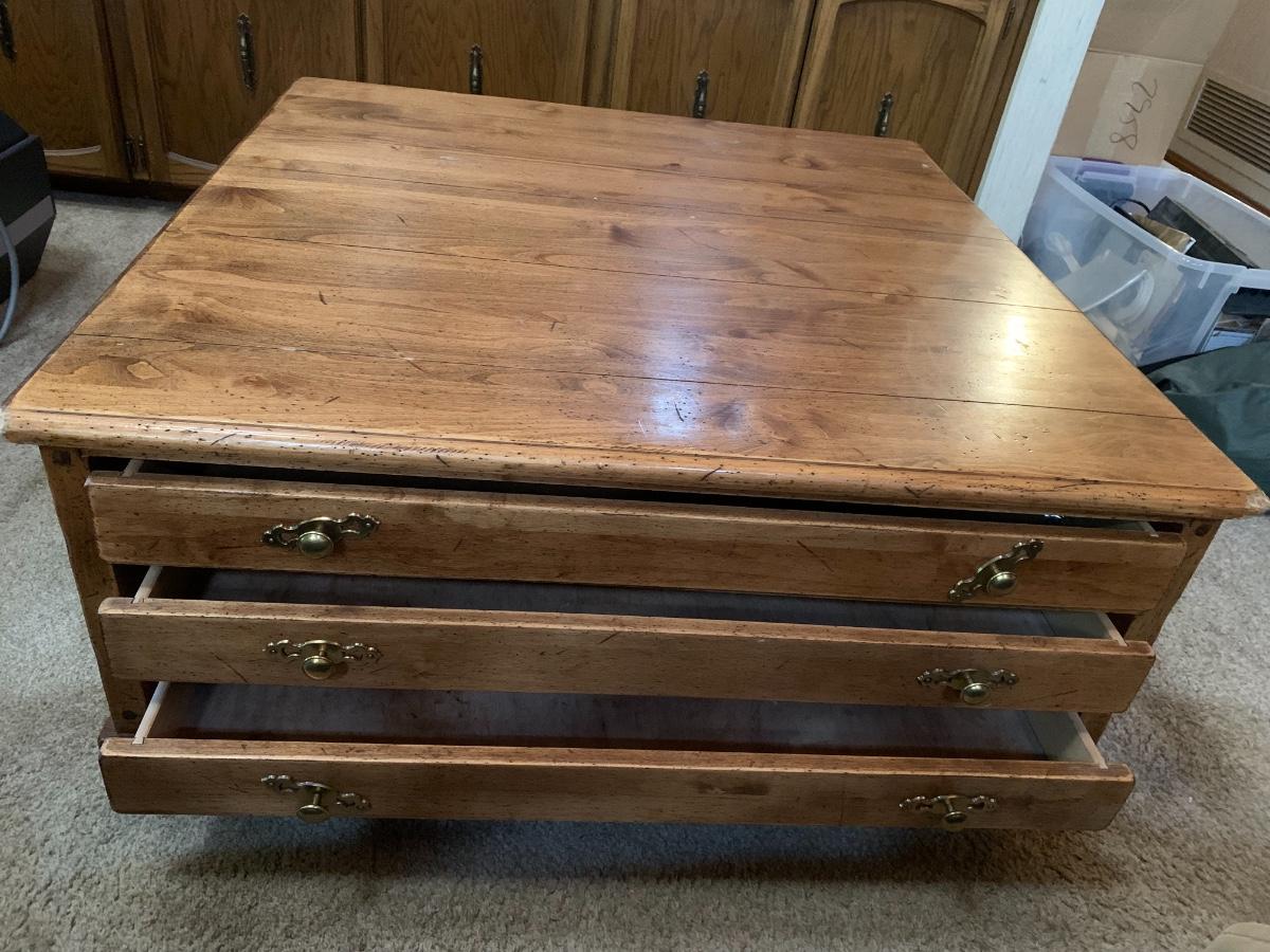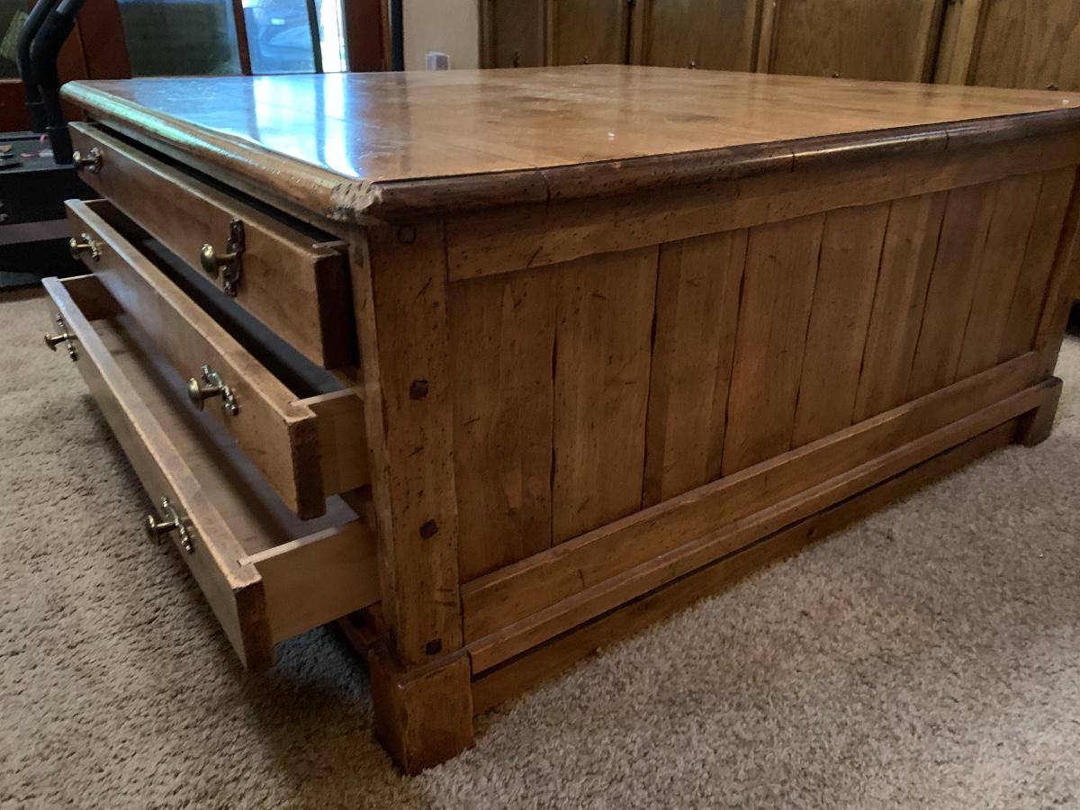 Large Square Coffee Table with 6 small drawers. 41.5” x 41.5” x 18” In great condition, other than one corner of the table. Please refer to picture for damage.