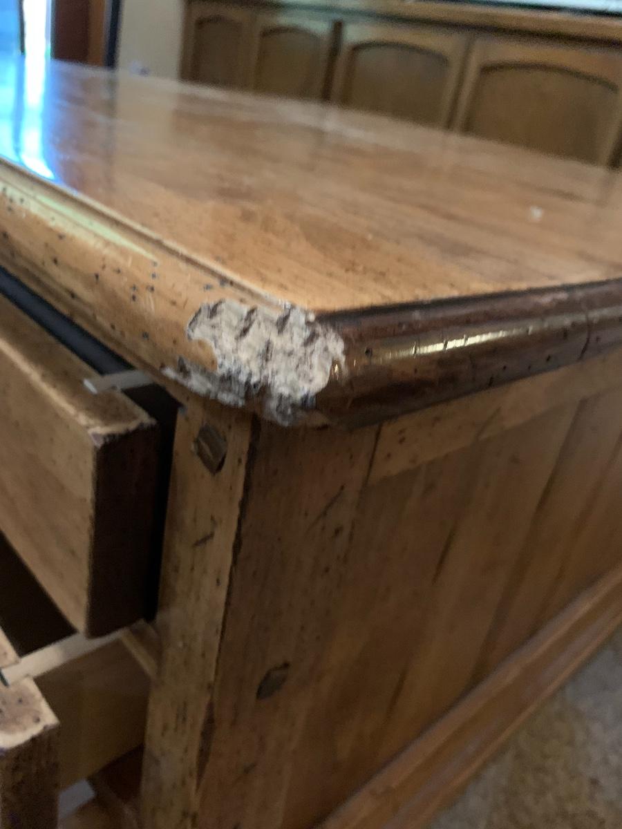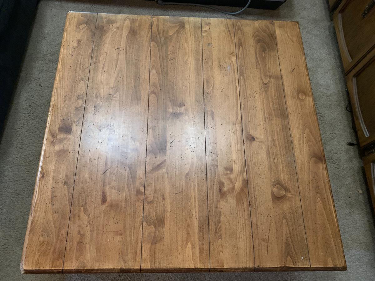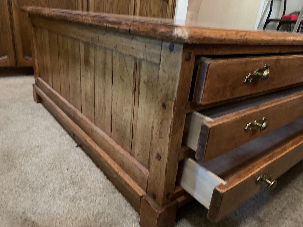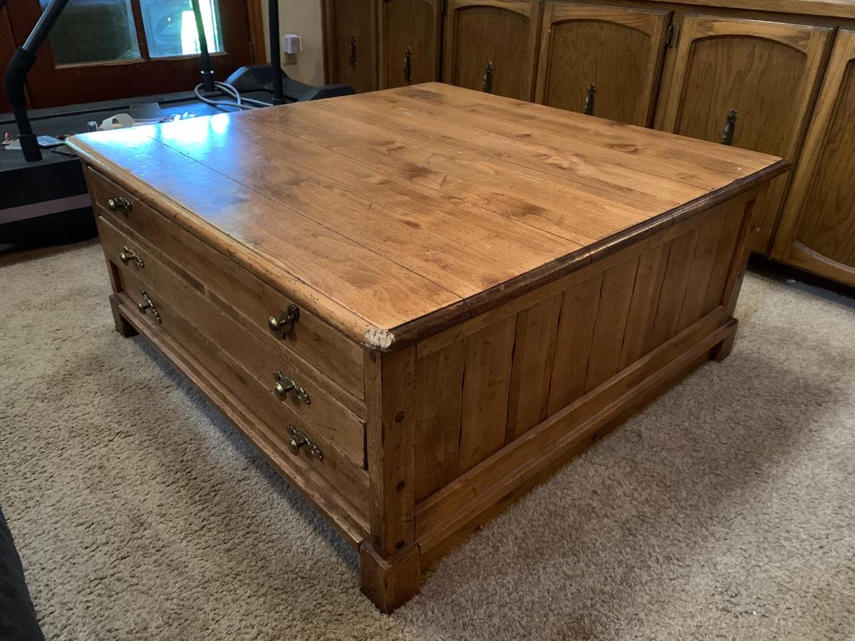 Large Square Coffee Table with 6 small drawers. 41.5” x 41.5” x 18” In great condition, other than one corner of the table. Please refer to picture for damage.