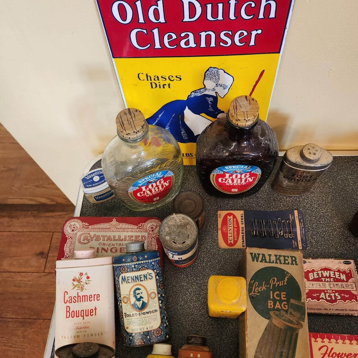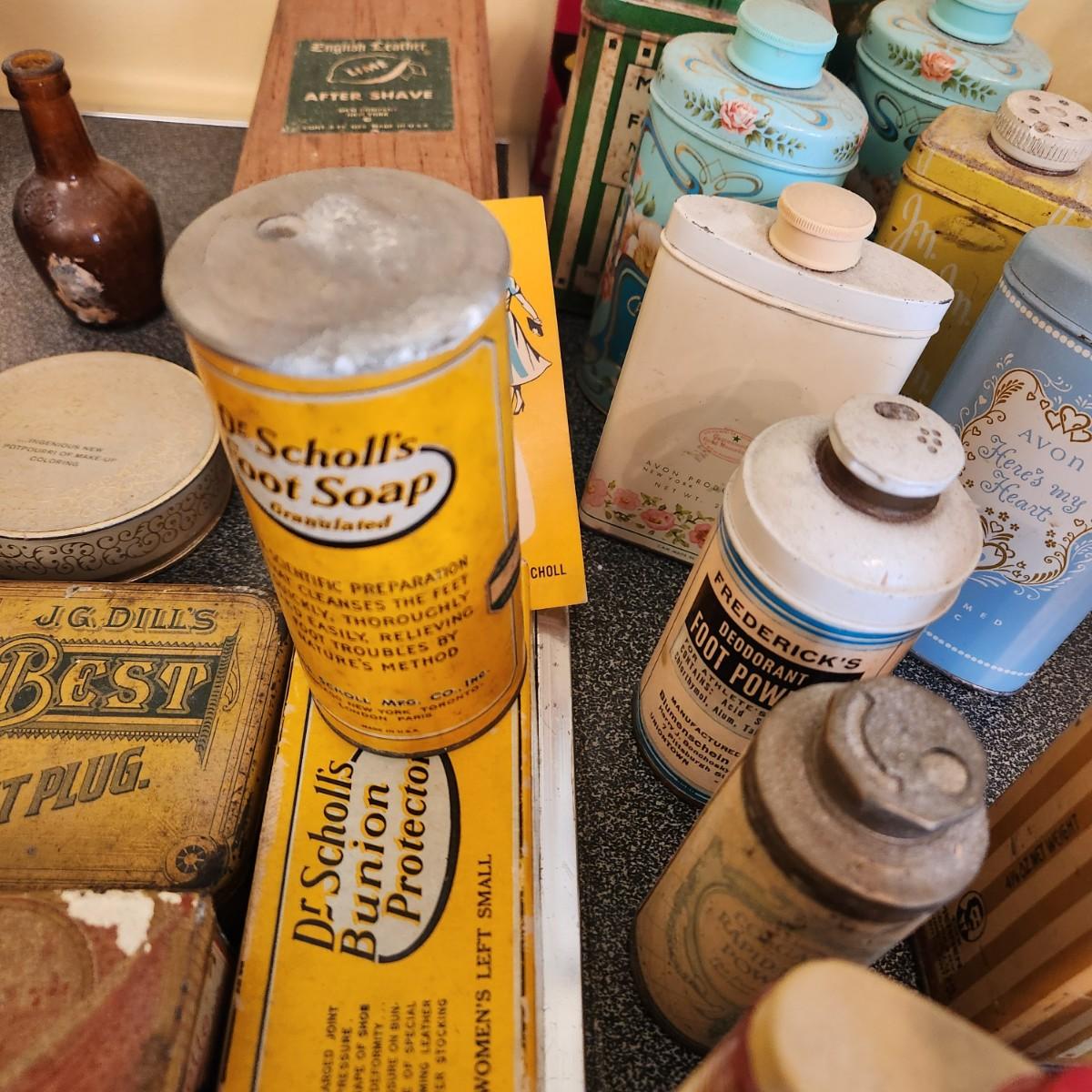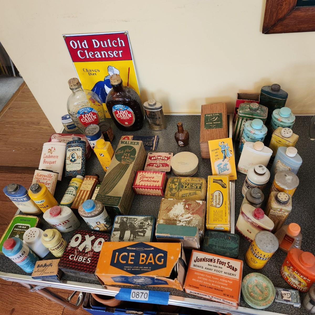 , Large Collectable Lot, Log Cabin, Powders, Ice bags, Dr Scholls , Ginger, Mennen's and More