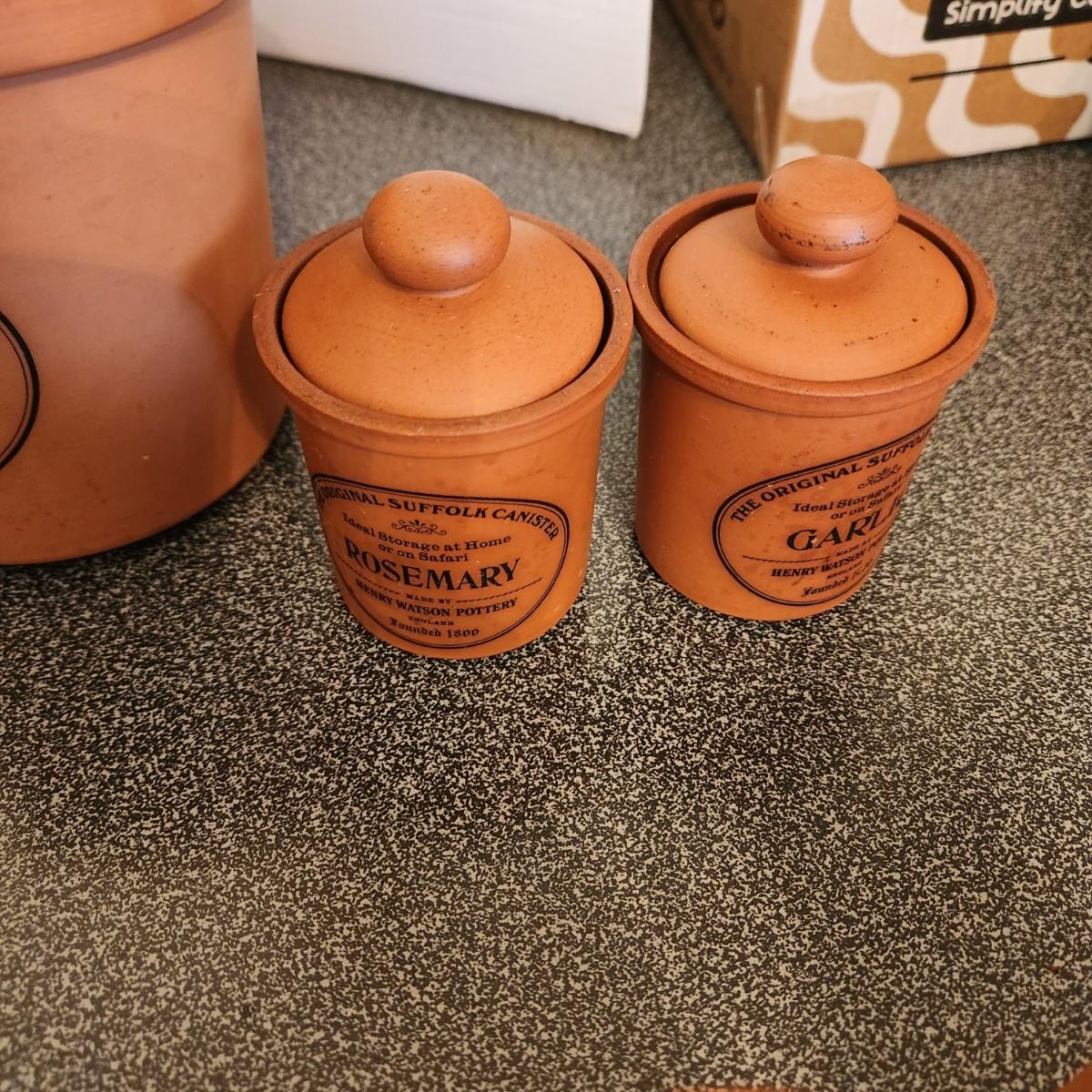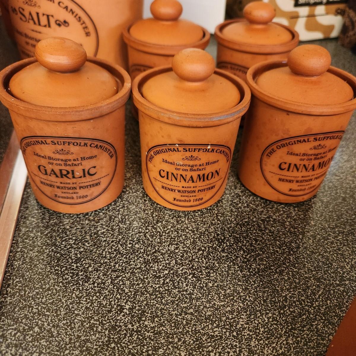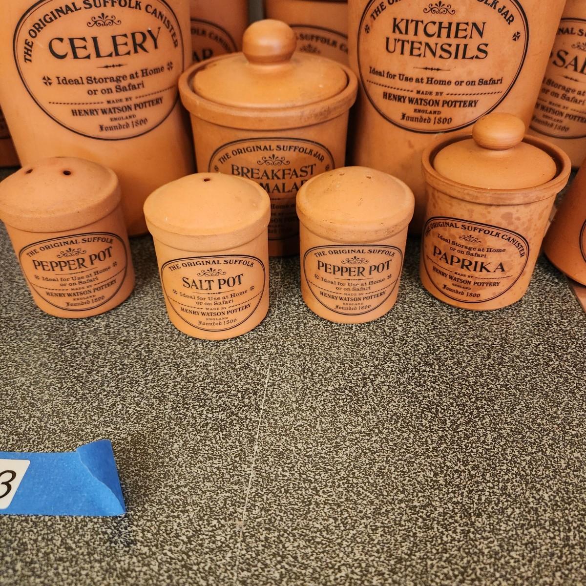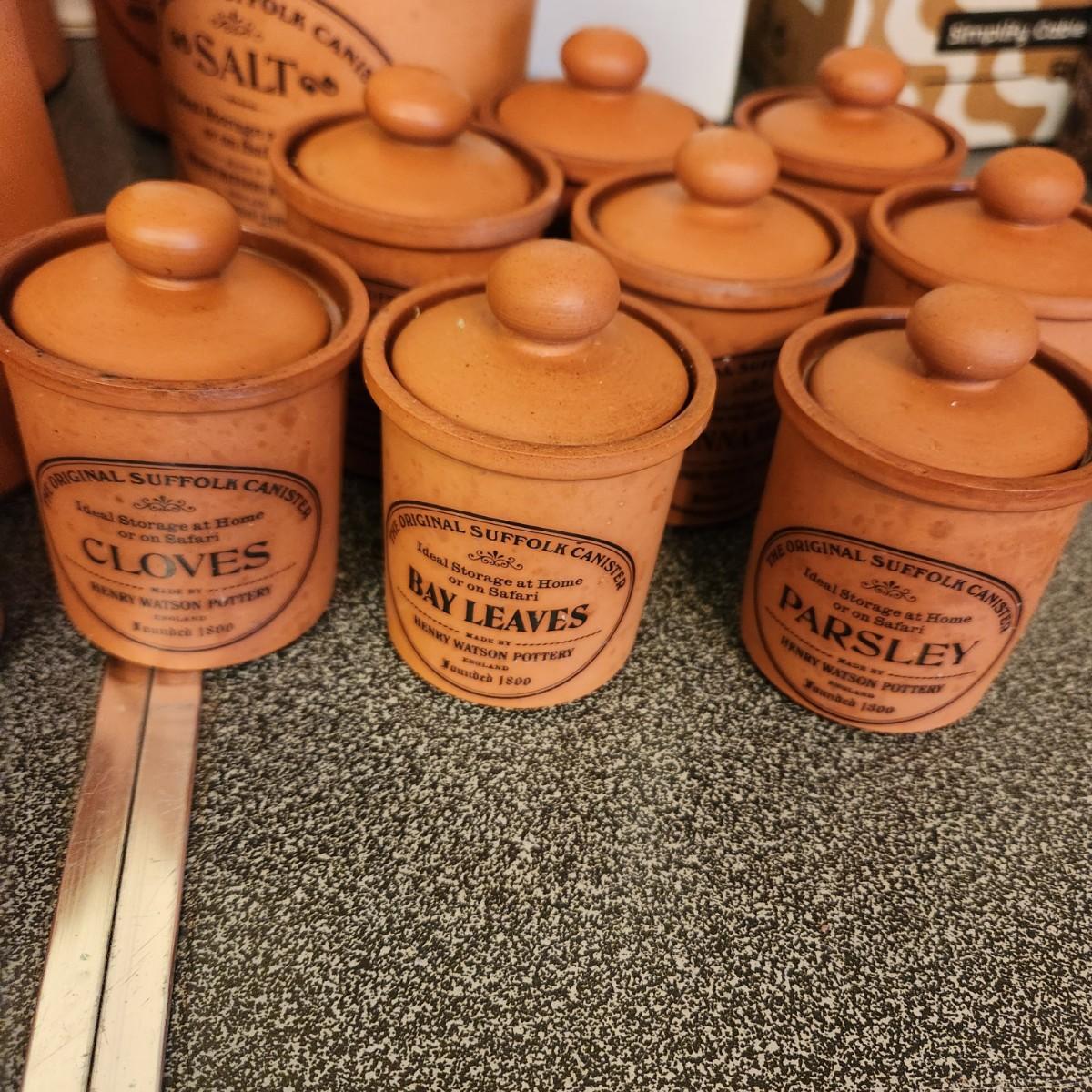 Large collection Henry Watson Pottery Terracotta Spices Flour Sugar Tea Salt Pepper