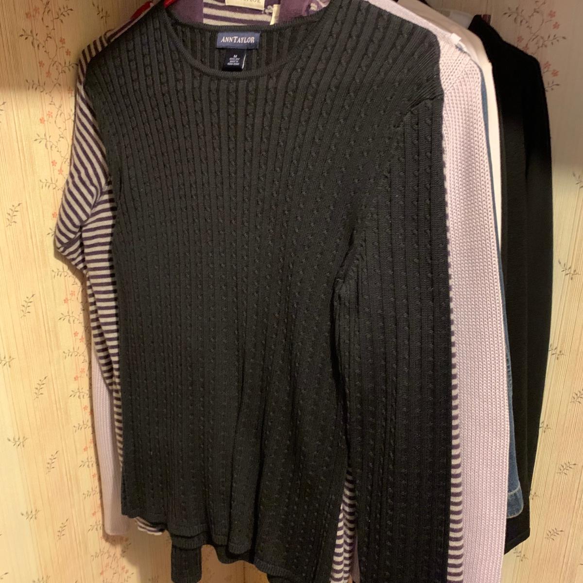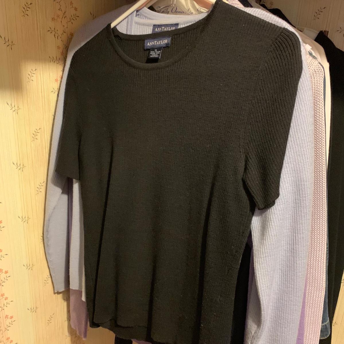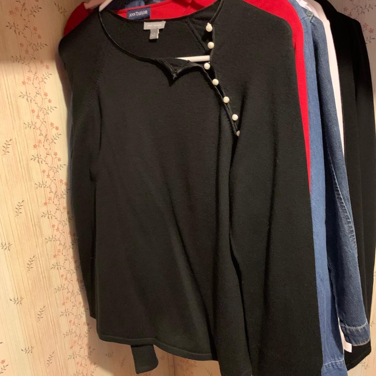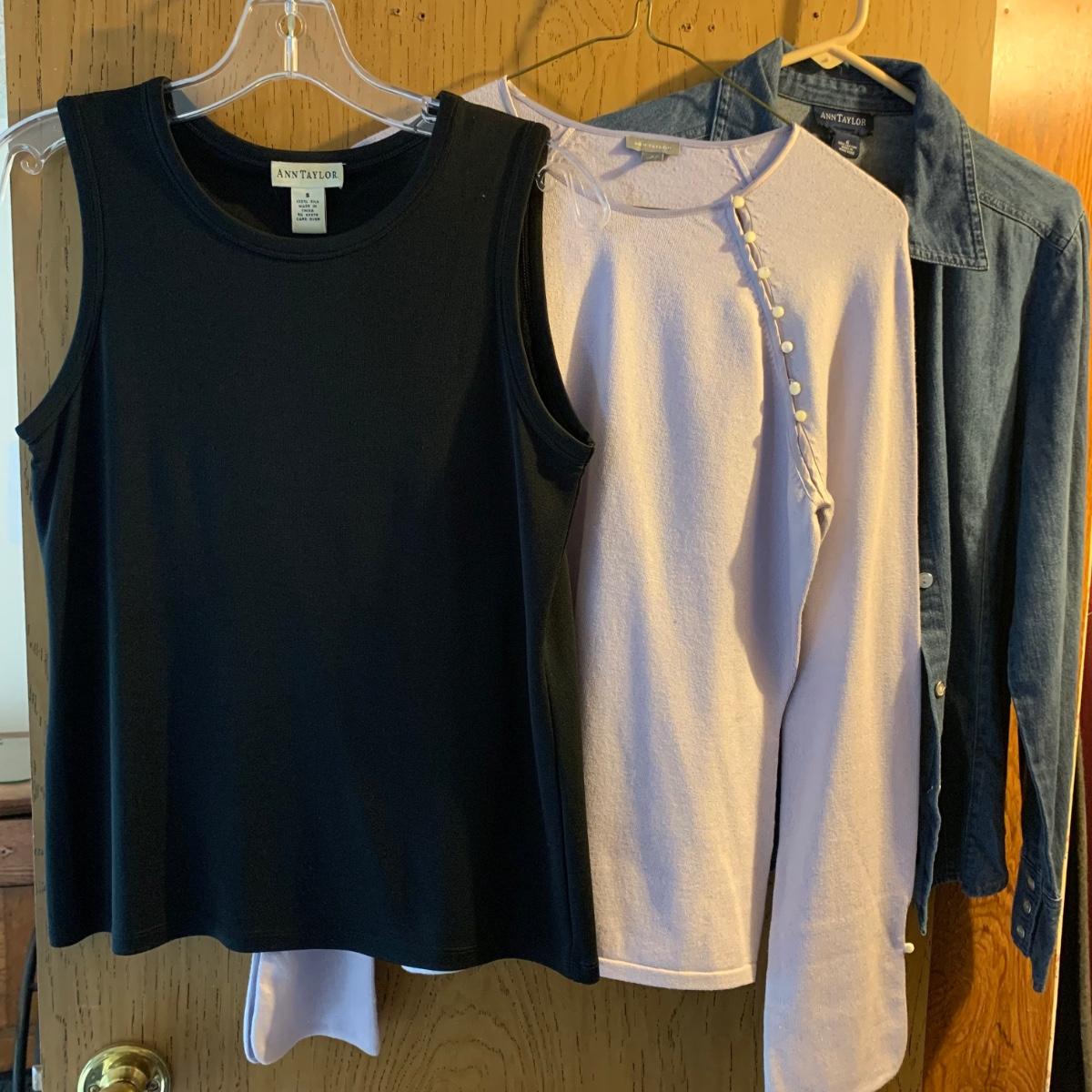 More than 40 Ann Taylor tops. Most long sleeved, a few short sleeved or sleeveless. Some 100% Italian Merino wool sweaters. Some 100% silk. Some 100% linen. Some 100% cotton. Some denim shirts. A few shirt/sweater sets. A handful of white and black cotton knit tops. One velvet button down. And more! See photos for the entire collection. Nearly everything is in excellent condition. A small stain is seen on one of the white cotton tops and a small hole was found on the sleeve one of the merino wool sweaters (see pictures). Local pickup only.