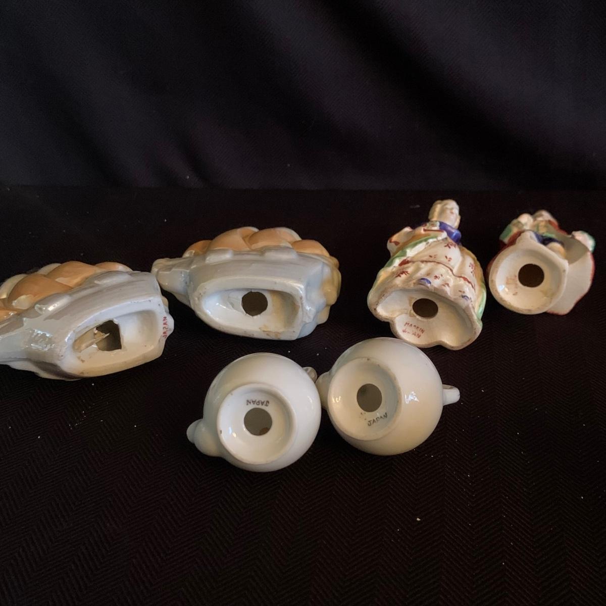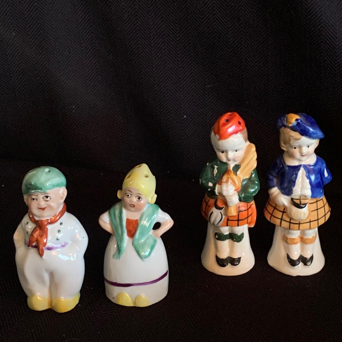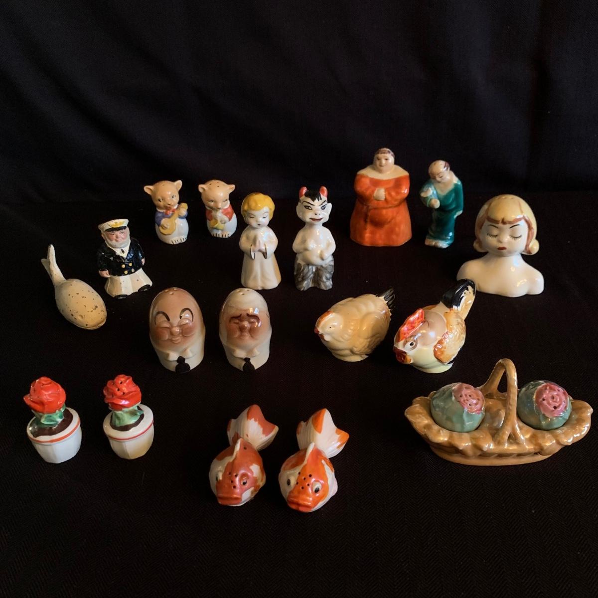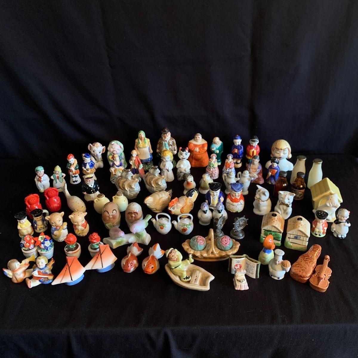 A collection of over 40 sets of unique and antique salt and pepper shakers. The majority are ceramic, though there are some glass and metal as well. They do not all have stoppers. Two do not have their mates; one of these has broken and been repaired. The neck of the violin is broken off but could be glued back on. The tallest set is a man and woman that are in the back of the picture showing the entire inventory; they are about 5” tall. Please see photos for inventory and details.