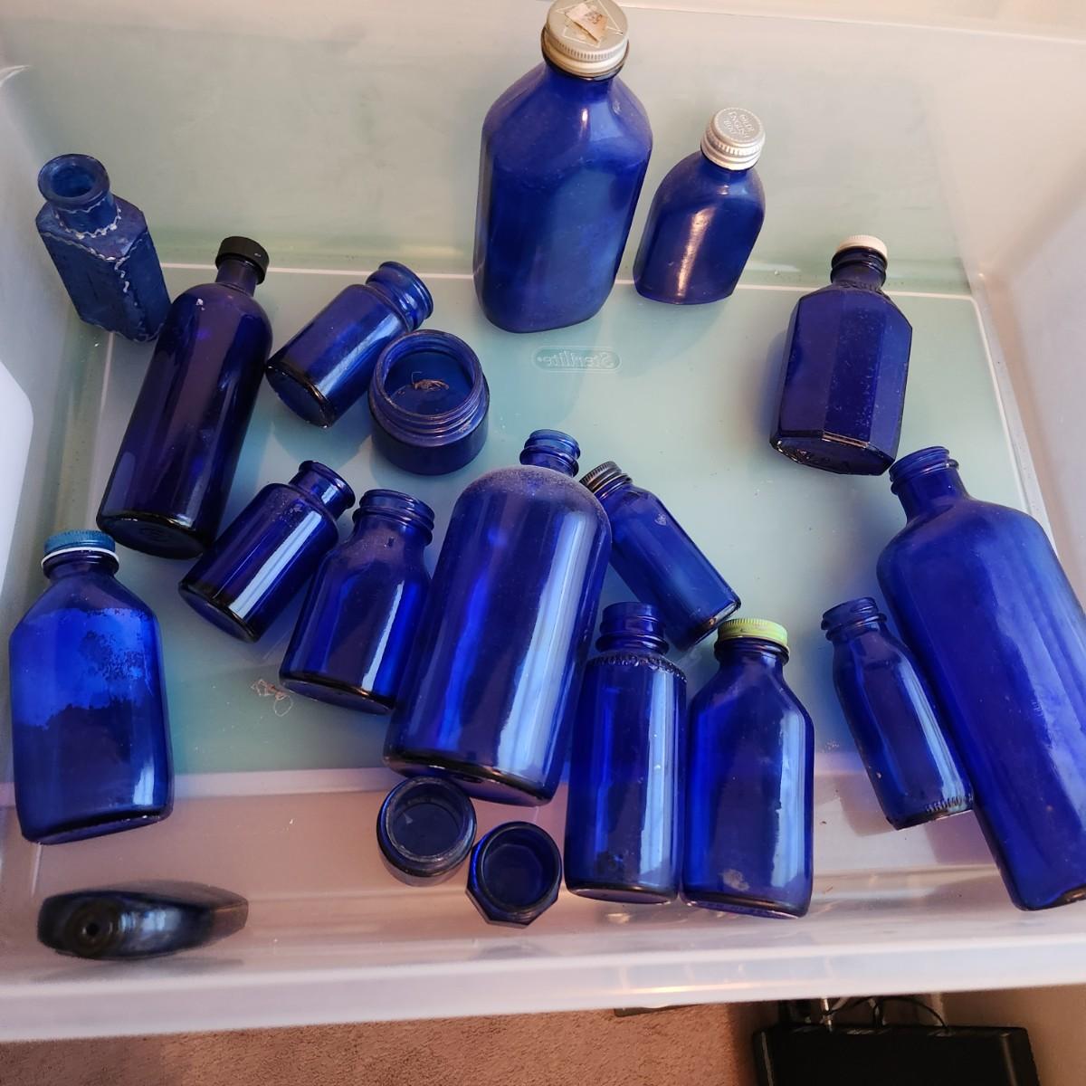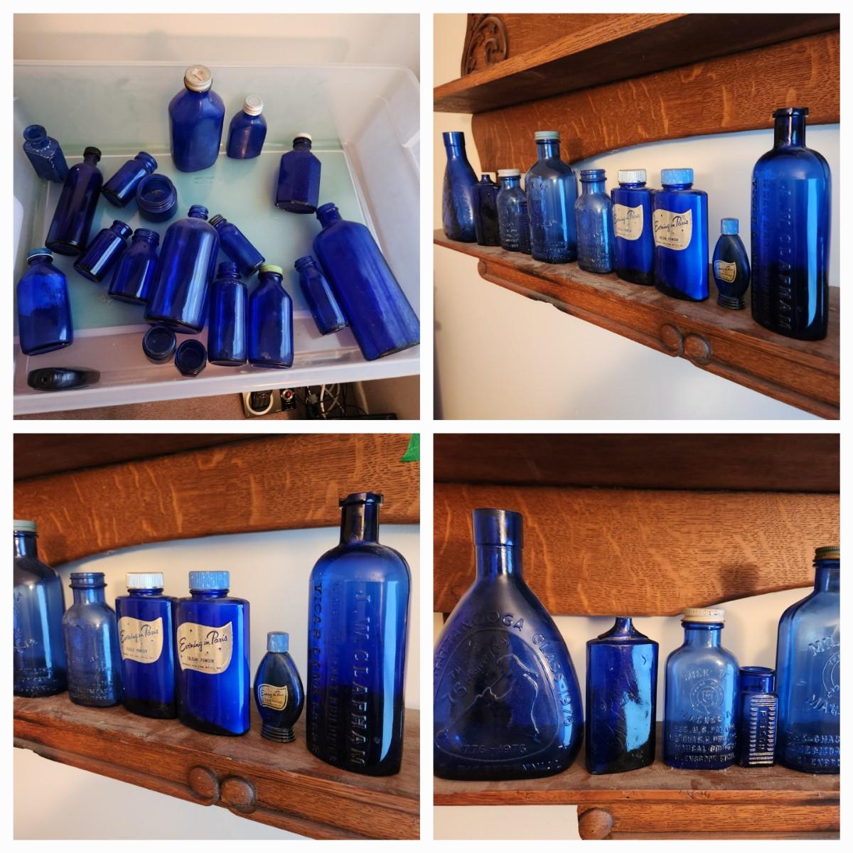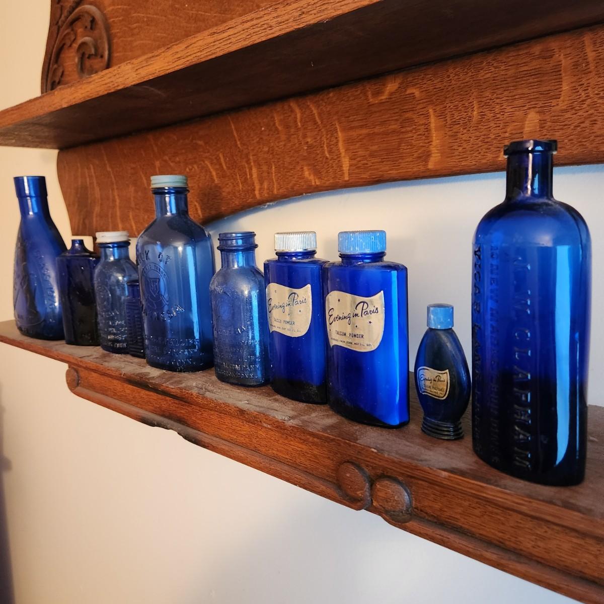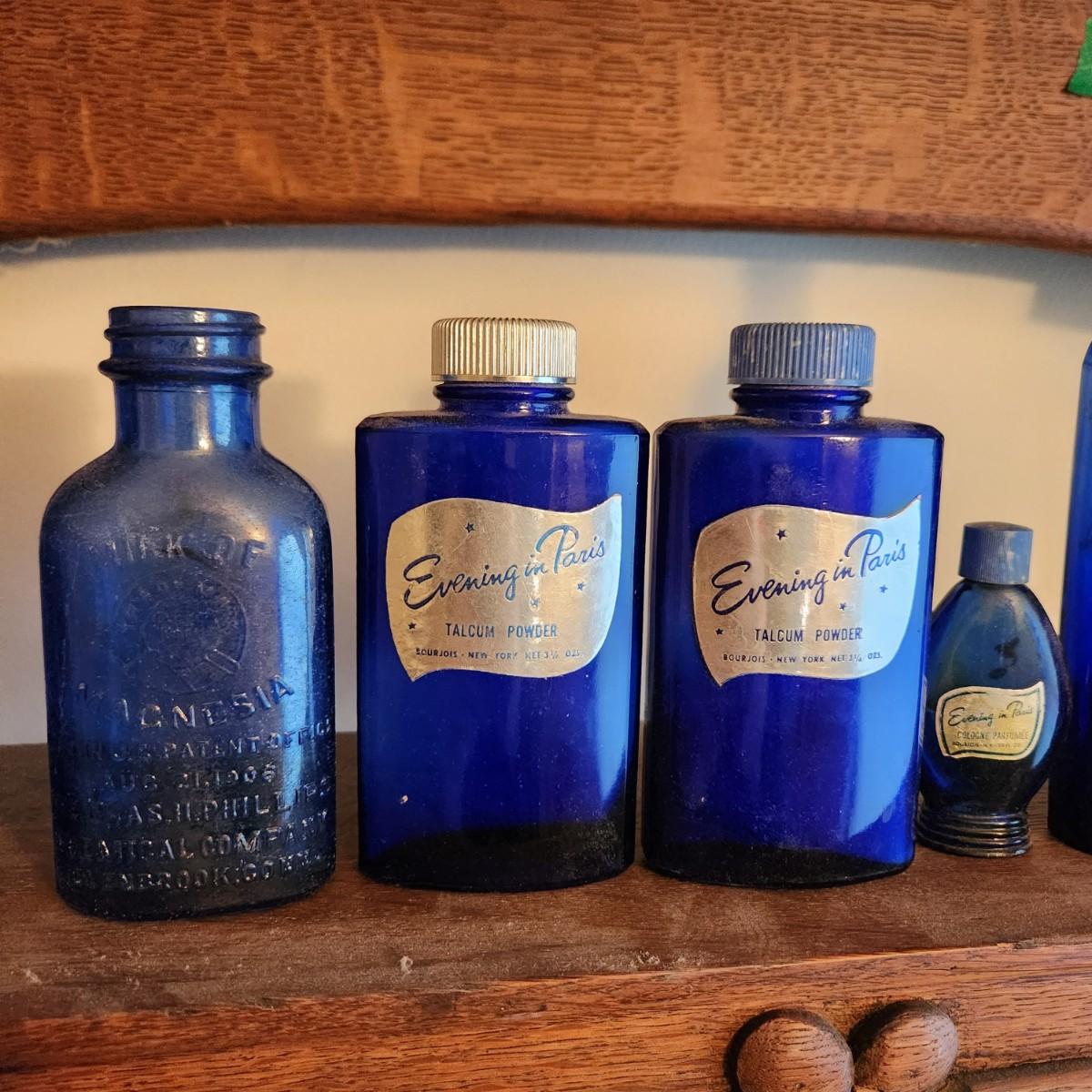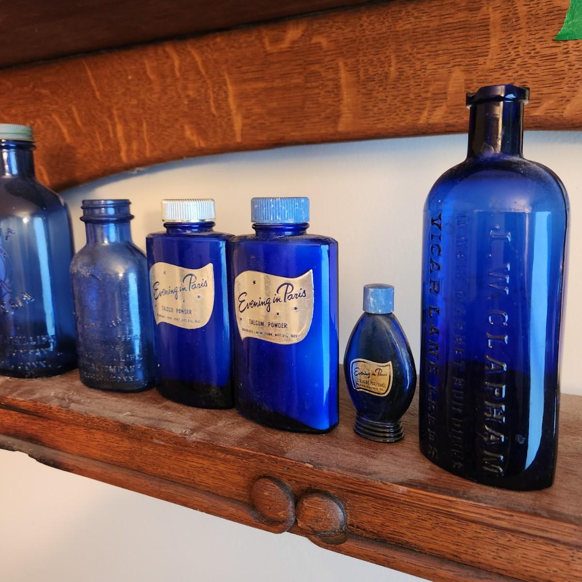 Large Collection of Cobalt Blue Apothecary Bottles Poison, J W Clapham Evening in Paris (1 of 2)