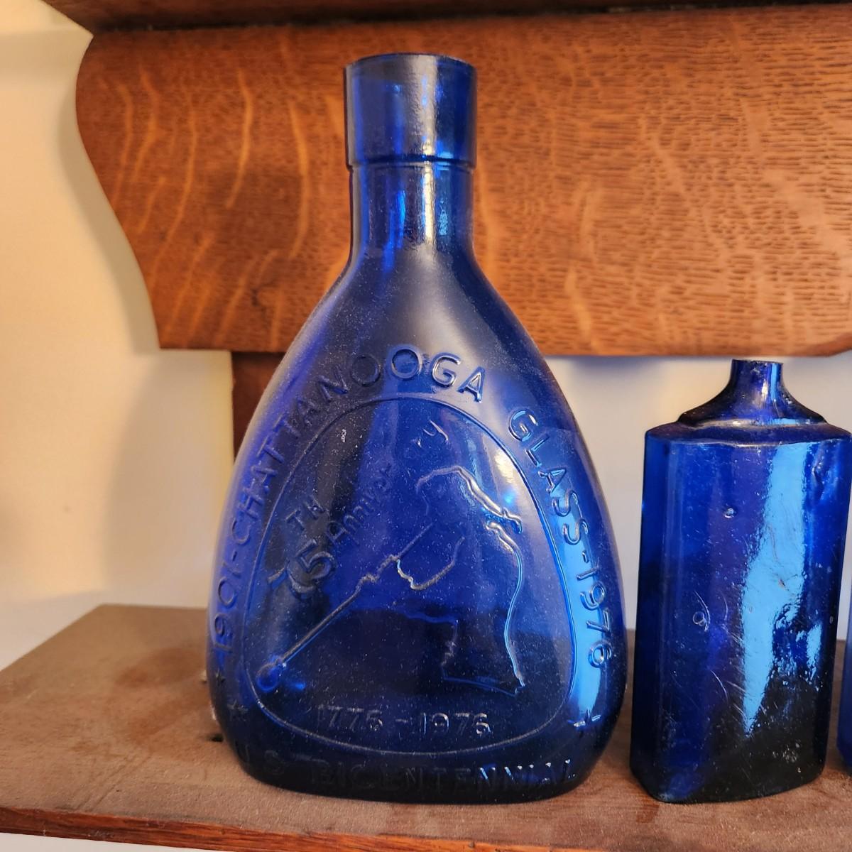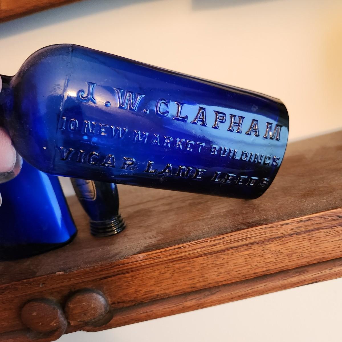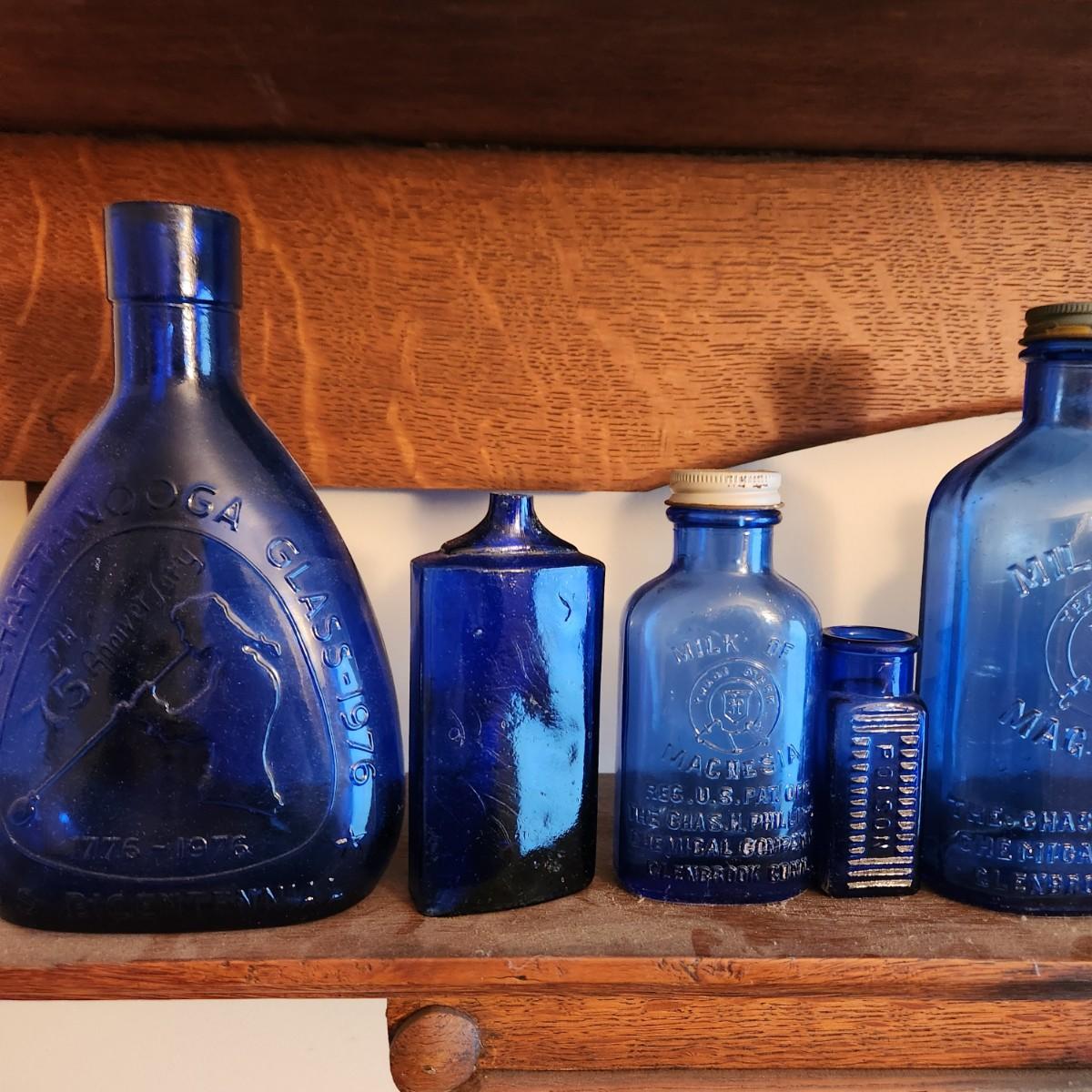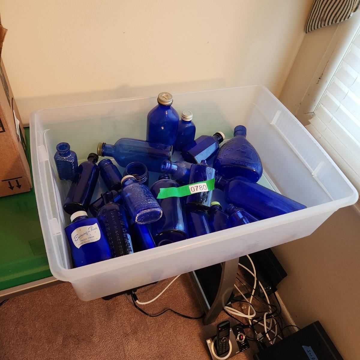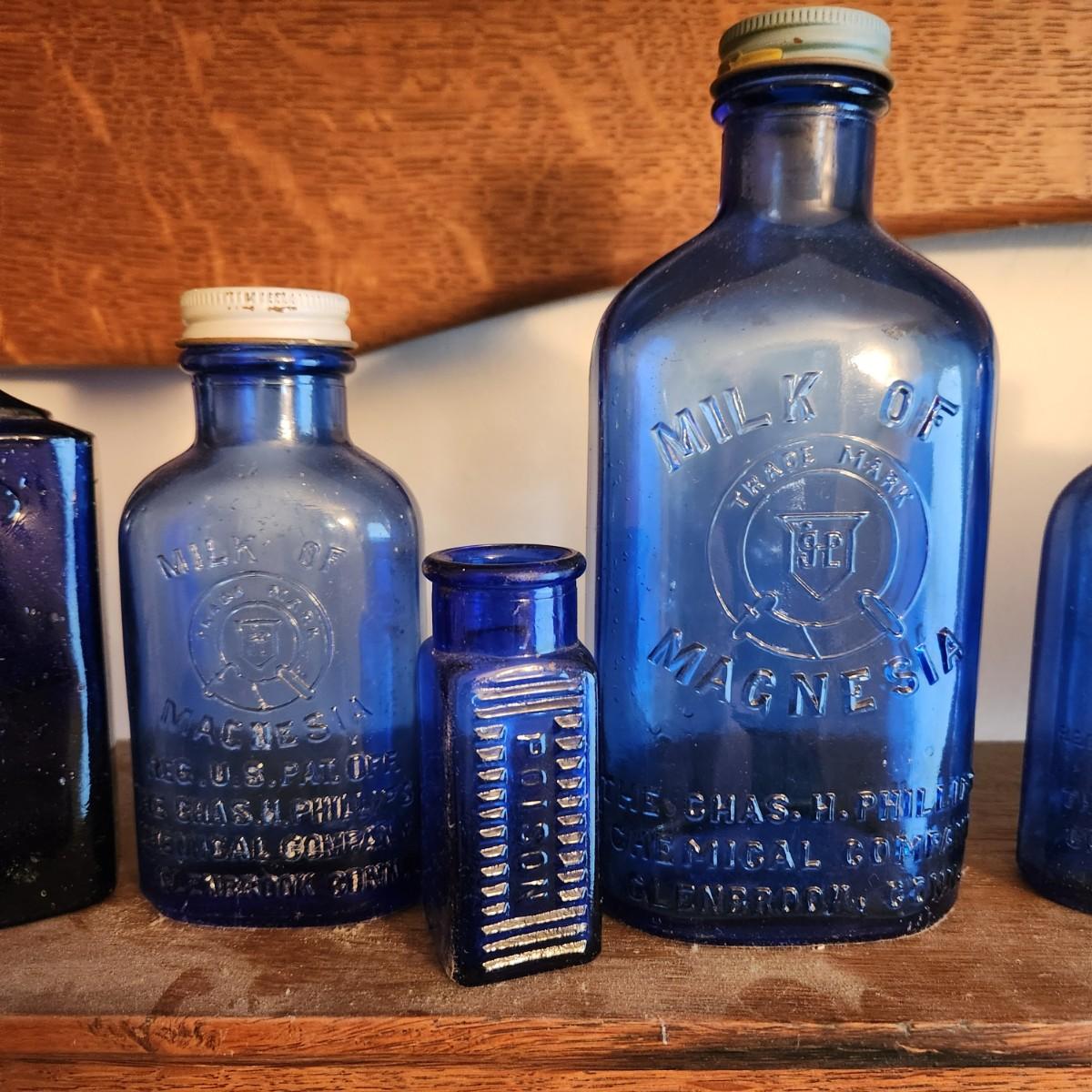 Large Collection of Cobalt Blue Apothecary Bottles Poison, J W Clapham Evening in Paris (1 of 2)