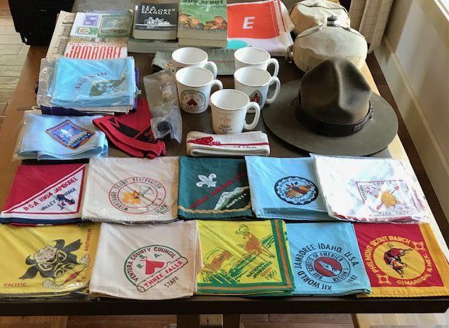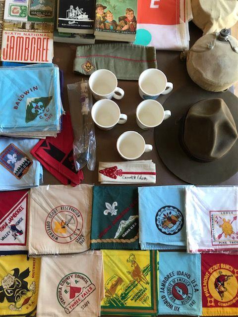 Stetson Scout Master hat (small nick on brim), canteen, mess kit, coffee mugs, many neckerchiefs, and books.