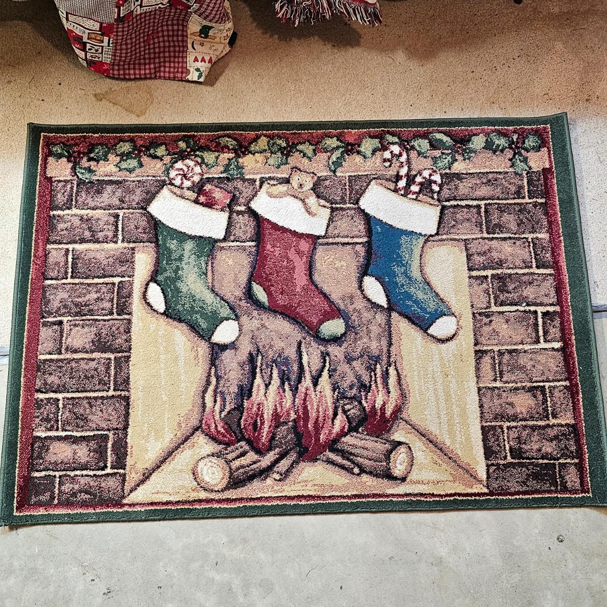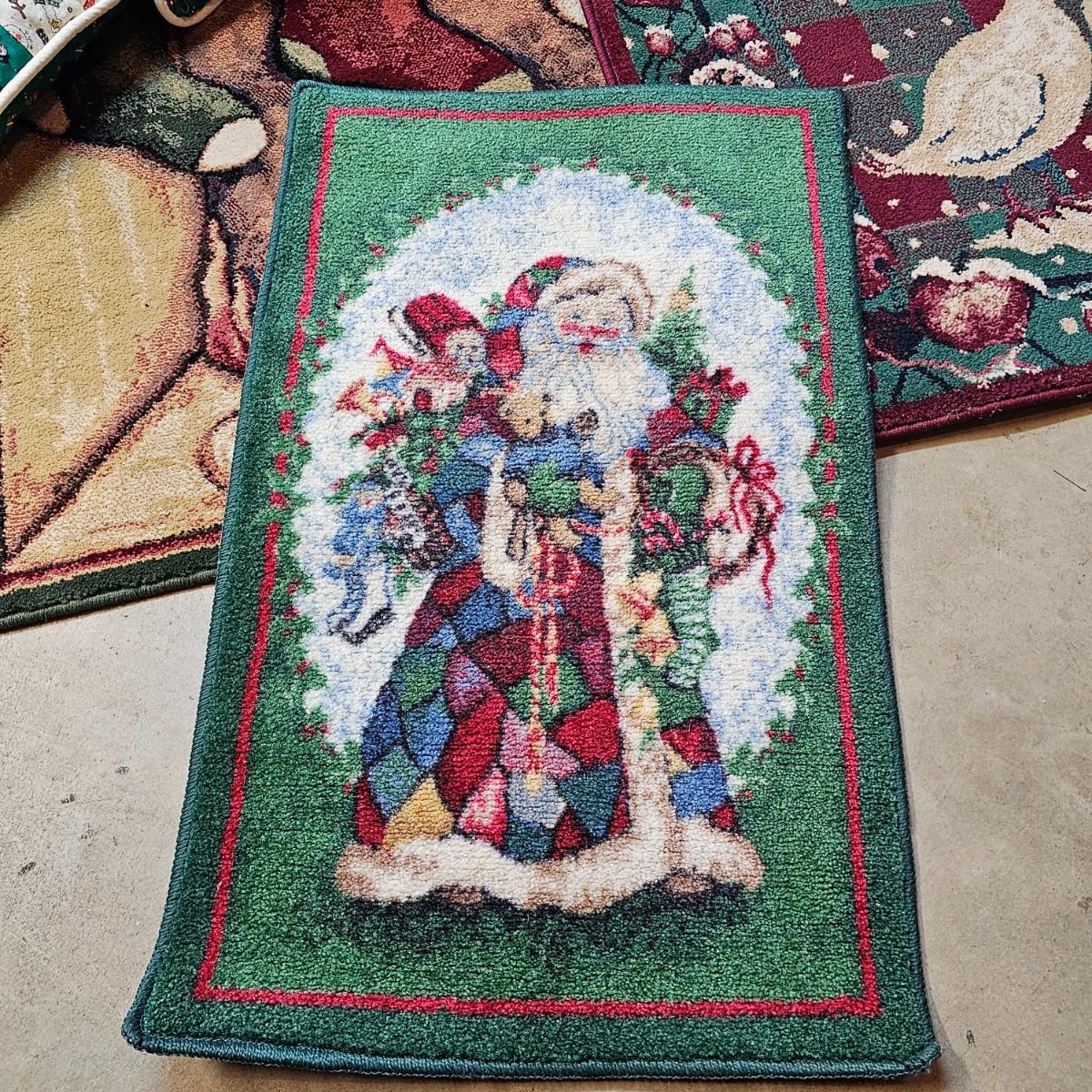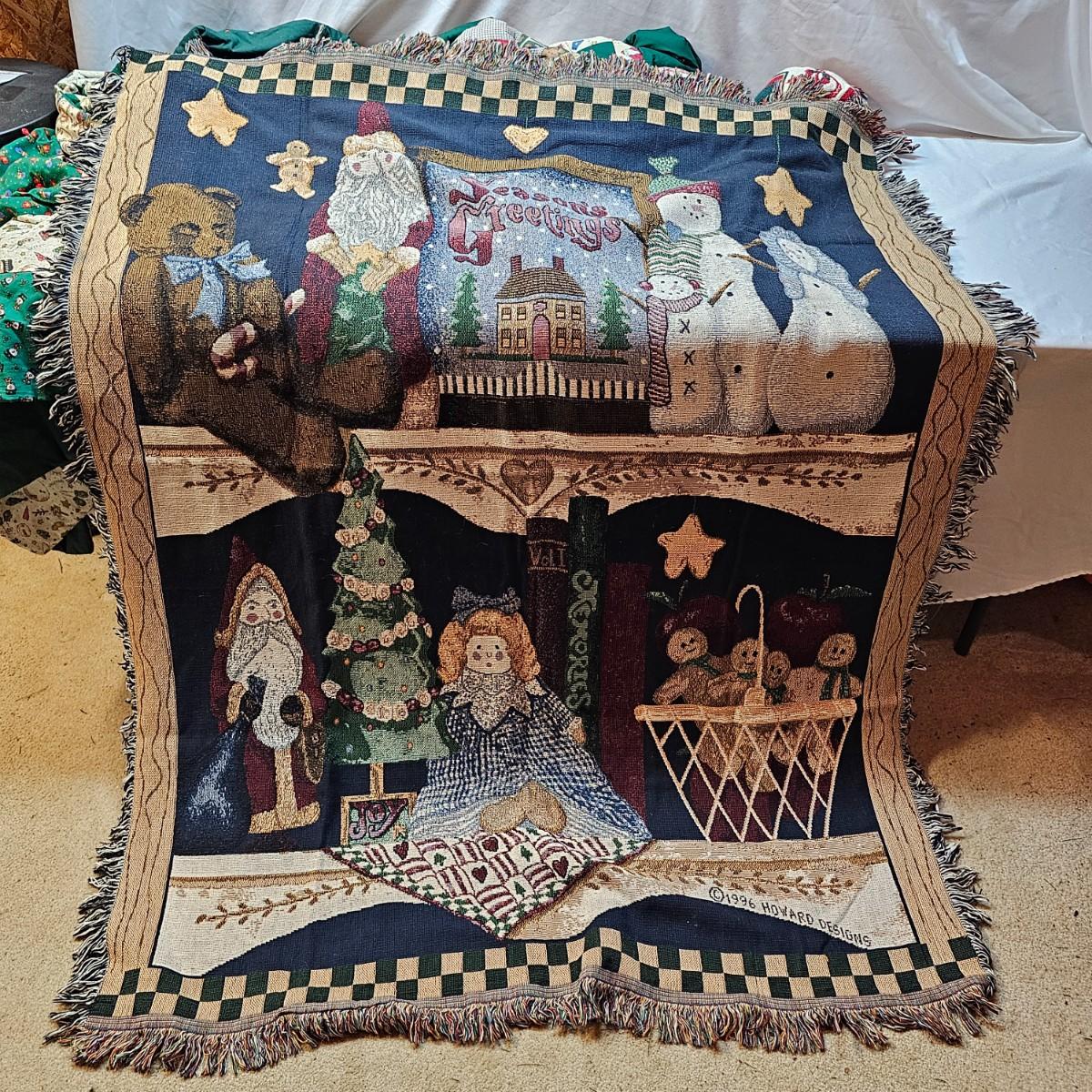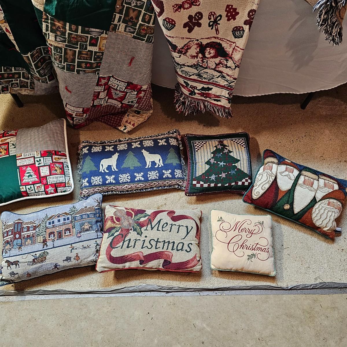 Plenty of fun items to use about the house. Joyful entry rugs, pillows and throws for furniture, tree skirts, placemats, Santa & Mrs. Claus table sitters, more. Two patchwork quilts, one 72" x 90", one 66" x 80". Two large rugs are 39" x 56", others run from 19" x 27" to 22" x 36. Includes storage bins. See photos for details. Local pickup only.