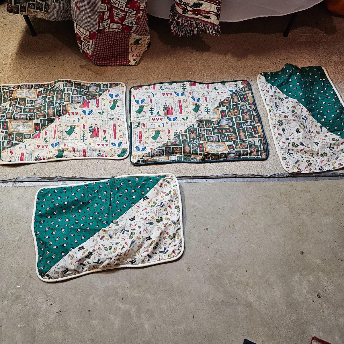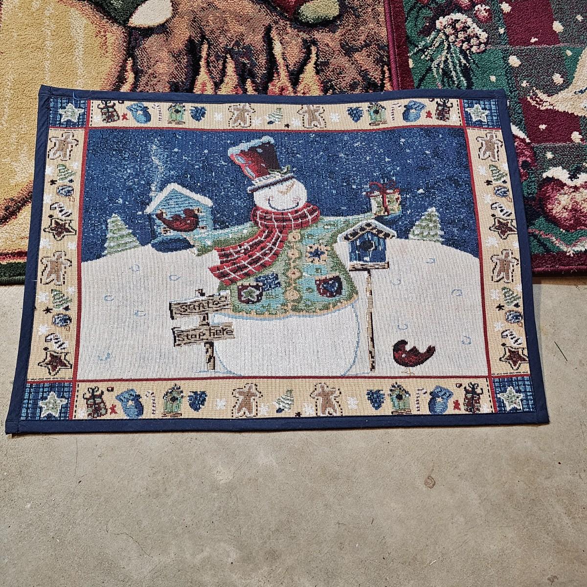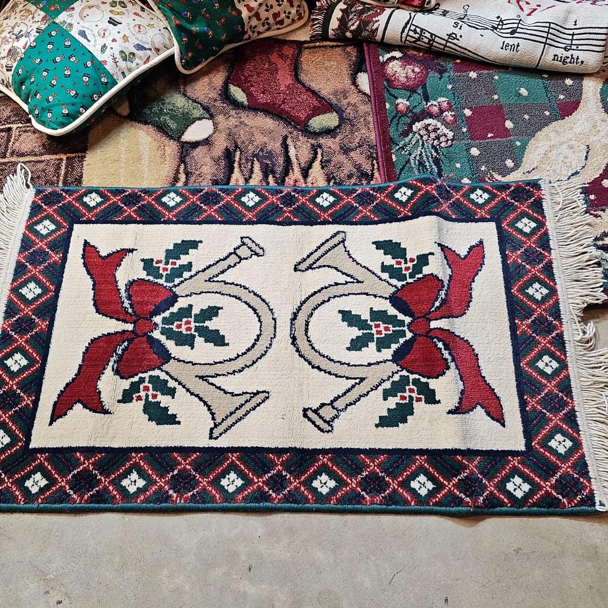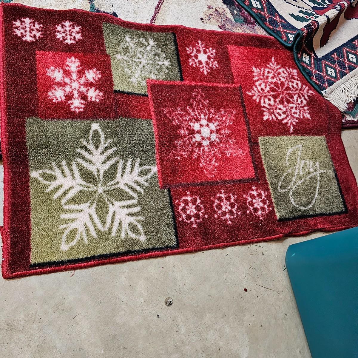 Plenty of fun items to use about the house. Joyful entry rugs, pillows and throws for furniture, tree skirts, placemats, Santa & Mrs. Claus table sitters, more. Two patchwork quilts, one 72" x 90", one 66" x 80". Two large rugs are 39" x 56", others run from 19" x 27" to 22" x 36. Includes storage bins. See photos for details. Local pickup only.
