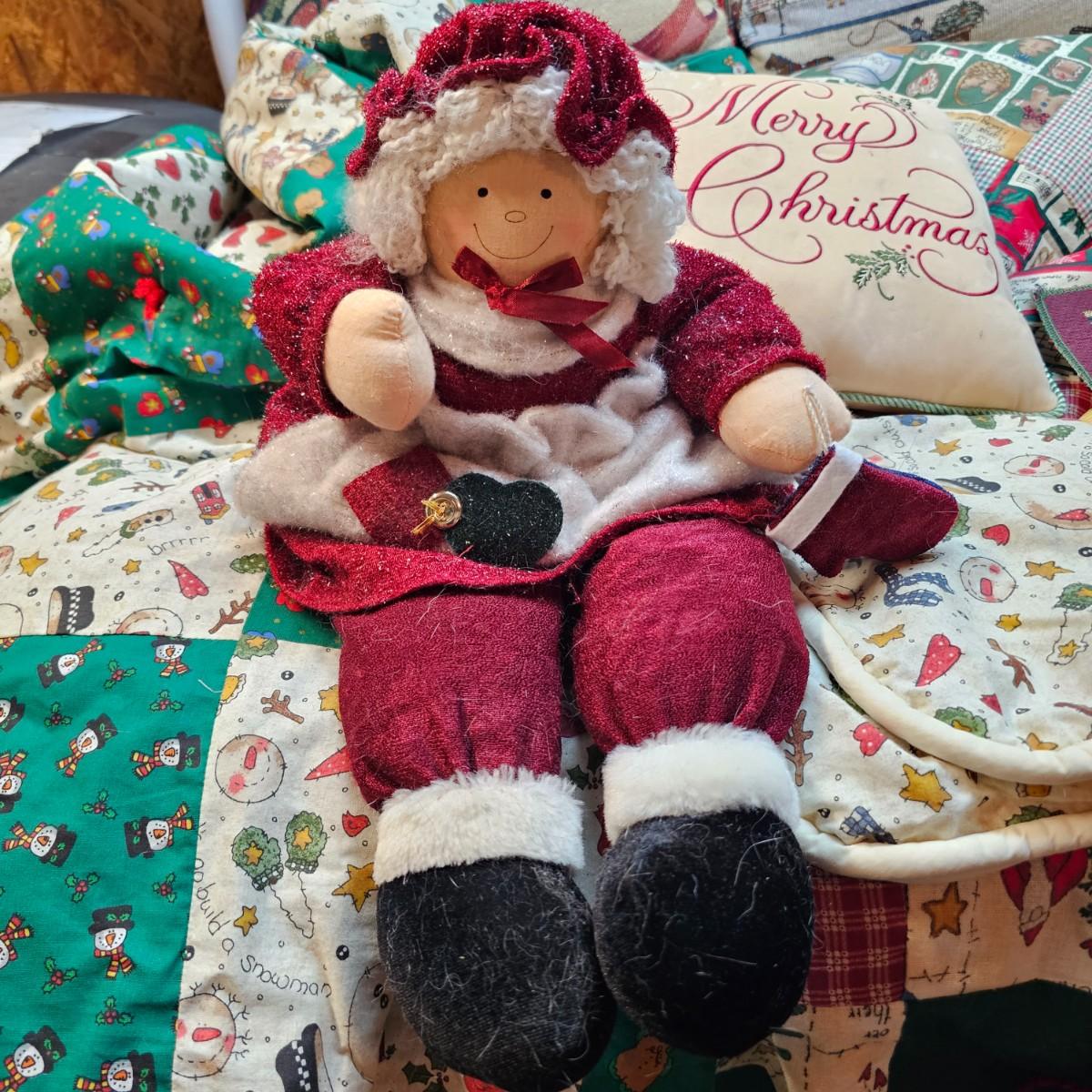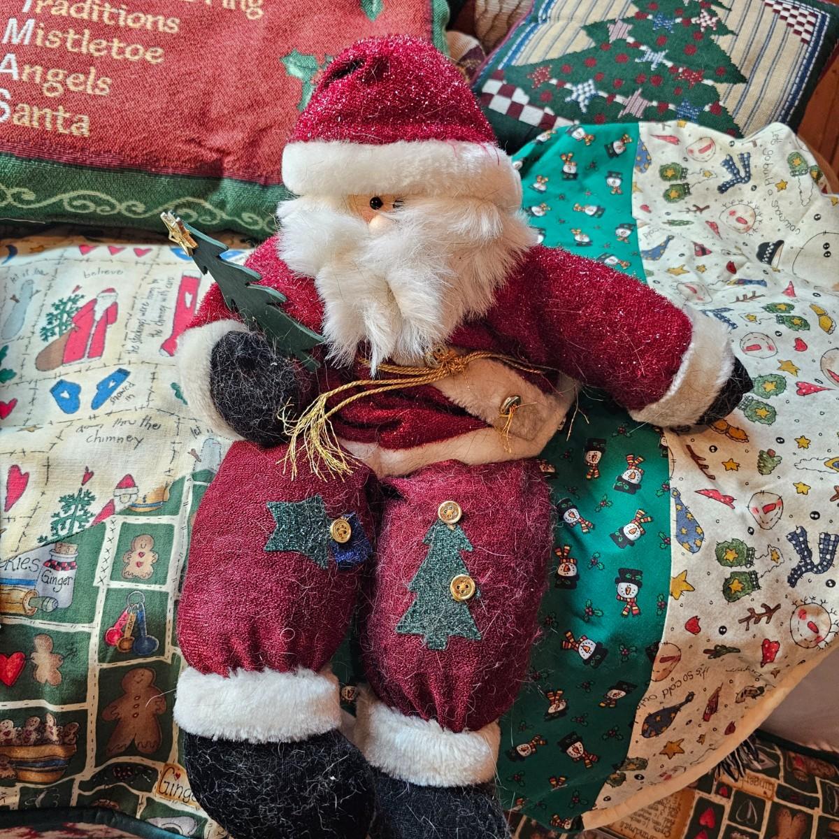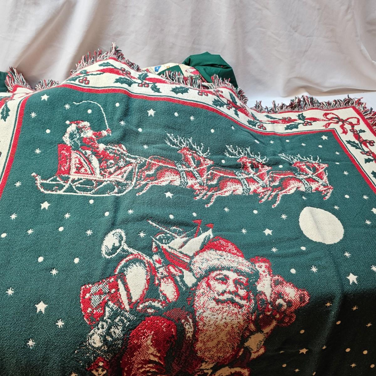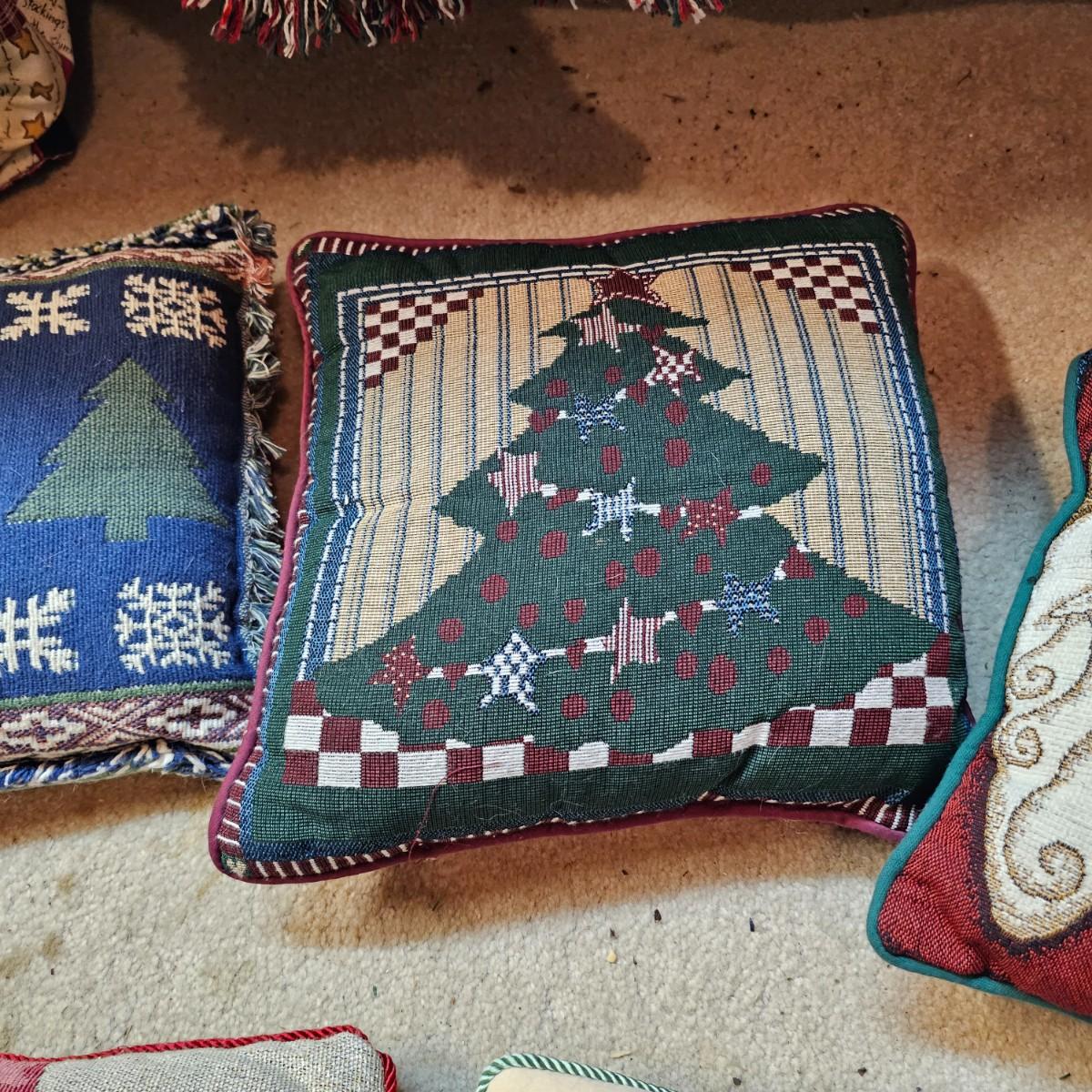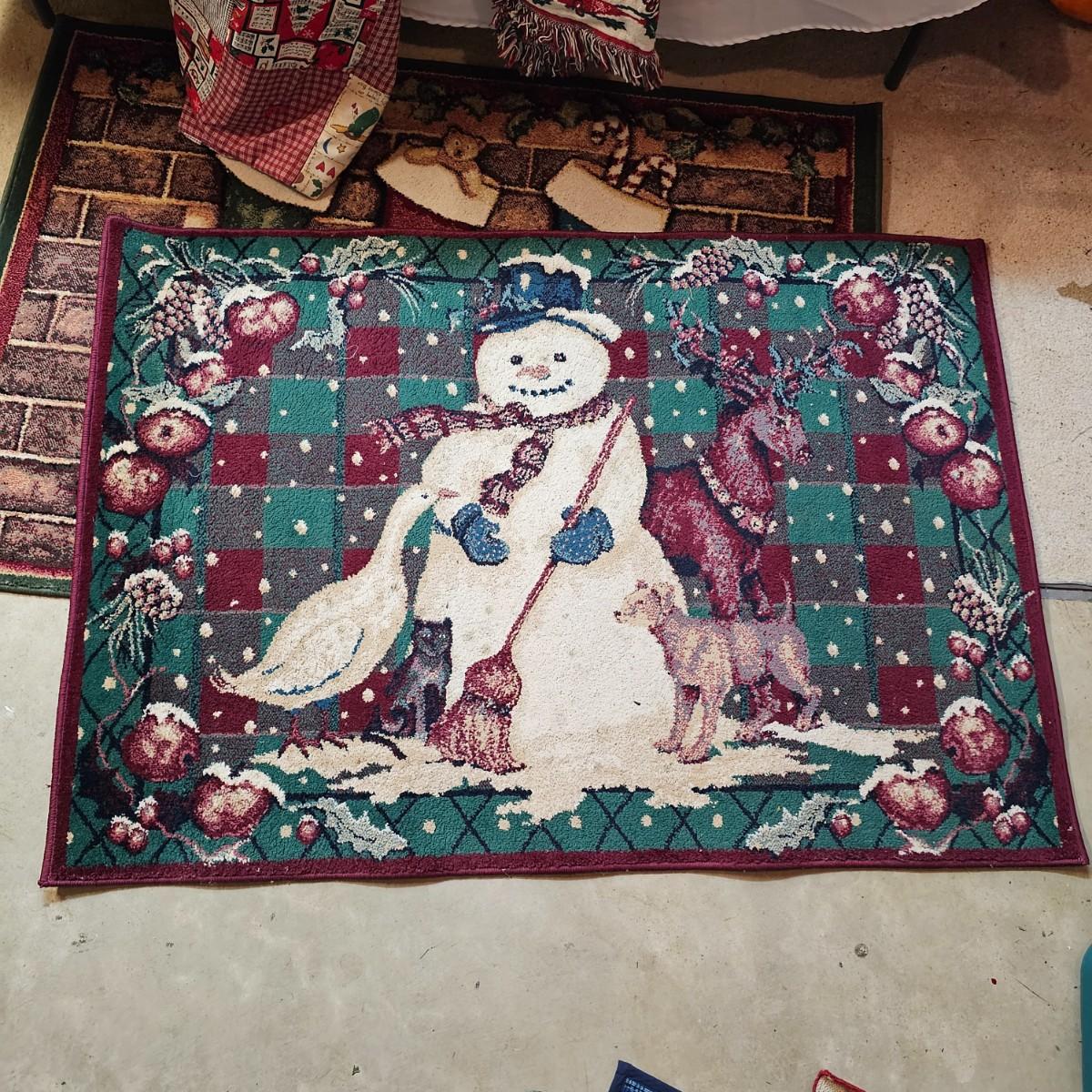 Plenty of fun items to use about the house. Joyful entry rugs, pillows and throws for furniture, tree skirts, placemats, Santa & Mrs. Claus table sitters, more. Two patchwork quilts, one 72" x 90", one 66" x 80". Two large rugs are 39" x 56", others run from 19" x 27" to 22" x 36. Includes storage bins. See photos for details. Local pickup only.