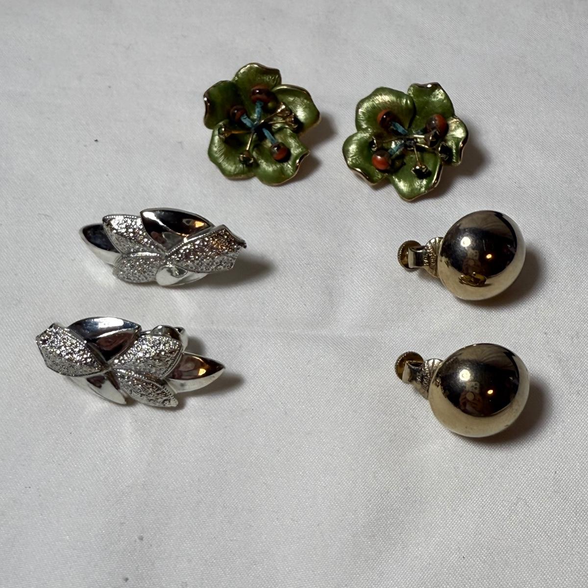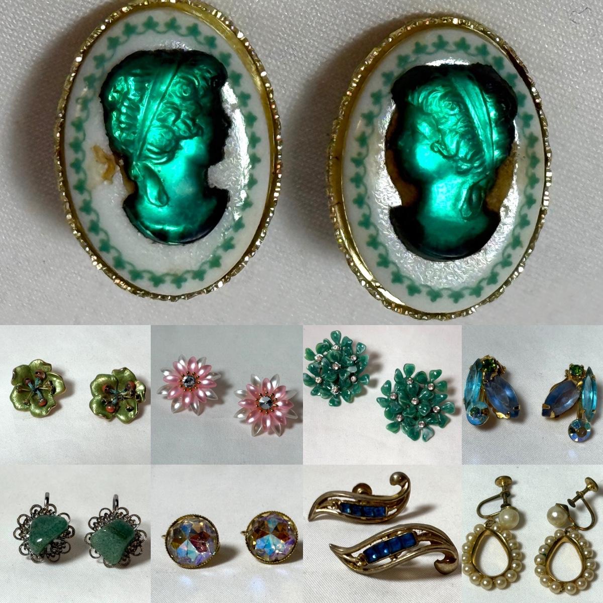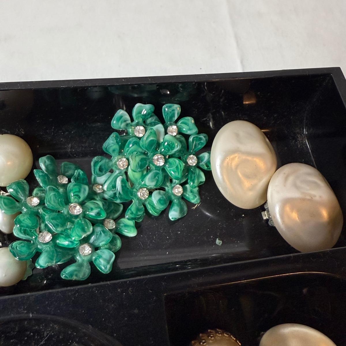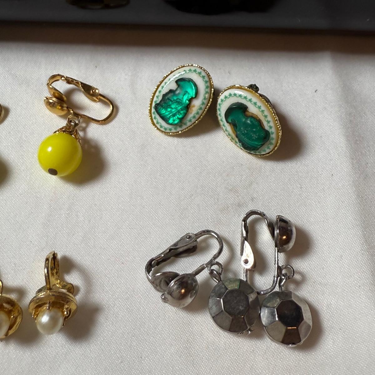 50+ pairs of earrings for non-pierced ears, with clip-on style of screw backs. There is a big variety of shapes, colors, and sizes. One pair comes with many colors of changeable discs. All earrings were checked for hallmarks, all found marks were photographed. The largest earrings are the pair with multiple green flowers with clear gemstones; these are approximately 1.75“D. 13.5” x 9.25” plastic organizing tray is included as well.